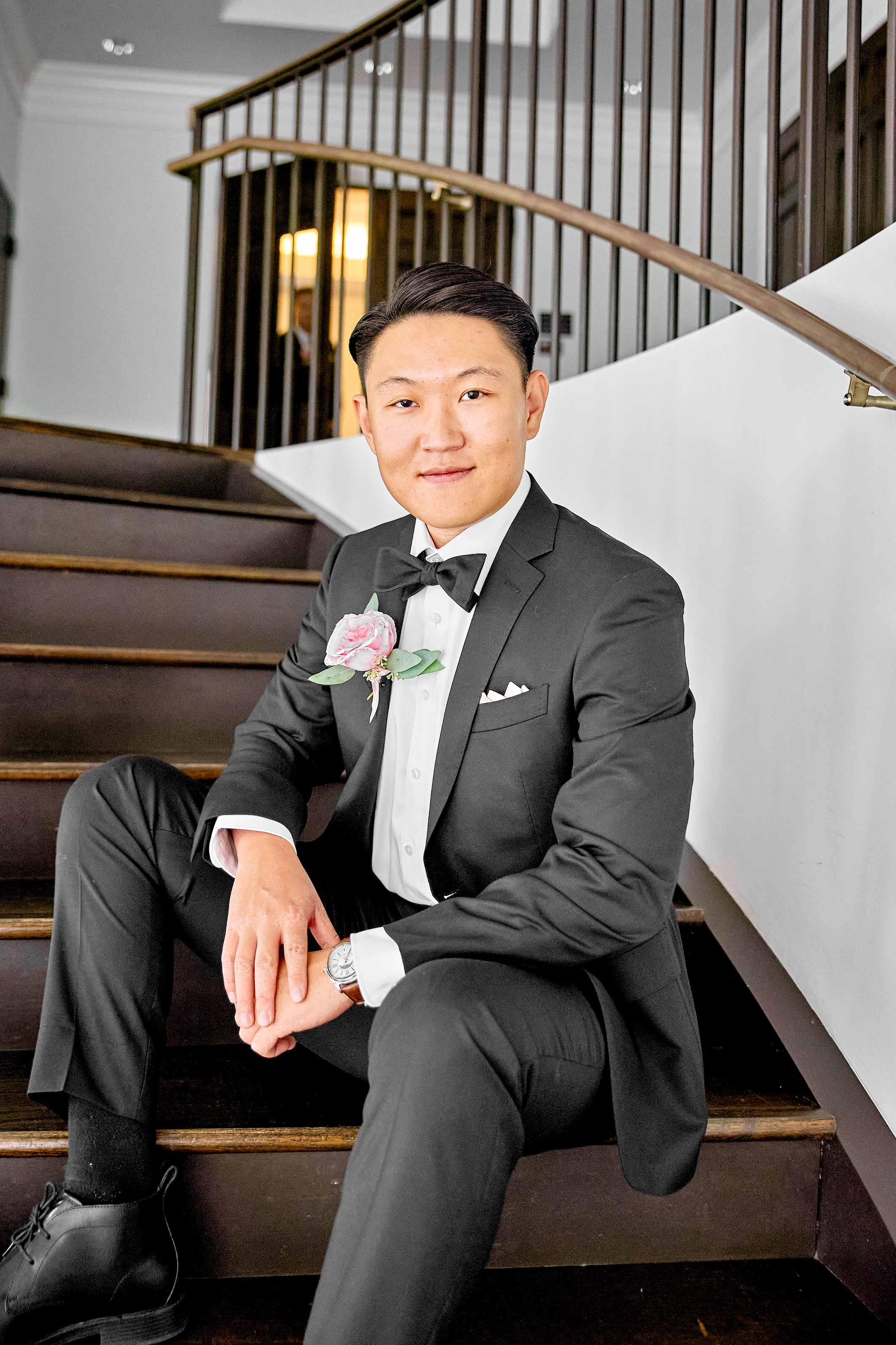 Meanwhile, Drew and his groomsmen were getting ready in their suite, sharing laughs and enjoying the camaraderie of the morning. Drew looked dashing in his two-piece black wedding suit, paired with a crisp white formal shirt, shiny black shoes, a black silk bowtie, and a pink rose boutonniere. The groomsmen, dressed in stylish black suits, complemented the groom perfectly. The groomsmen portraits captured the fun and lighthearted moments shared before the ceremony, reflecting the strong bond between Drew and his closest friends.