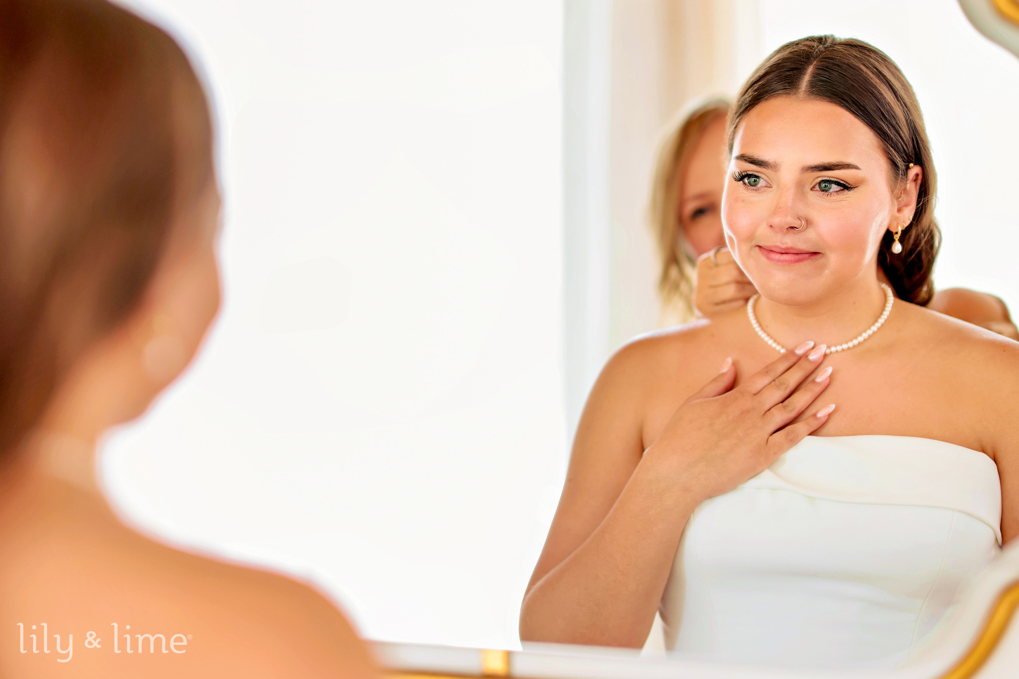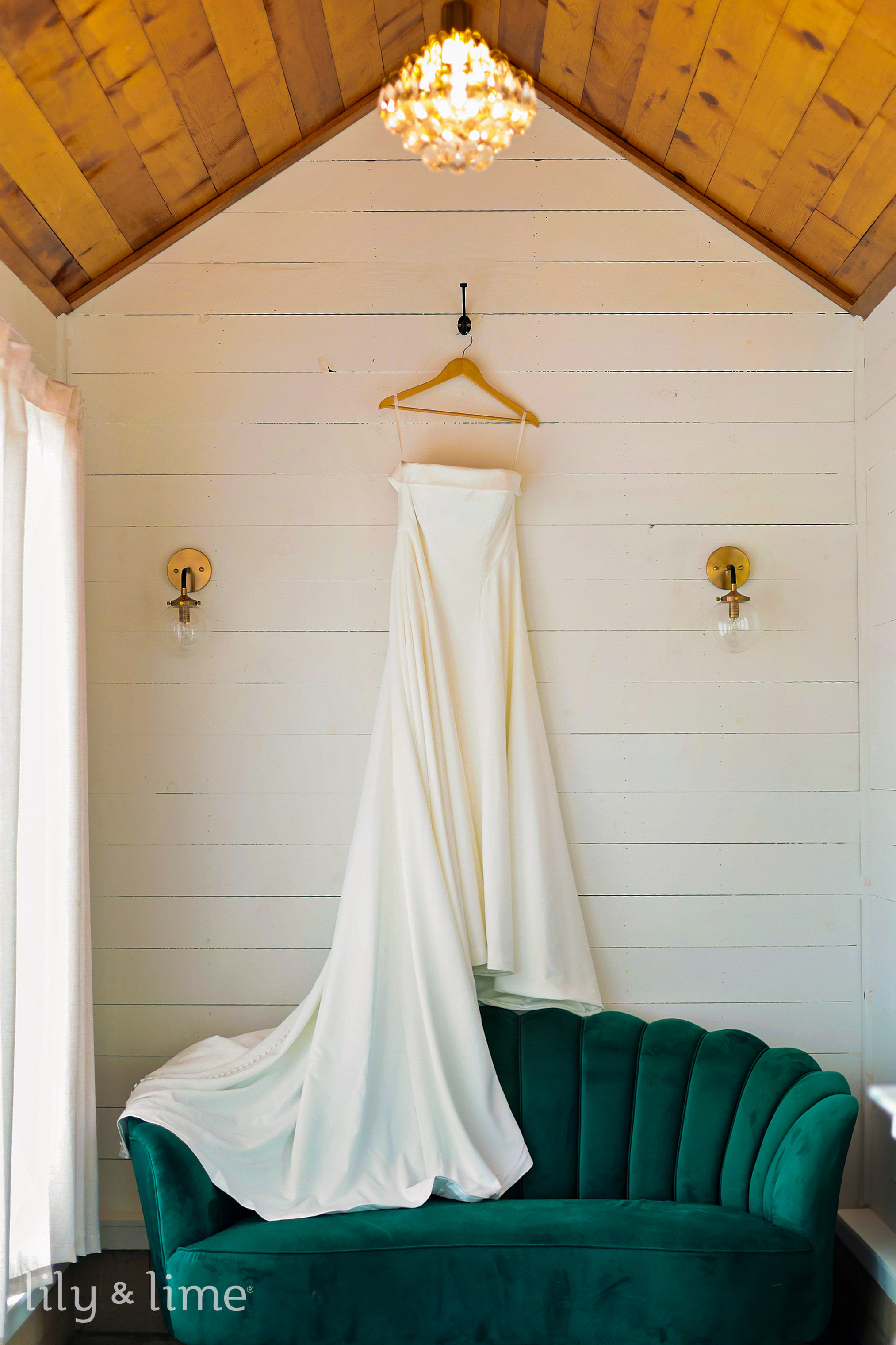 The morning of Coral and Joshua’s wedding was nothing short of charming as Coral prepared for her special day. She started in a playful little mermaid pajama set before transforming into a vision of bridal elegance. Her crisp white wedding dress, with its strapless plunging neckline and minimal A-line silhouette, struck the perfect balance of modern and timeless. Coral enhanced her look with wavy open hair, a delicate veil, minimal pearl jewelry, and an unexpected yet perfectly “her” touch—white Converse high-tops. Completing the look was a white bridal bouquet adorned with trailing greenery, subtle yet striking. Meanwhile, Joshua prepared with equal style, donning a forest green formal suit that was both bold and sophisticated. He paired it effortlessly with a crisp white shirt, matching green pants, a taupe necktie, and elegant finishing touches of a white pocket square and boutonniere.