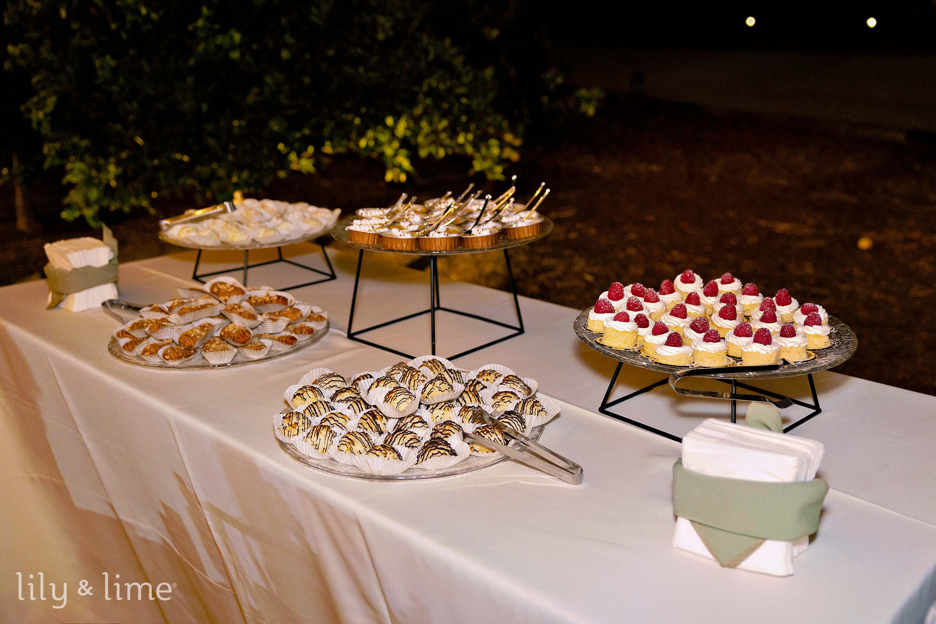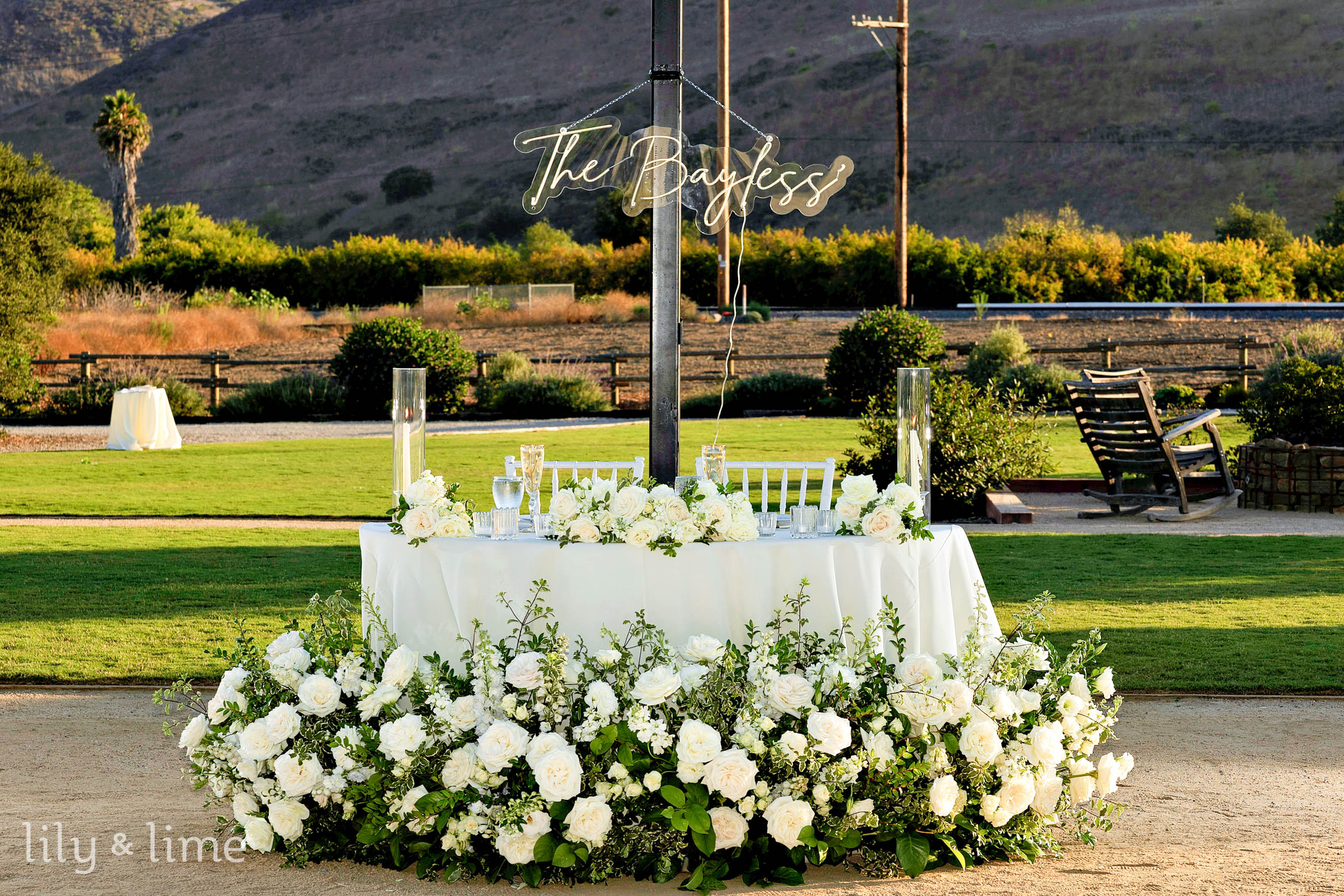 The sweetheart table was a showstopper, adorned with white flowers and a neon sign that read “Cristina & Garner.” The all-white wedding cake, topped with a custom “The Bayless!” cake topper, was a centerpiece of the dessert table, which also featured an array of delectable treats.