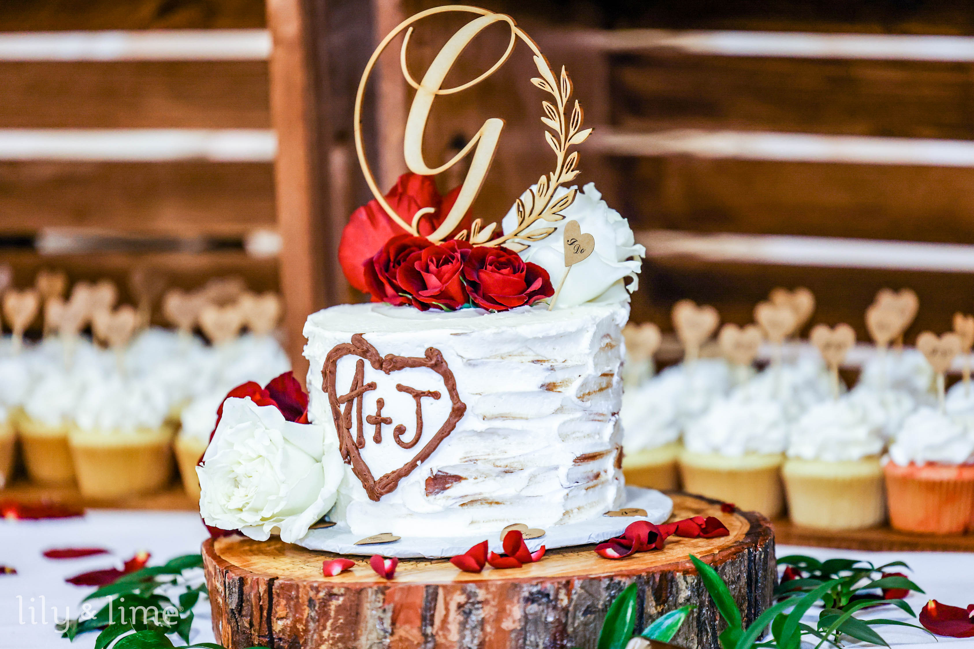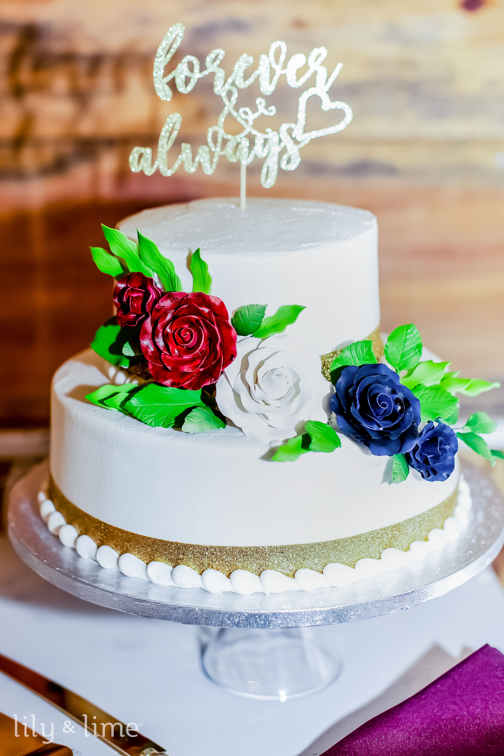 Don't we all love rustic wedding cakes for celebrations around the year? To add a chic flair to your Americana wedding details, you can go for a classic naked wedding cake. For instance, you can opt for a naked red velvet cake with white cream cheese frosting, and add a striped detail to the dessert table without going overboard. With naked reception cakes, you won't need to worry about buttercream or fondant melting off in warmer temperatures. Additionally, the lack of frosting results in a lighter flavor, which is ideal for those who prefer less sugary desserts. Top it off with fresh fruits like strawberries and raspberries, or red and blue flowers, to add your own red and blue wedding colors to the dessert table!