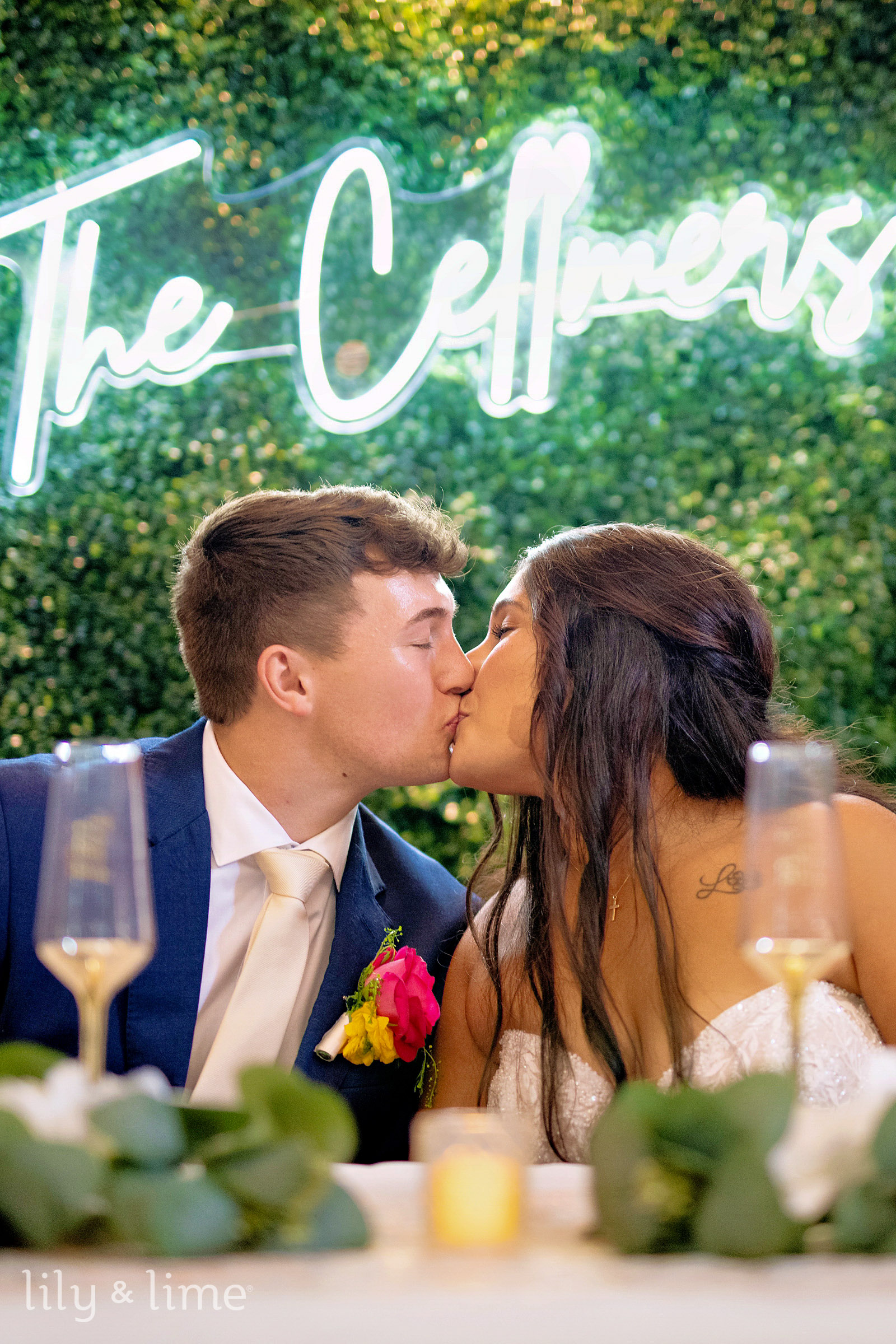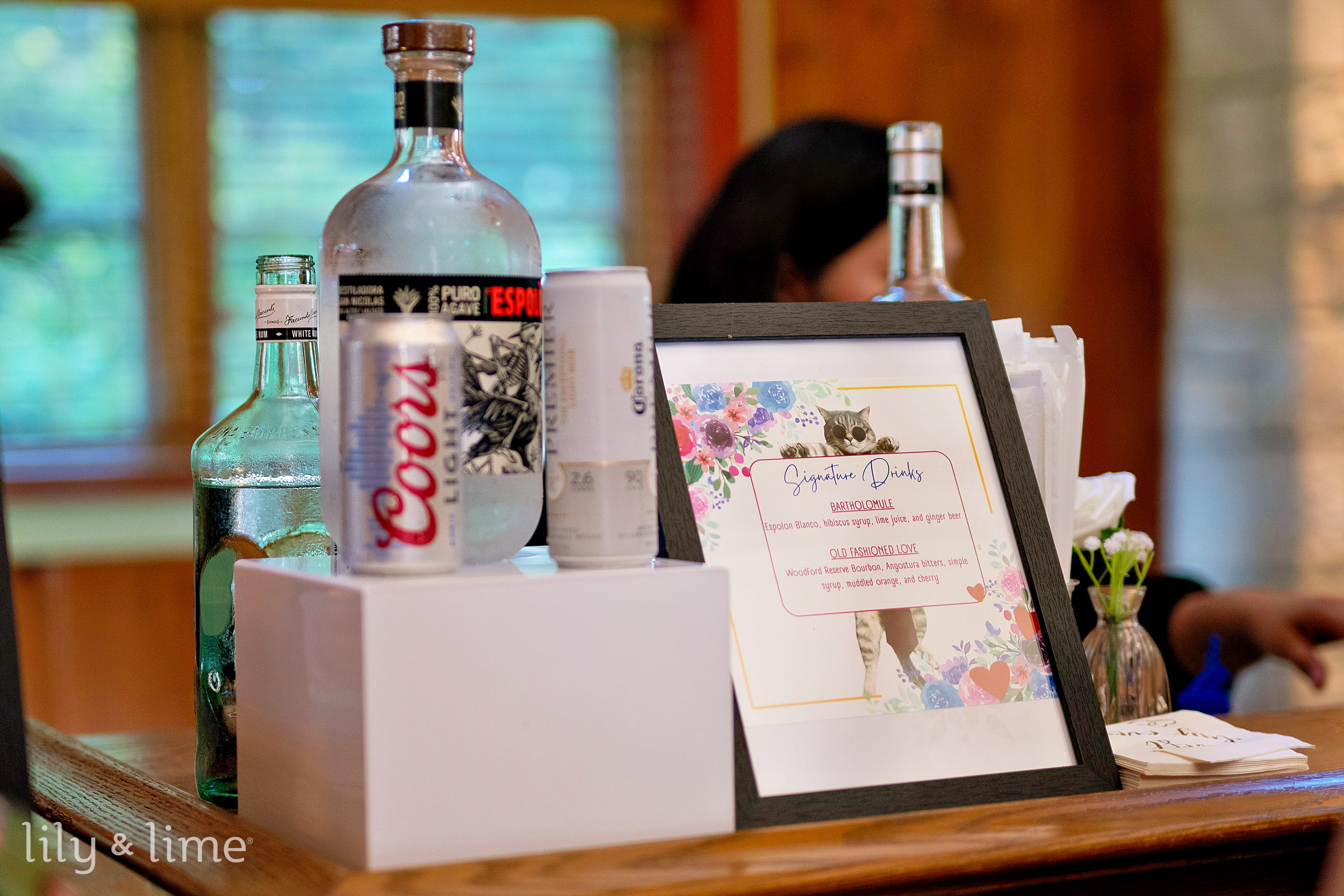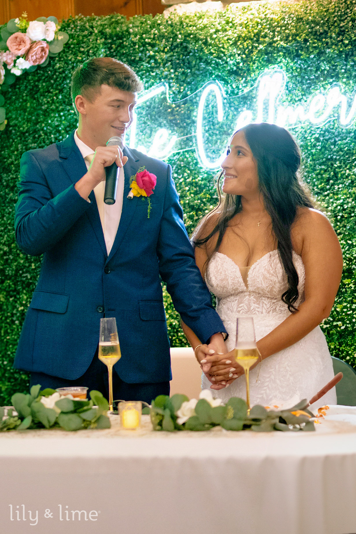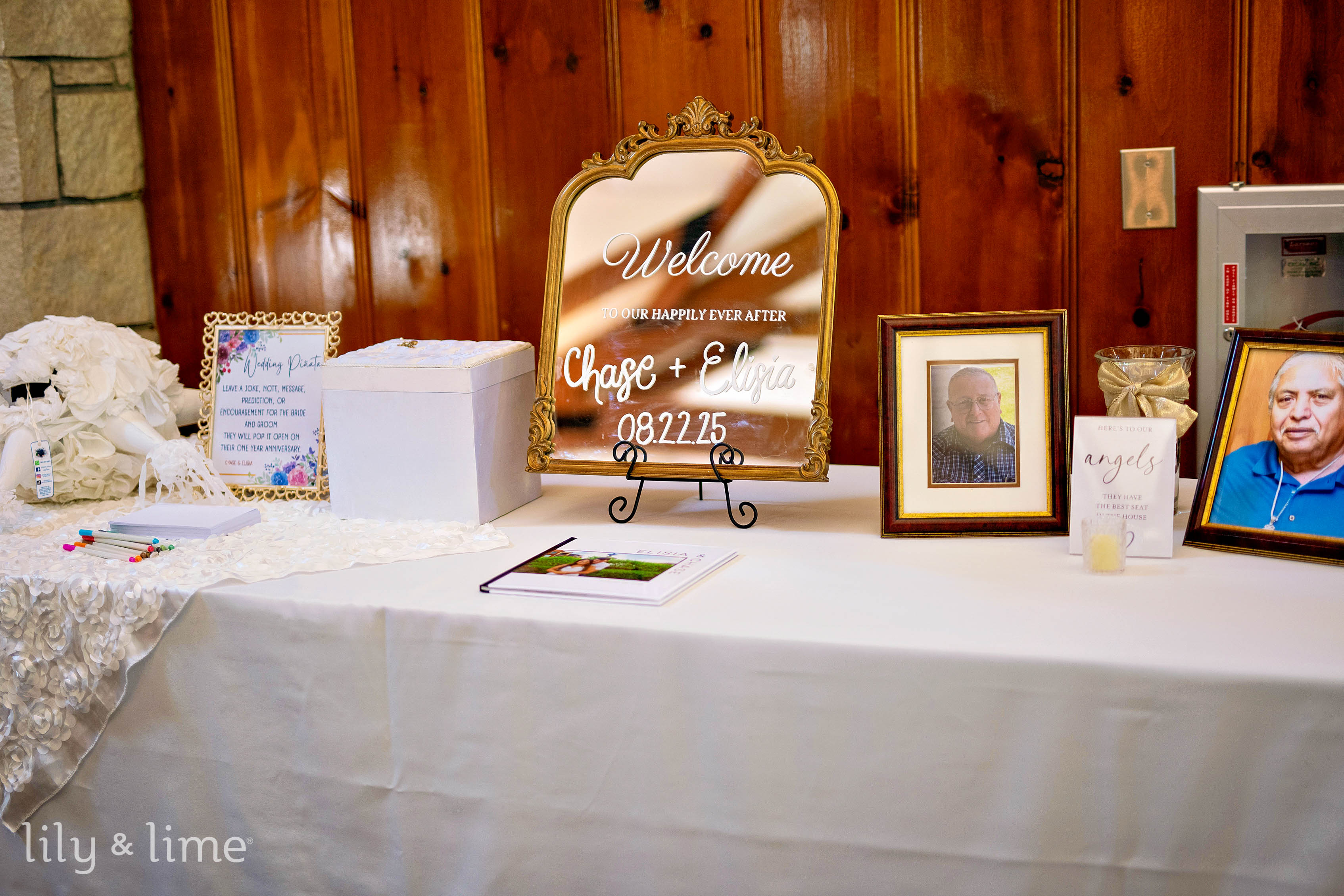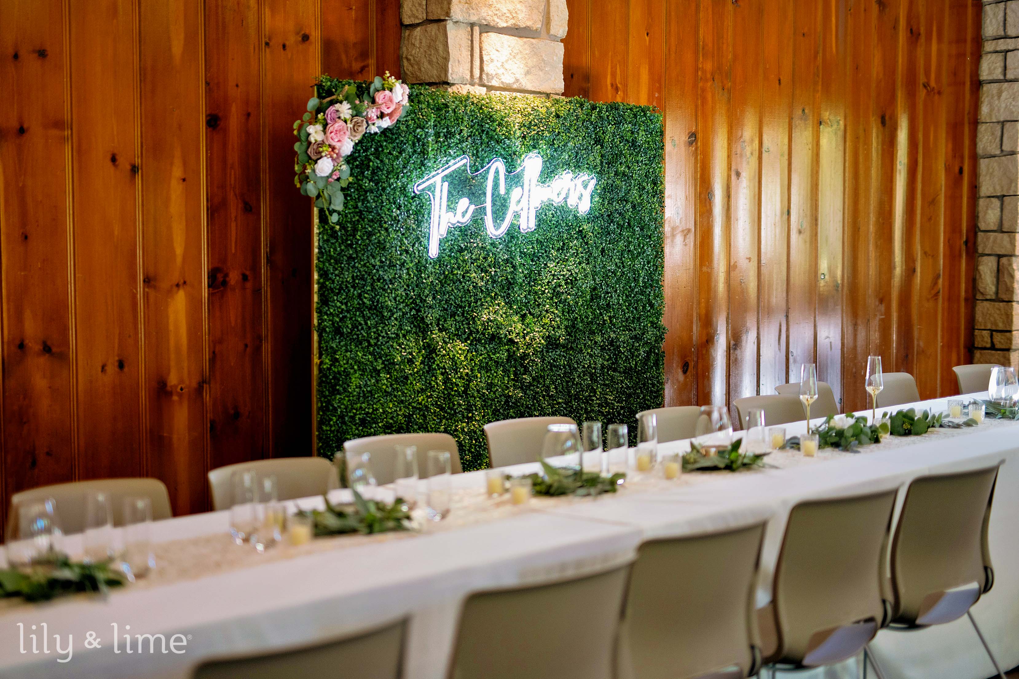 The reception at the Lodge at Ironwoods was a perfect blend of rustic charm and modern elegance. A greenery wall with a neon sign, antique mirror signs, and a memorial table added personal touches to the decor. The wedding bar and minimal floral centerpieces, paired with warm lighting, created an inviting atmosphere. The all-white wedding cake, adorned with colorful summer roses, was a centerpiece of the dessert table, which also featured pastel-colored desserts that delighted guests.