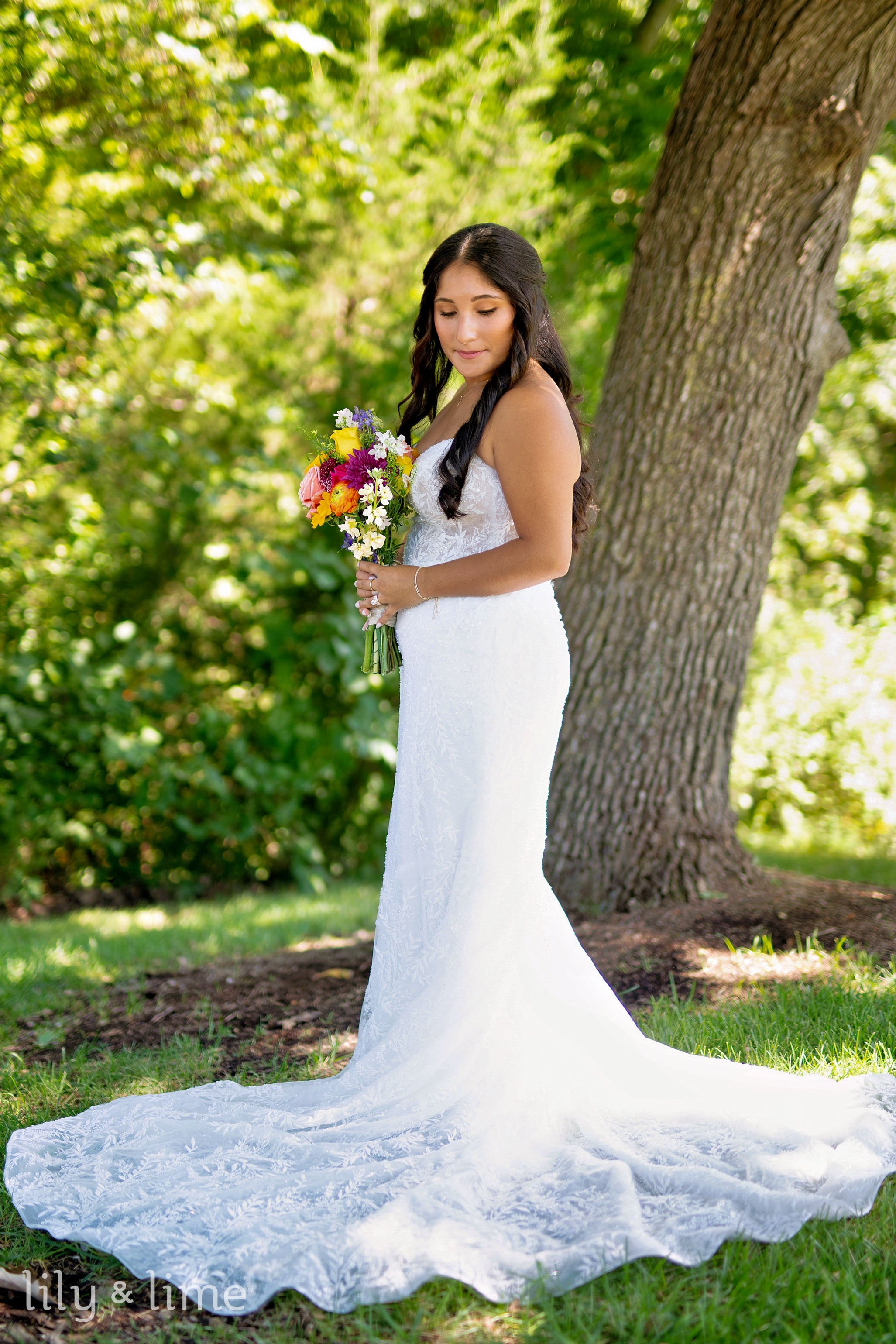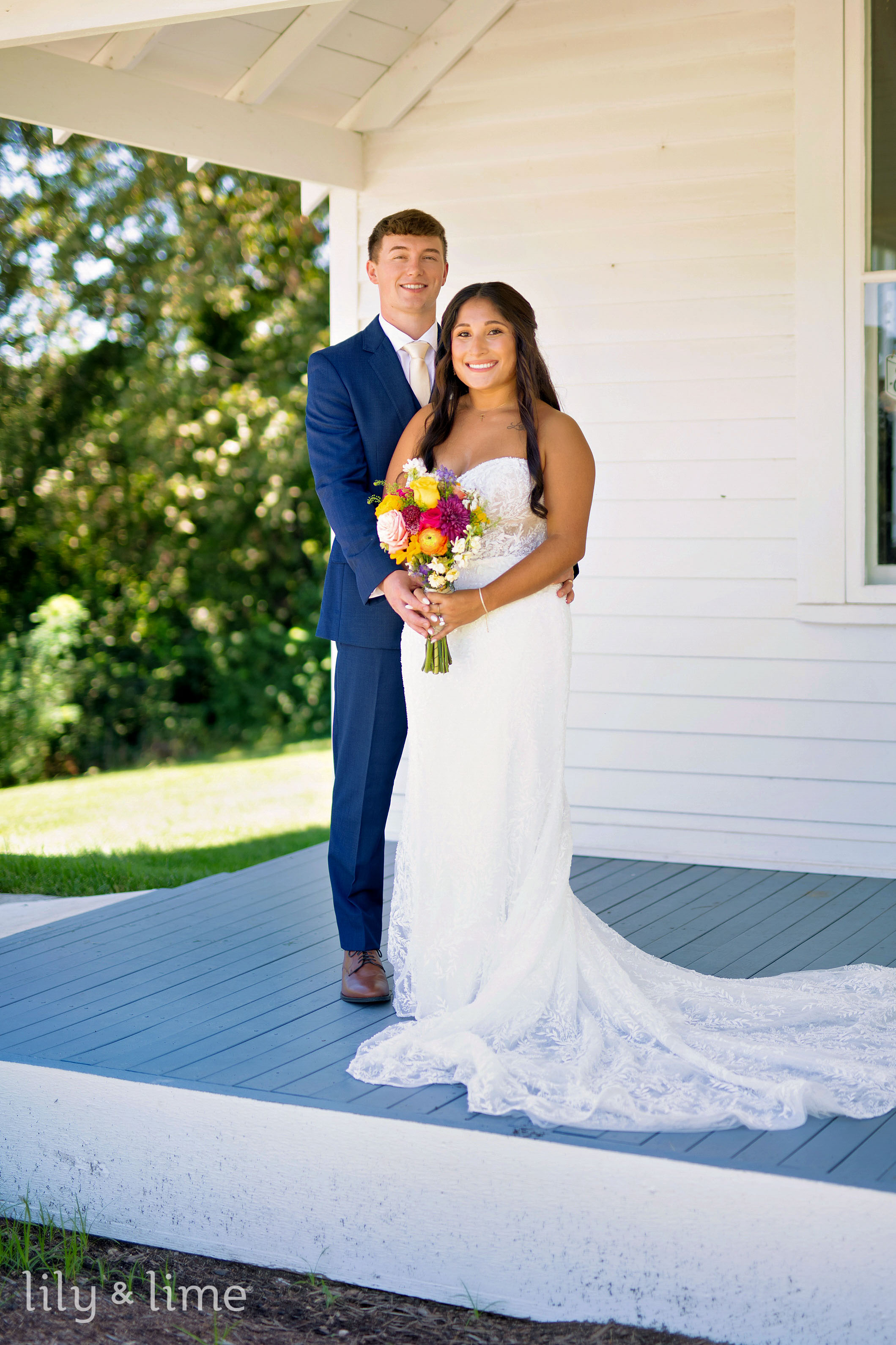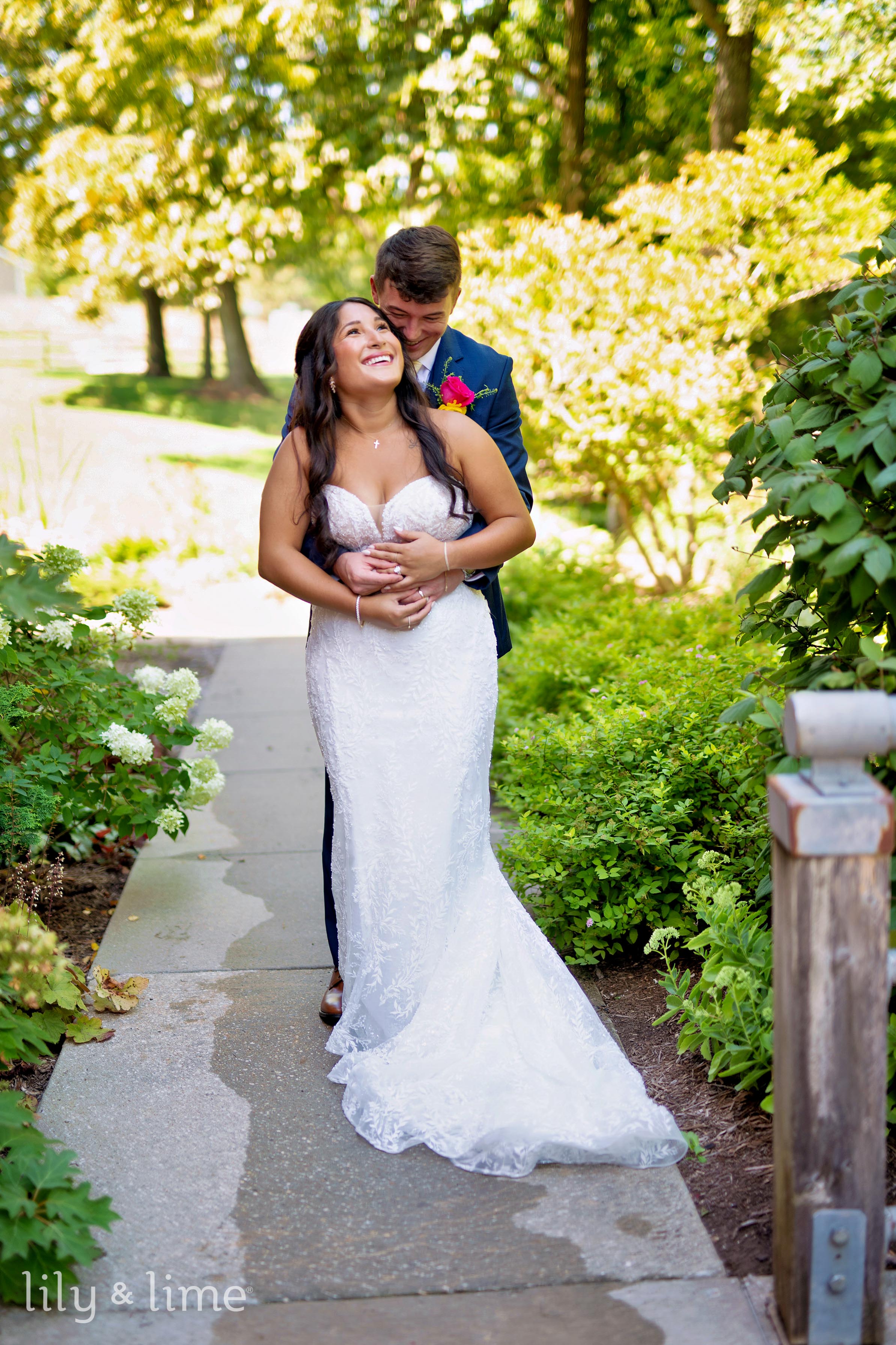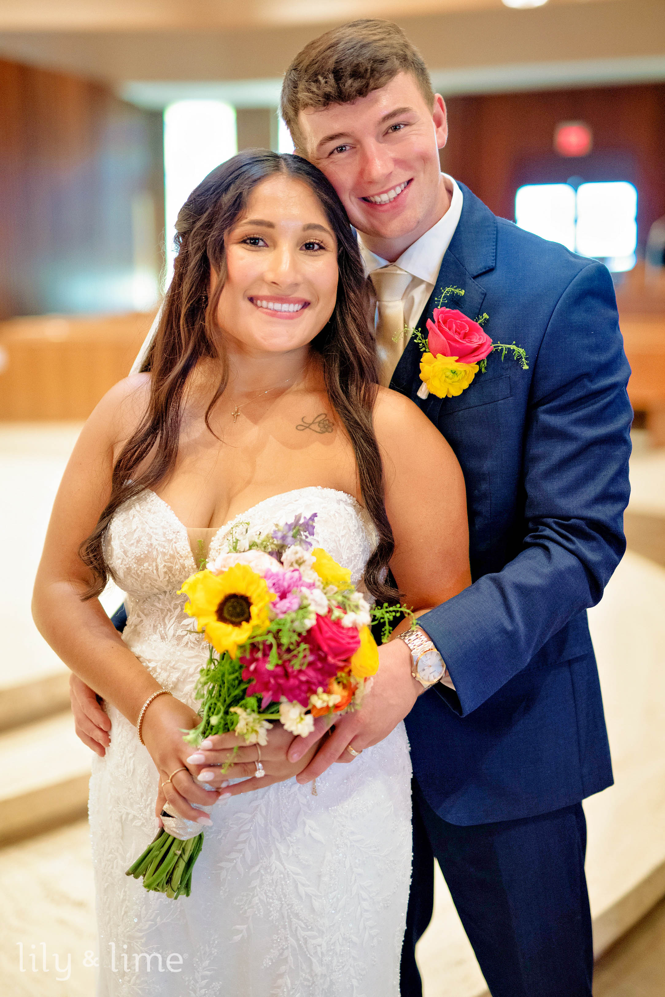 After the ceremony, the couple posed for group portraits with their wedding party and family. The groomsmen and bridesmaids, dressed in their stylish attire, added a touch of elegance to the photos. Around the church’s picturesque grounds, Elisia and Chase’s couple portraits were a highlight, with the natural landscape of greenery and summer blooms providing a stunning backdrop.