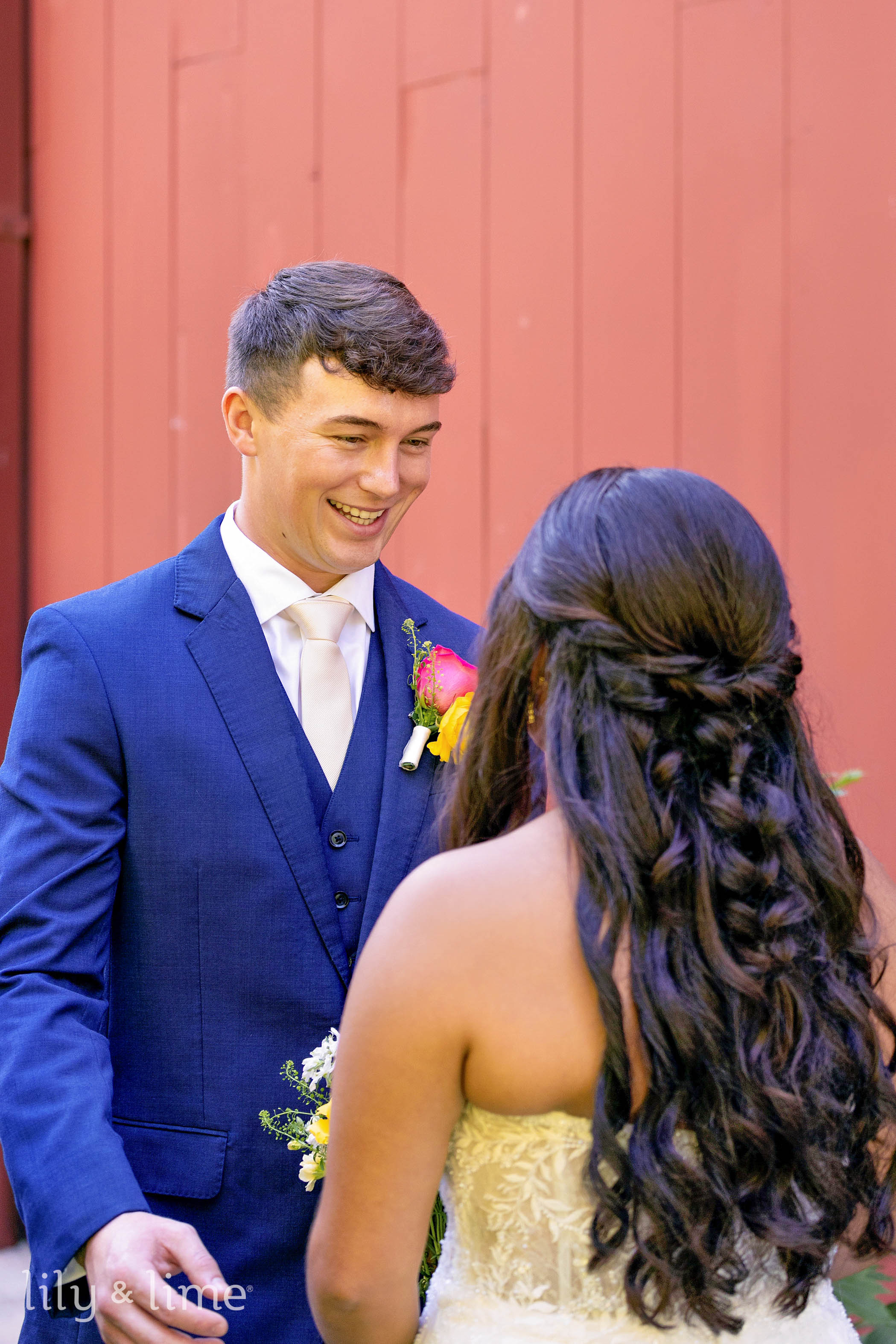 The couple’s first-look session was a heartfelt moment, set against the lush greenery of the venue. Their smiles and emotions as they saw each other for the first time were beautifully captured, setting the tone for the day ahead.