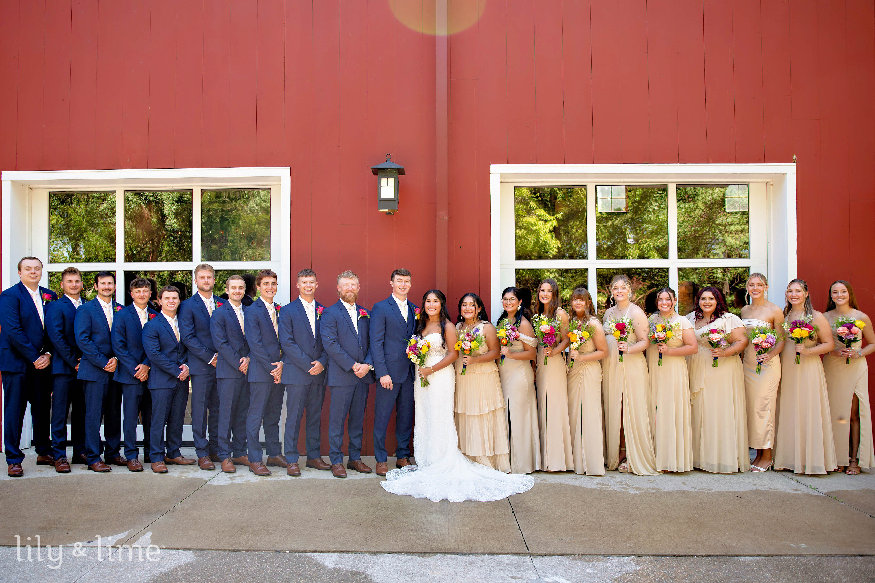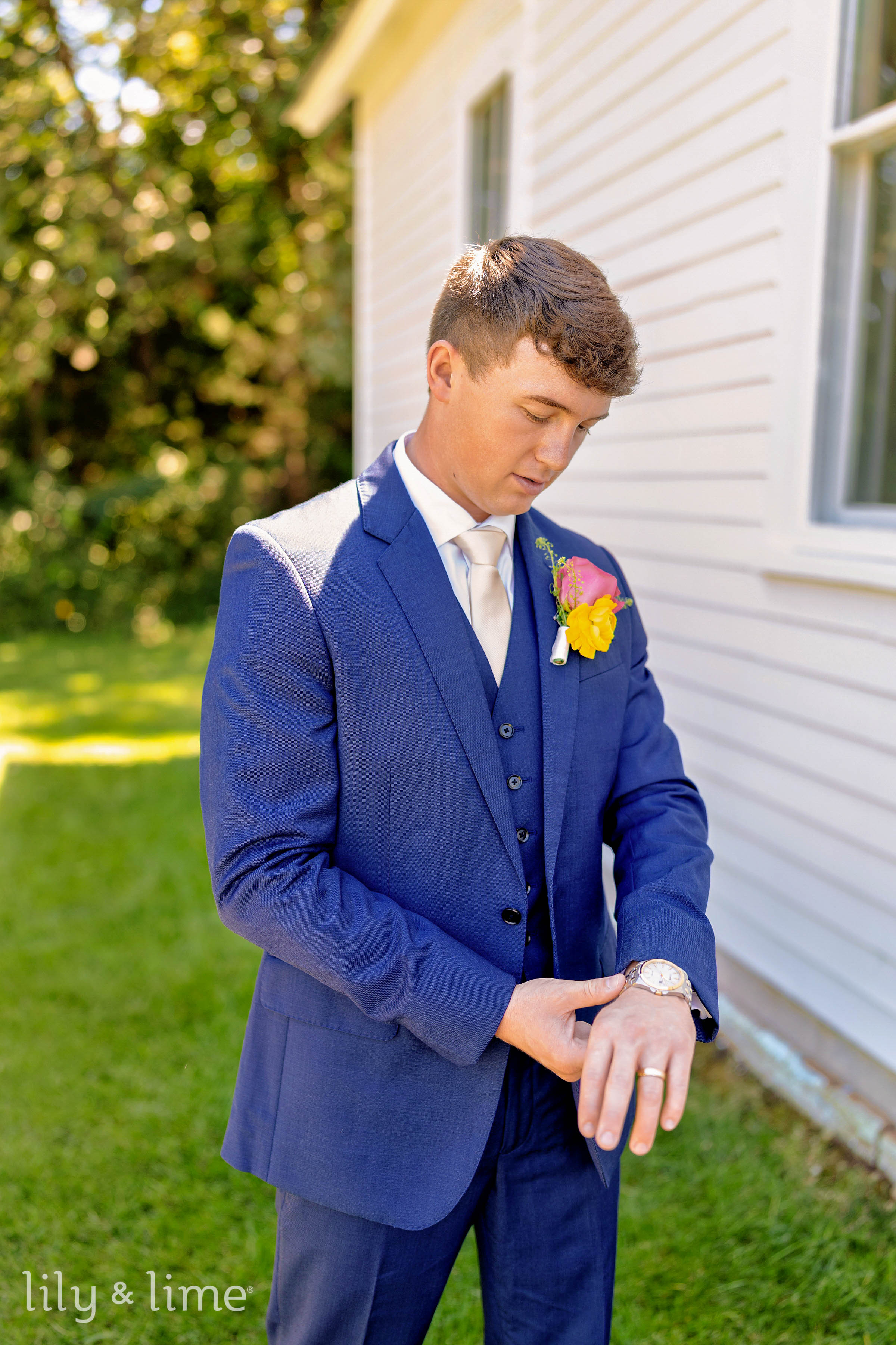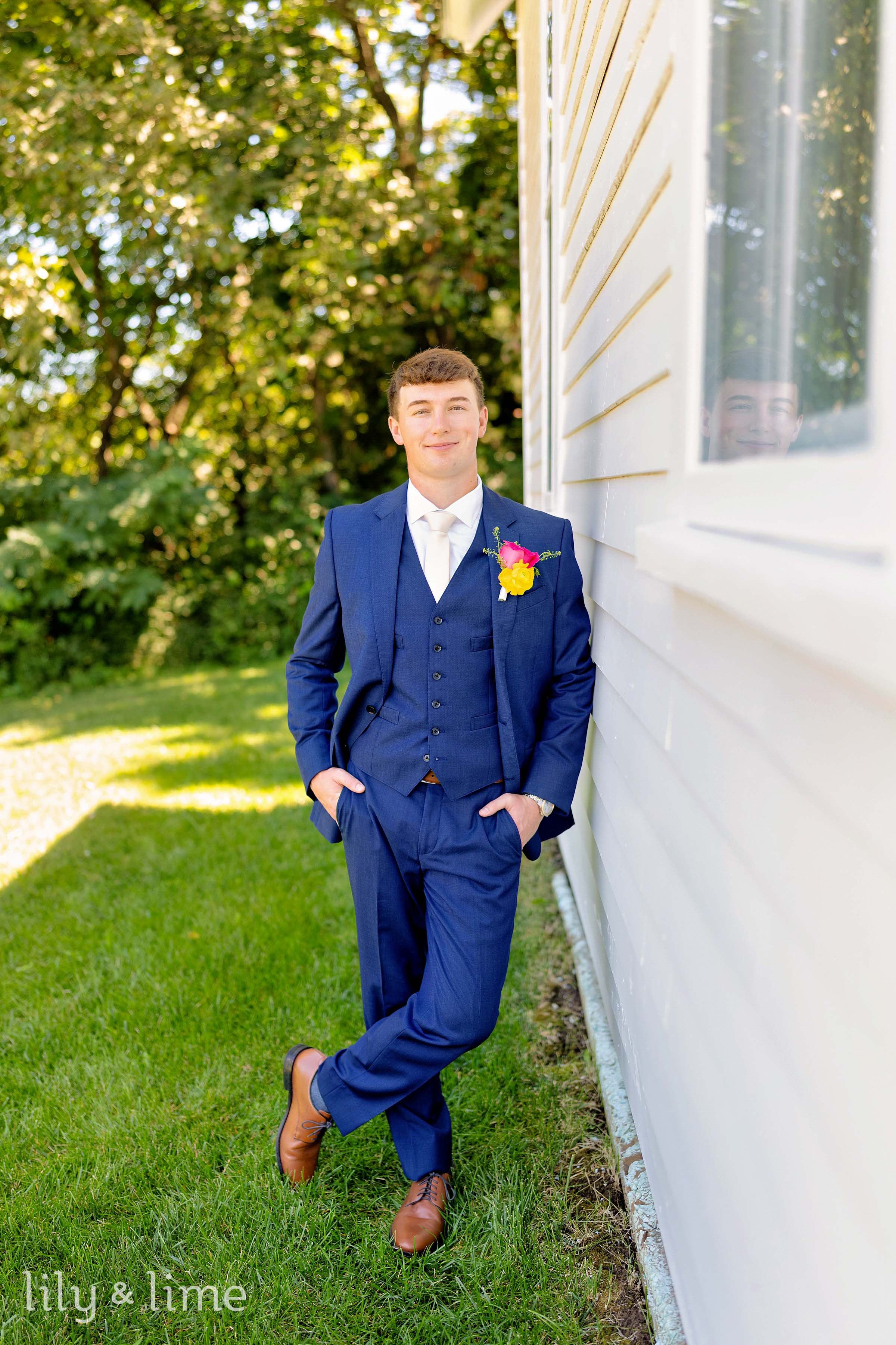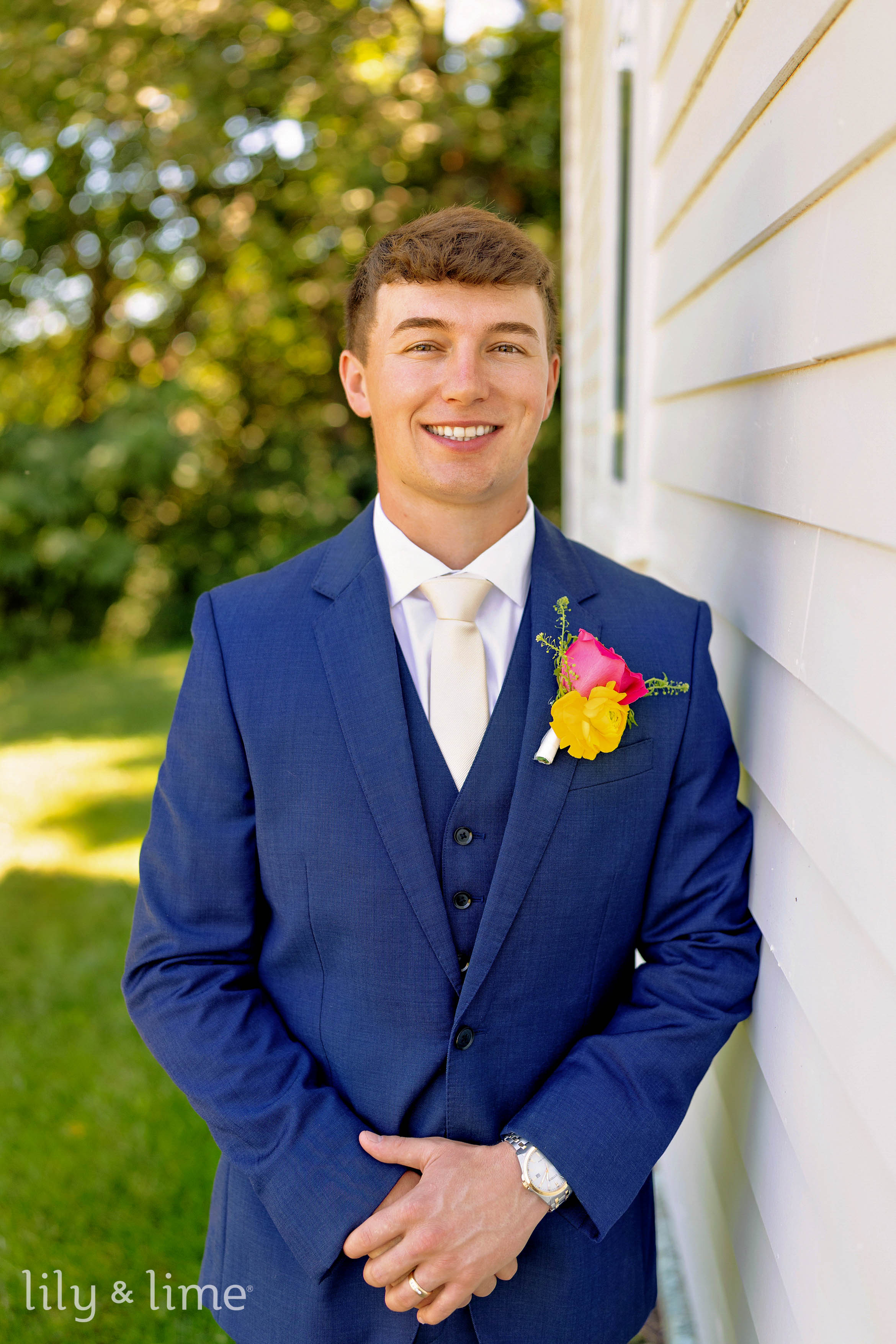 Meanwhile, Chase prepared for his big day in a royal blue three-piece suit that exuded sophistication. Paired with a crisp white shirt, shiny brown shoes, a white silk tie, and a bright summer boutonniere, he looked every bit the dashing groom. The wedding party complemented the couple beautifully, with bridesmaids in champagne dresses carrying colorful wedding bouquets and groomsmen in matching royal blue suits.