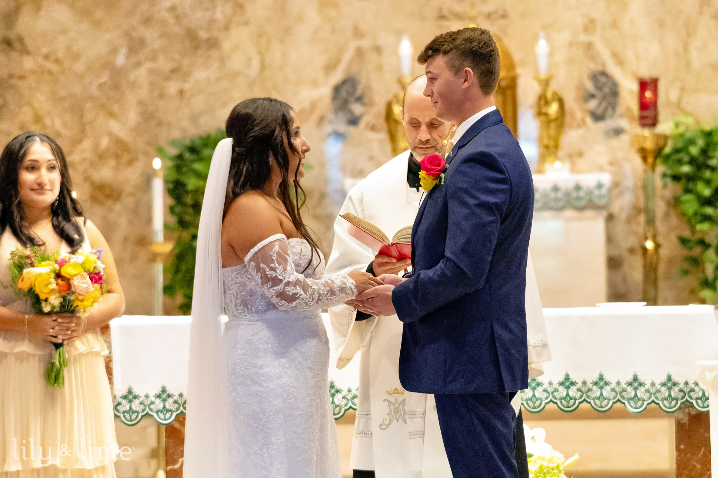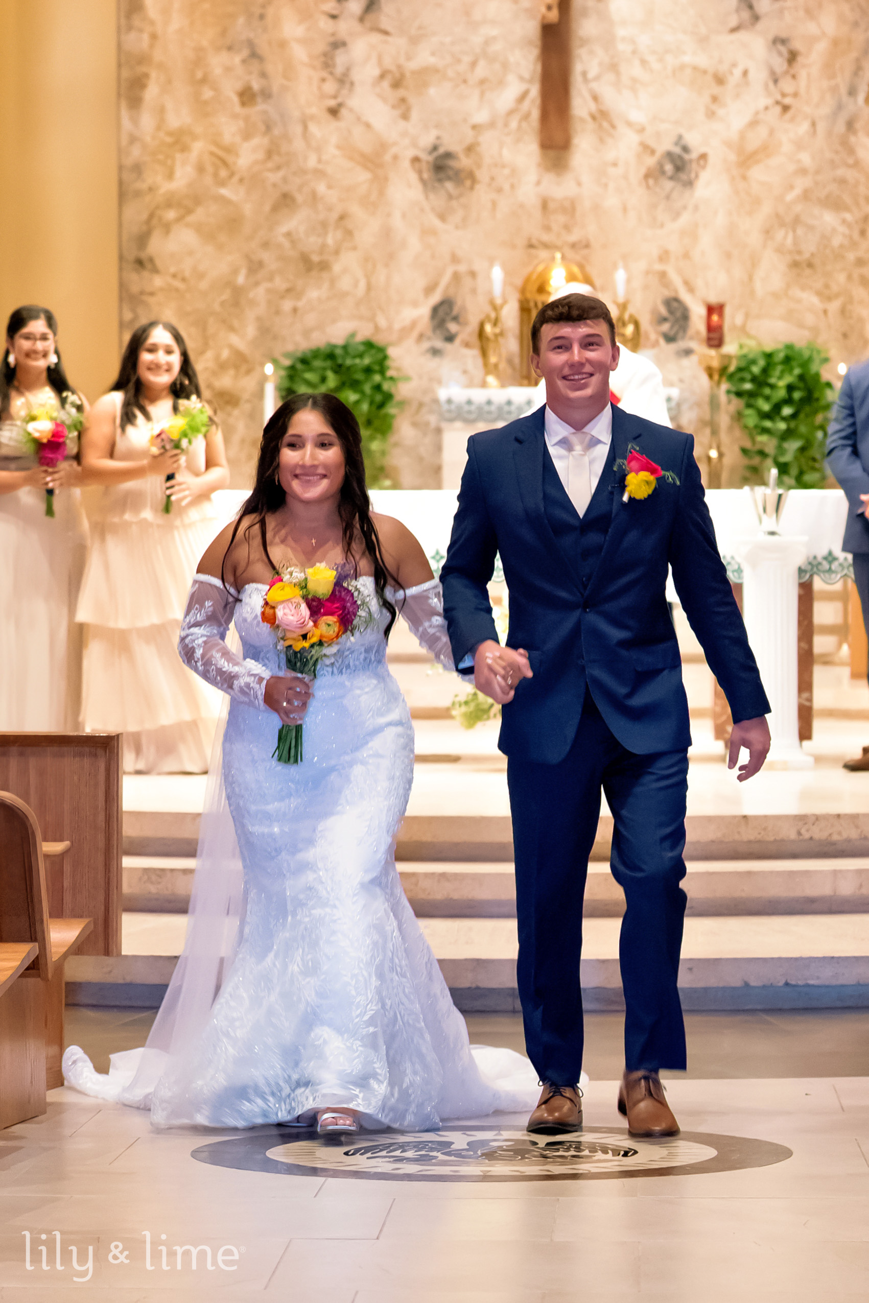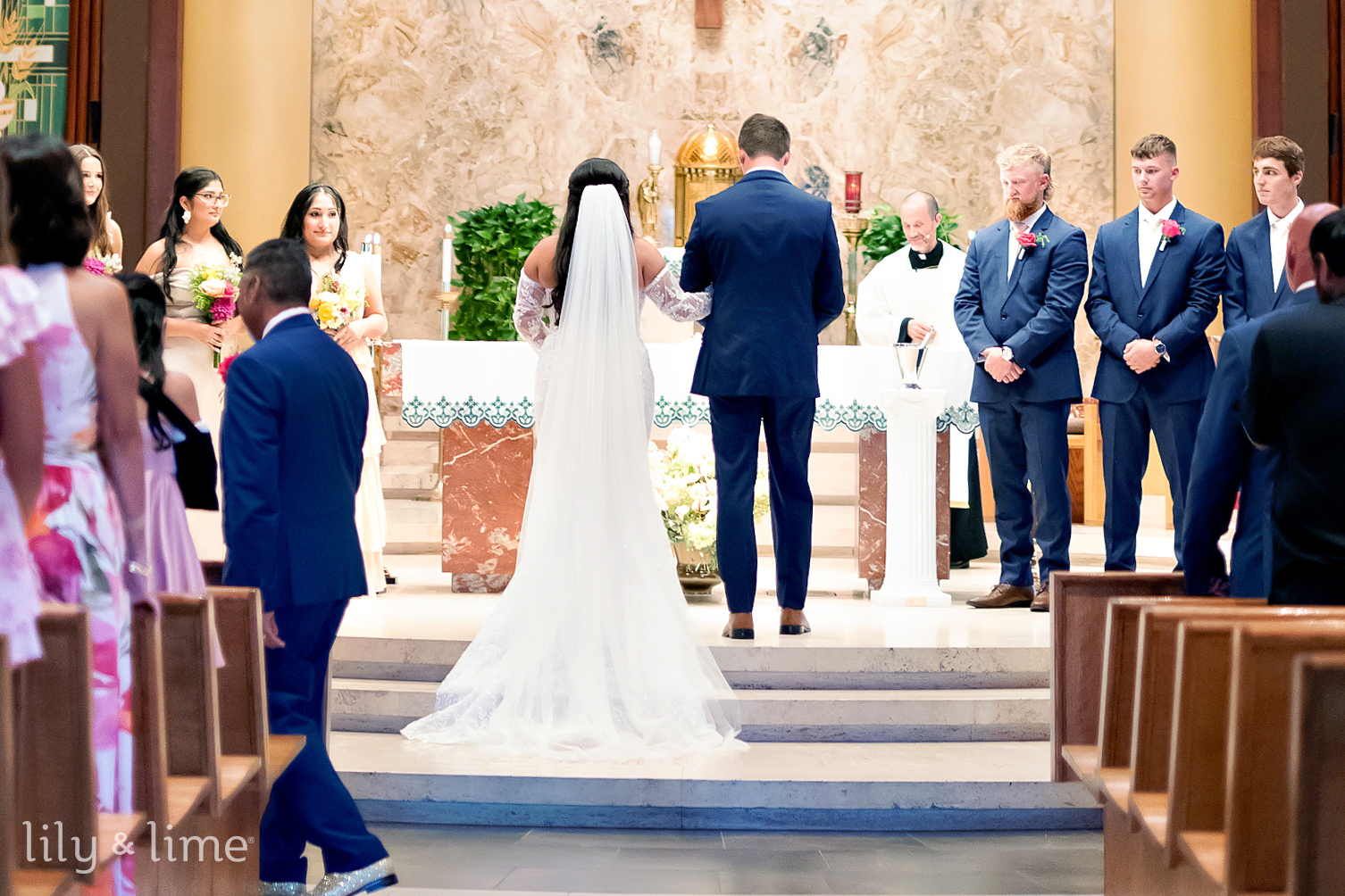 The ceremony took place in the stunning St. Joseph Catholic Church, where the decor was nothing short of breathtaking. The aisle was adorned with white flower installations and candlelit accents, creating a romantic and serene ambiance. The soft lighting added a warm glow, enhancing the beauty of the space. As Elisia and Chase exchanged vows, the emotional moments were captured in timeless photographs. The ceremony concluded with a joyful bubble send-off, as guests cheered the newlyweds into their next chapter.