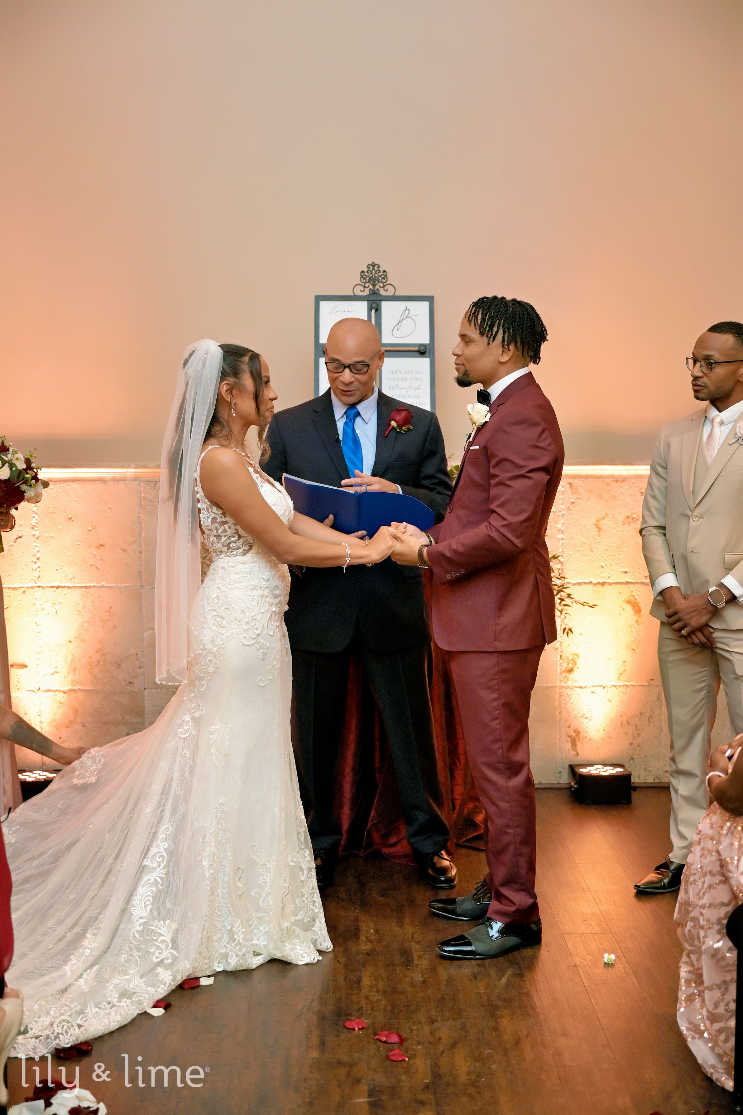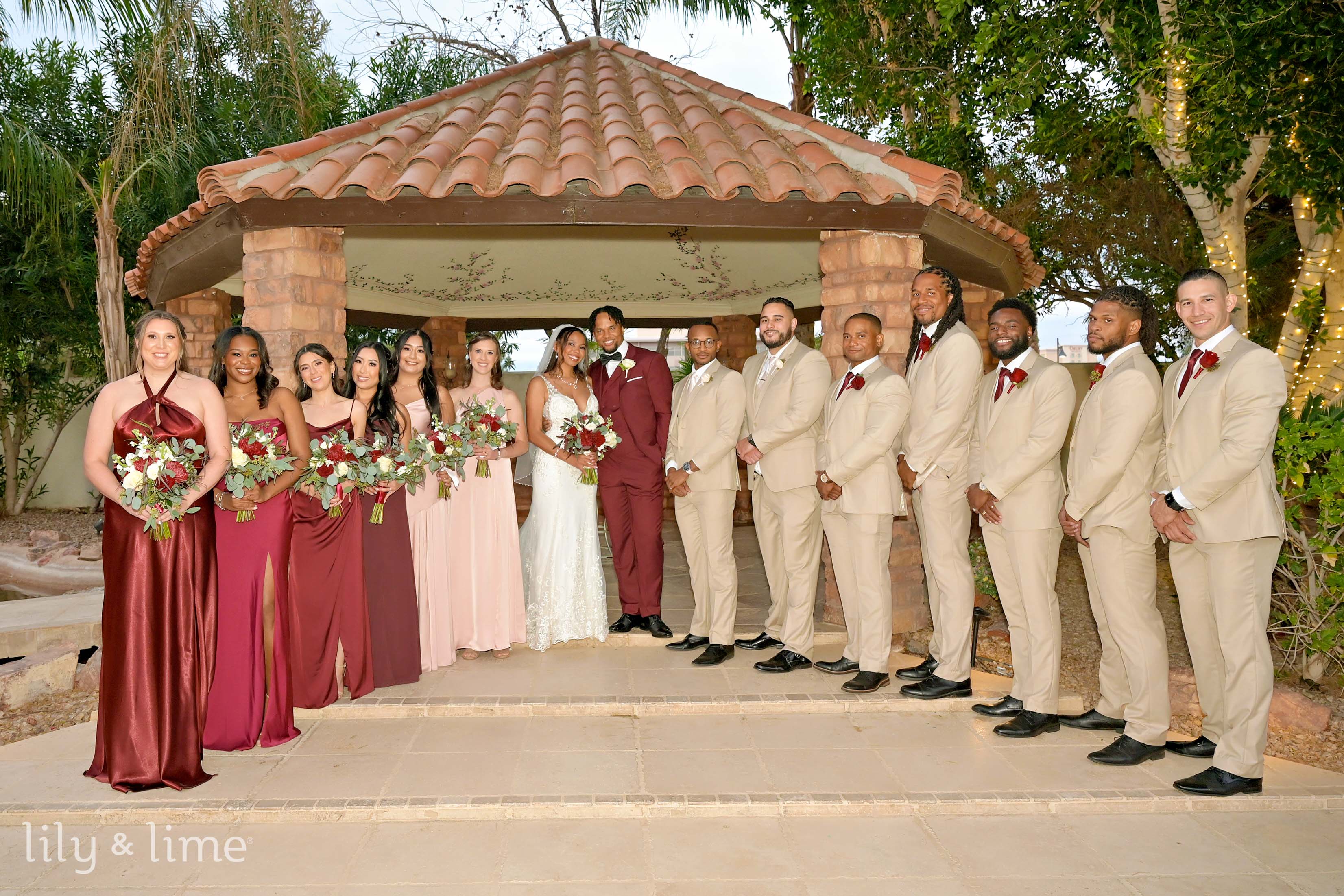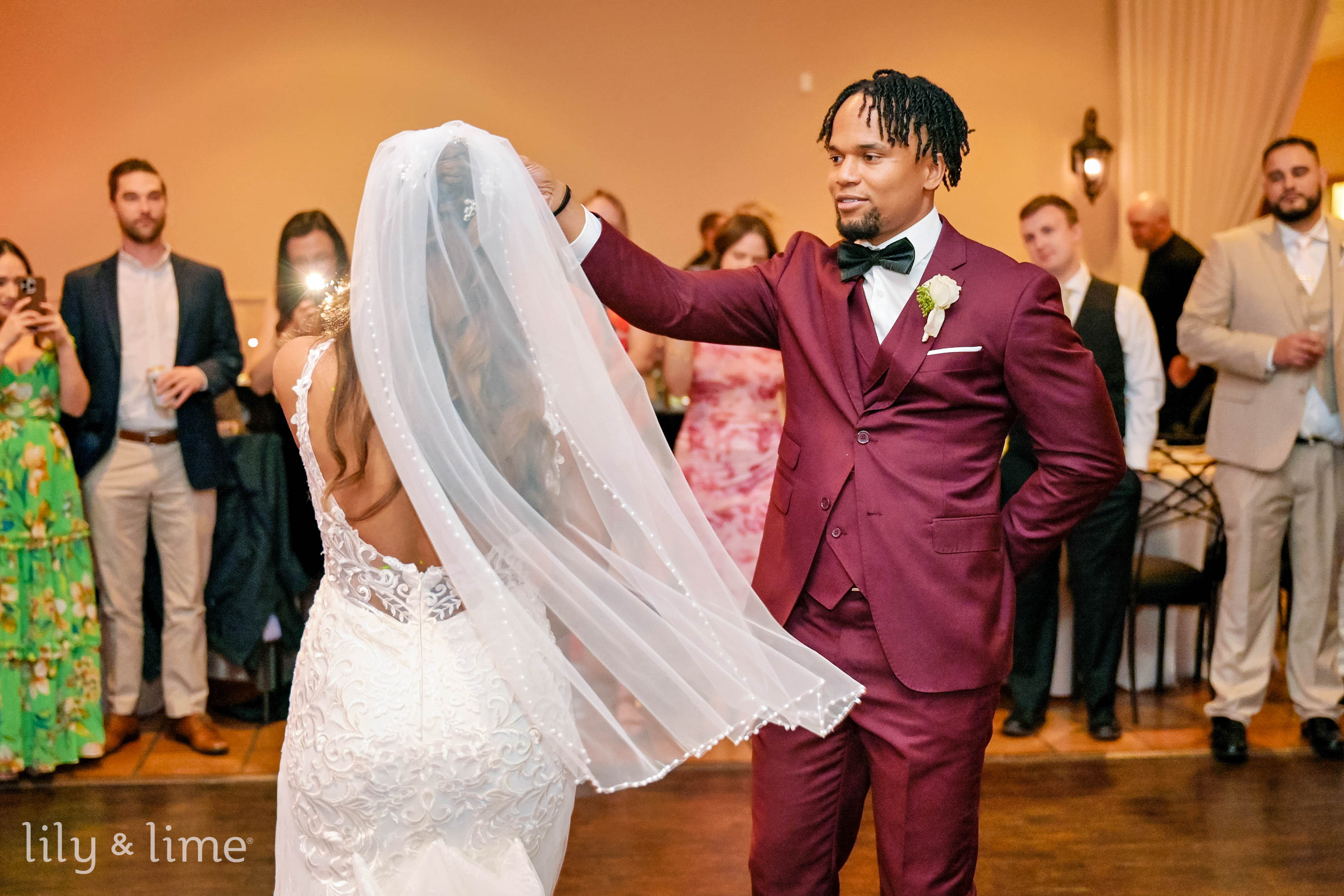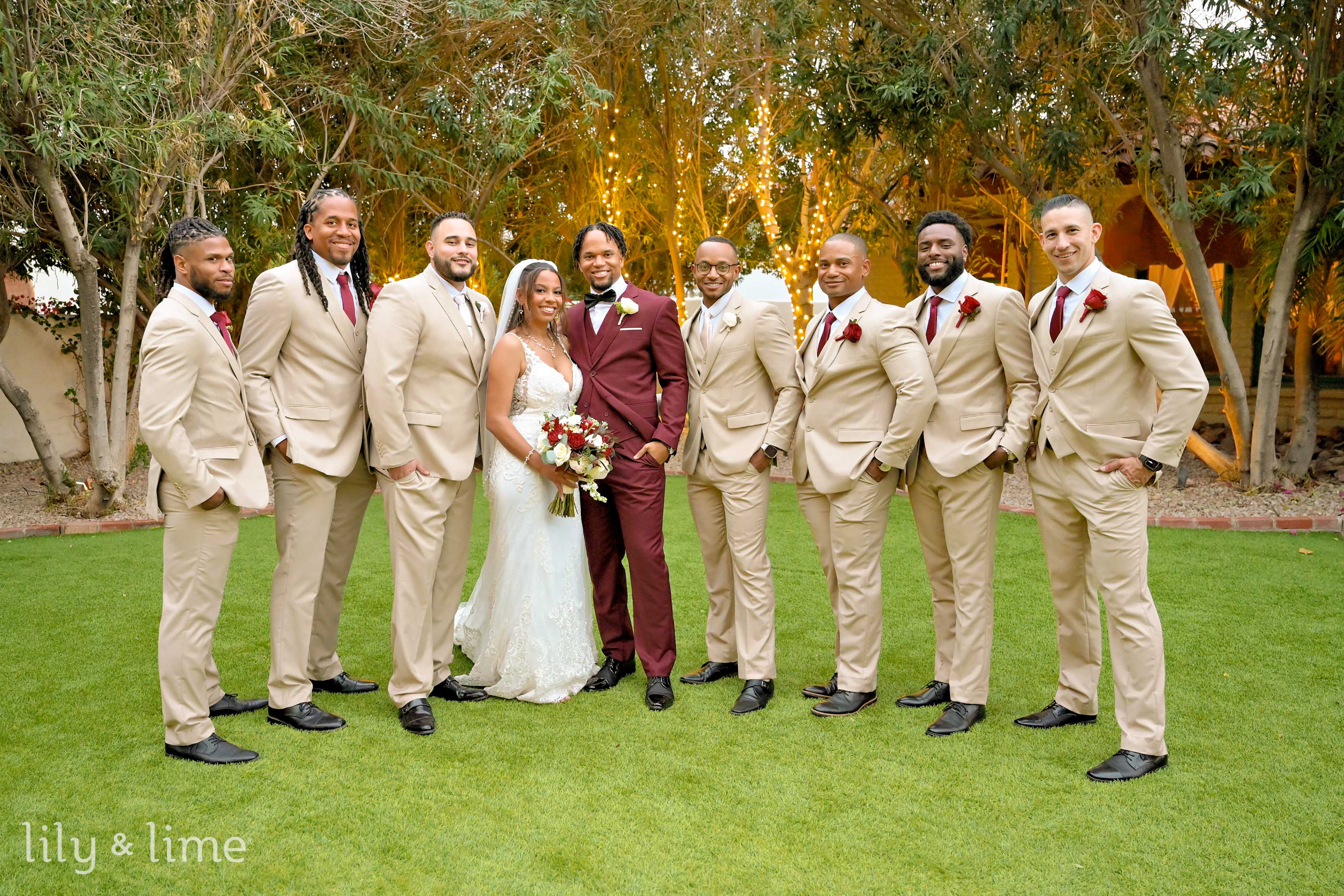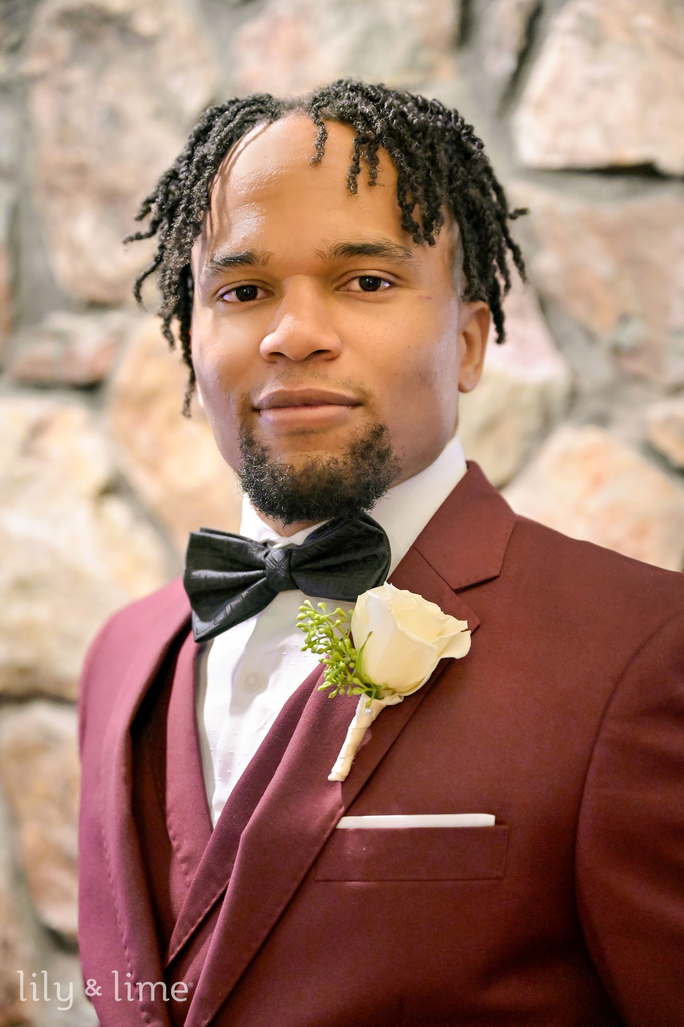 Eriann was a stunning bride in a chic wedding gown featuring thin straps, intricate lace, and delicate crystal appliqués. The low back and long lace train added a dramatic touch, while her stylish half-up hairstyle and shoulder-length veil completed the look. She carried a striking white and maroon bouquet that perfectly complemented her attire. Anders looked equally dapper in a three-piece maroon suit with a crisp white shirt and a sleek black silk bowtie. The wedding party brought additional elegance, with bridesmaids in maroon dresses and groomsmen in beige suits with maroon neckties, creating a cohesive and refined look.