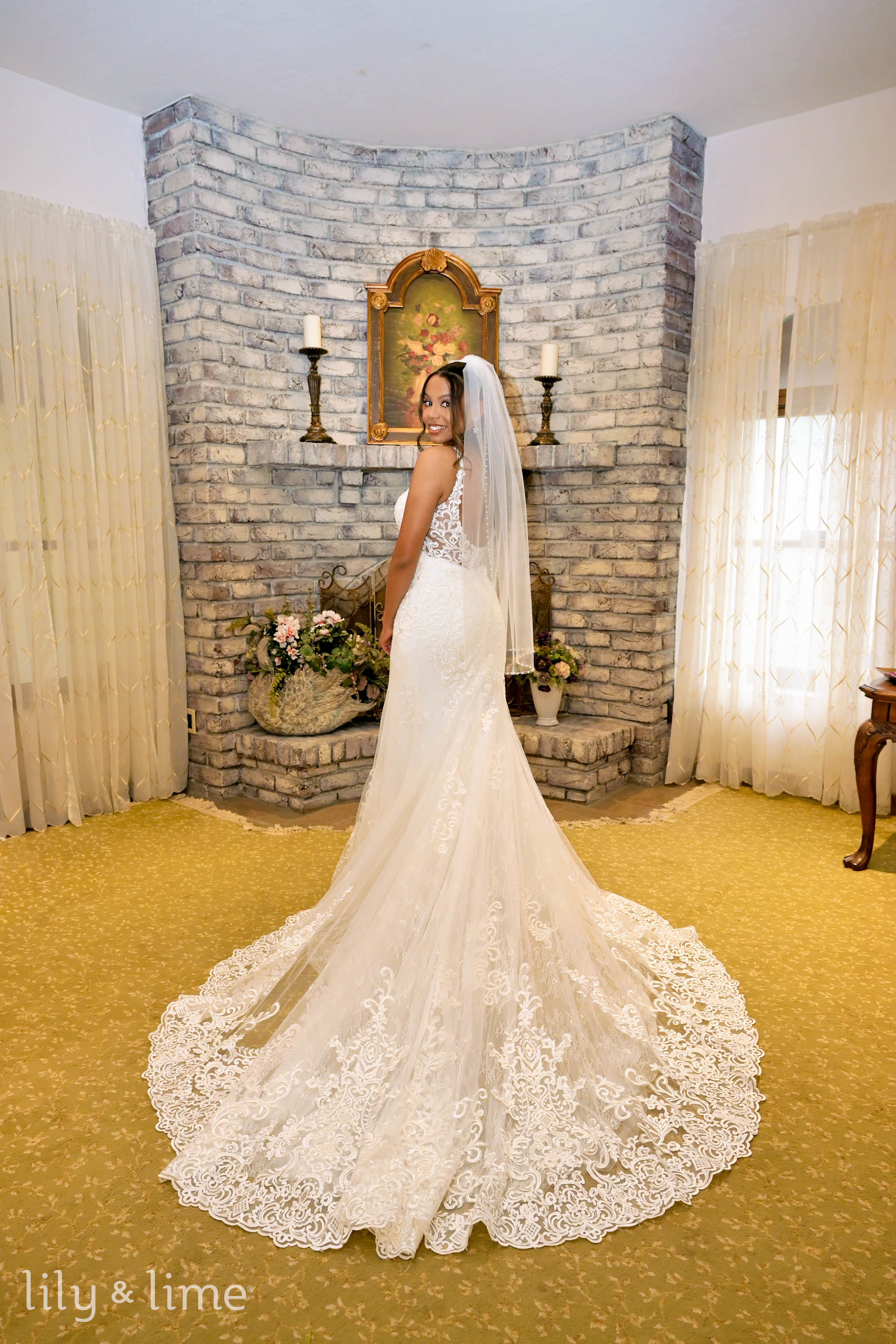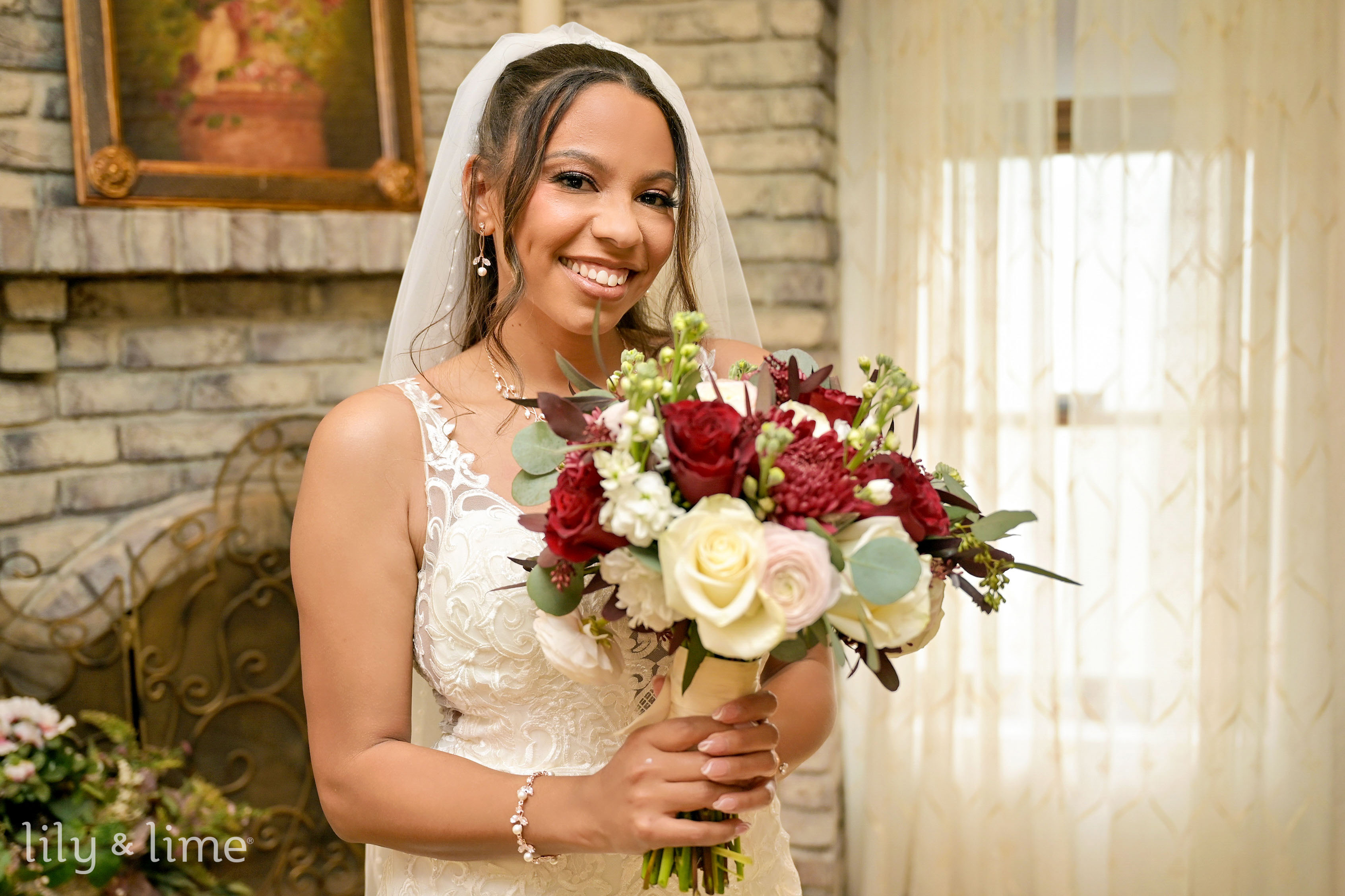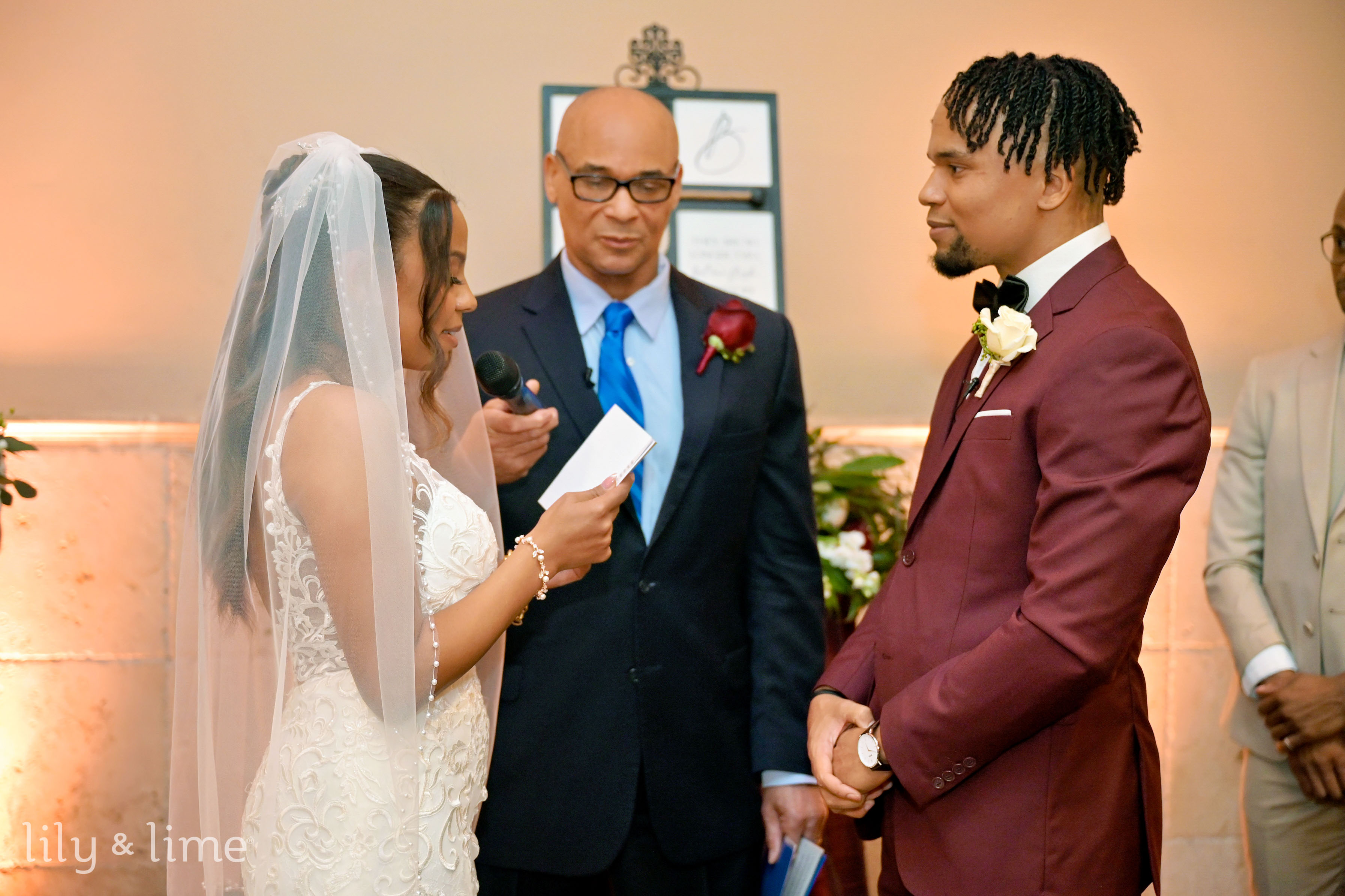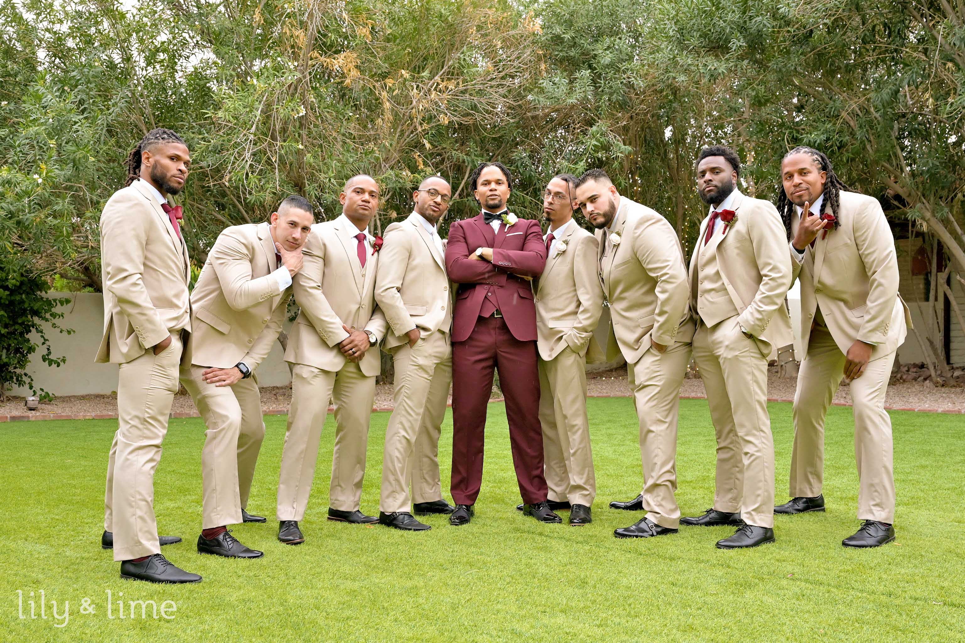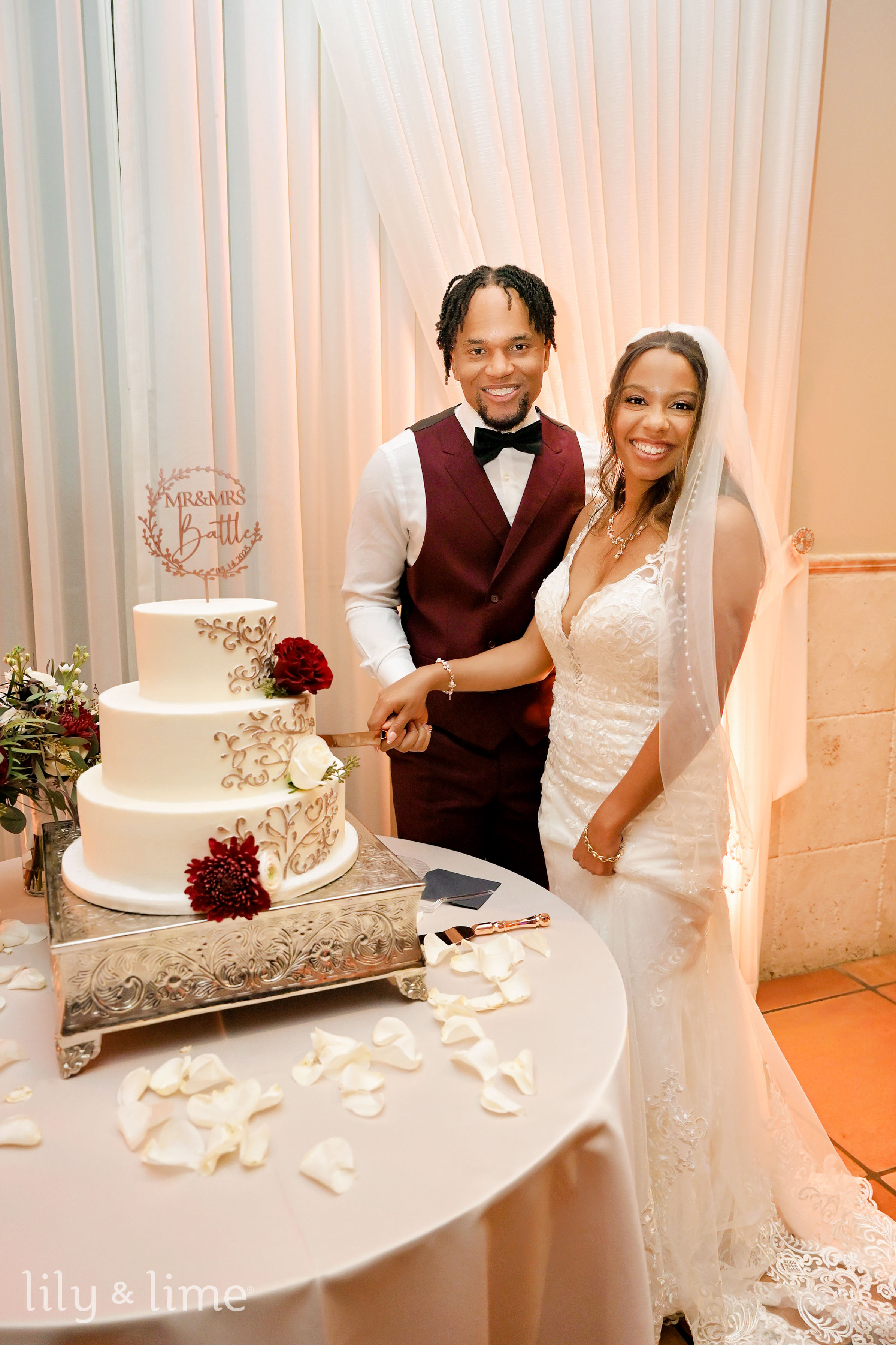 Eriann was a stunning bride in a chic wedding gown featuring thin straps, intricate lace, and delicate crystal appliqués. The low back and long lace train added a dramatic touch, while her stylish half-up hairstyle and shoulder-length veil completed the look. She carried a striking white and maroon bouquet that perfectly complemented her attire. Anders looked equally dapper in a three-piece maroon suit with a crisp white shirt and a sleek black silk bowtie. The wedding party brought additional elegance, with bridesmaids in maroon dresses and groomsmen in beige suits with maroon neckties, creating a cohesive and refined look.