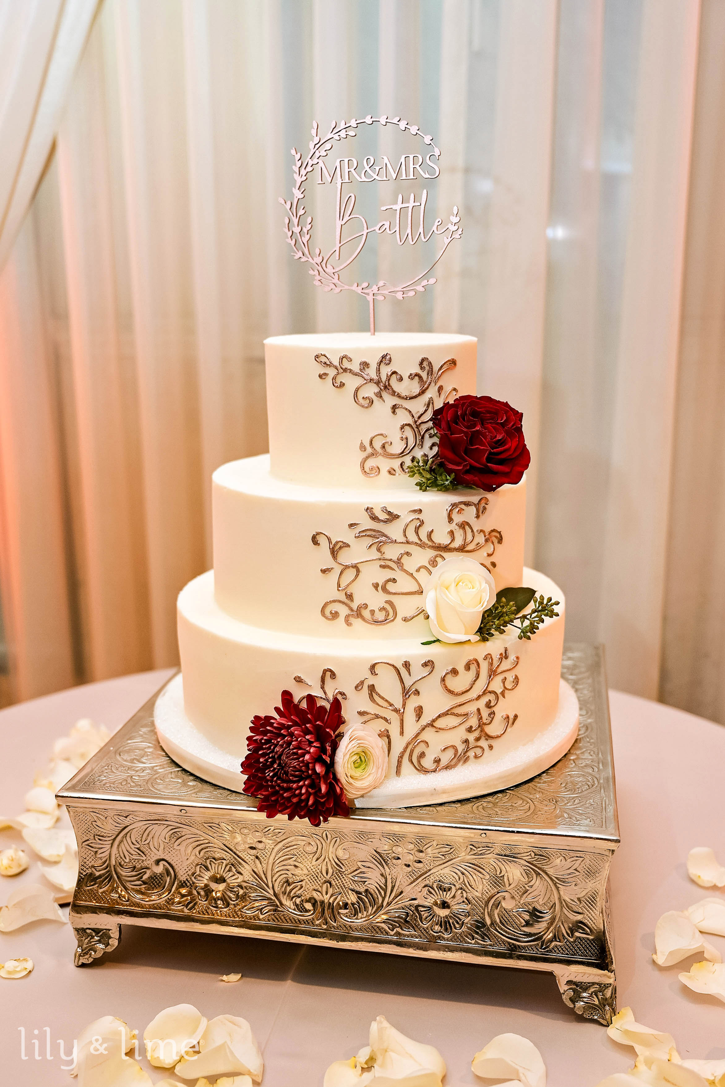 The celebration continued at an elegant indoor reception. Tables featured a sophisticated white, black, and gold theme, accented by lush floral centerpieces in green, white, and maroon. A special sweetheart table was set for the newlyweds, while a touching memorial table honored late loved ones. The centerpiece of the reception was a stunning three-tier white wedding cake, adorned with gold details and fresh flowers. The evening came to life with heartfelt toasts, the couple's first dance, and joyous moments on the dance floor. The highlight was the cake-cutting, which symbolized the start of their new life together. It was a day filled with love, laughter, and unforgettable memories.