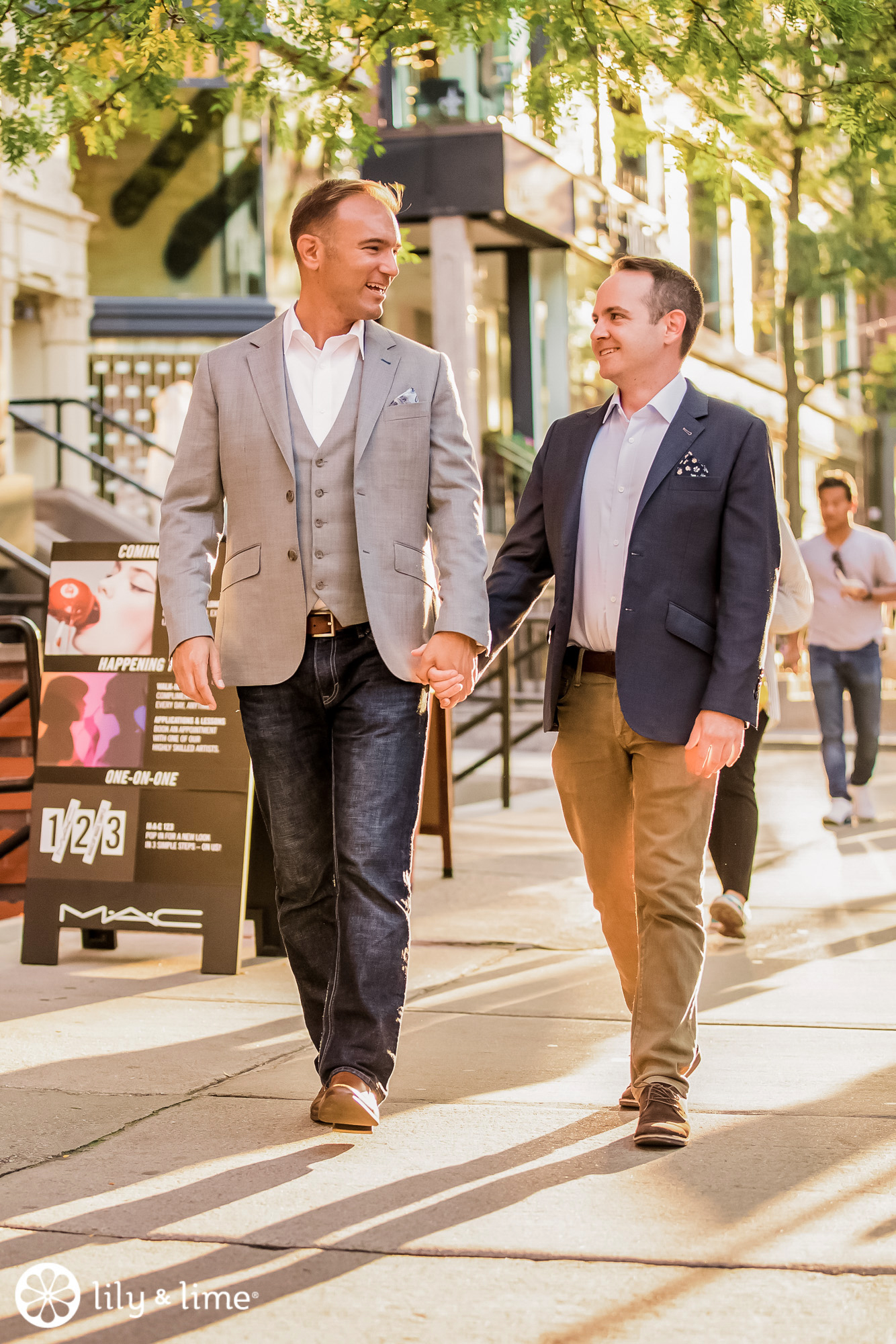 One of the best things to do in the fall is to take a stroll in a downtown area (no smells, cozy sweaters, crisp air). We love the way Colin and Erik embraced this quintessential fall activity for their photo shoot.