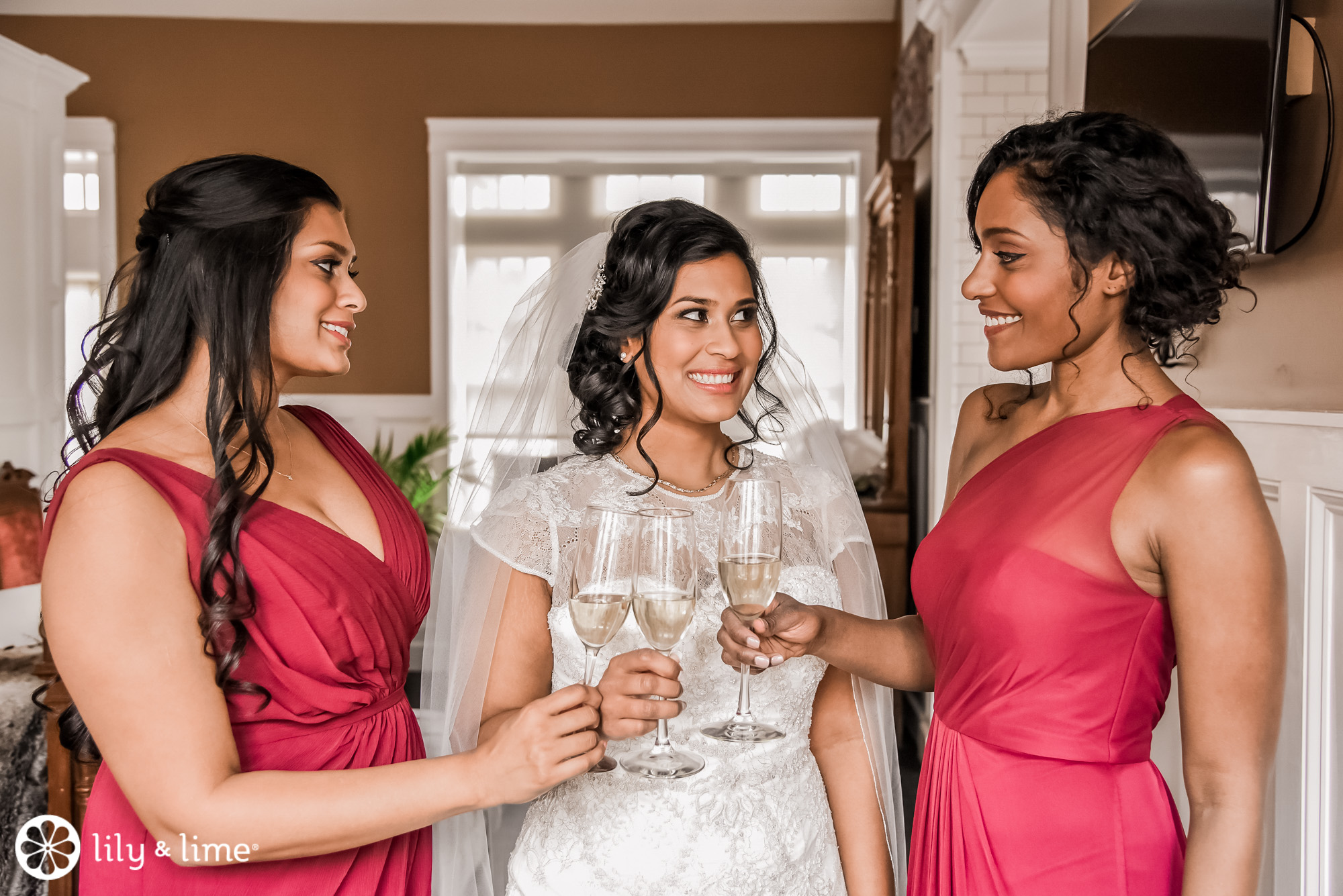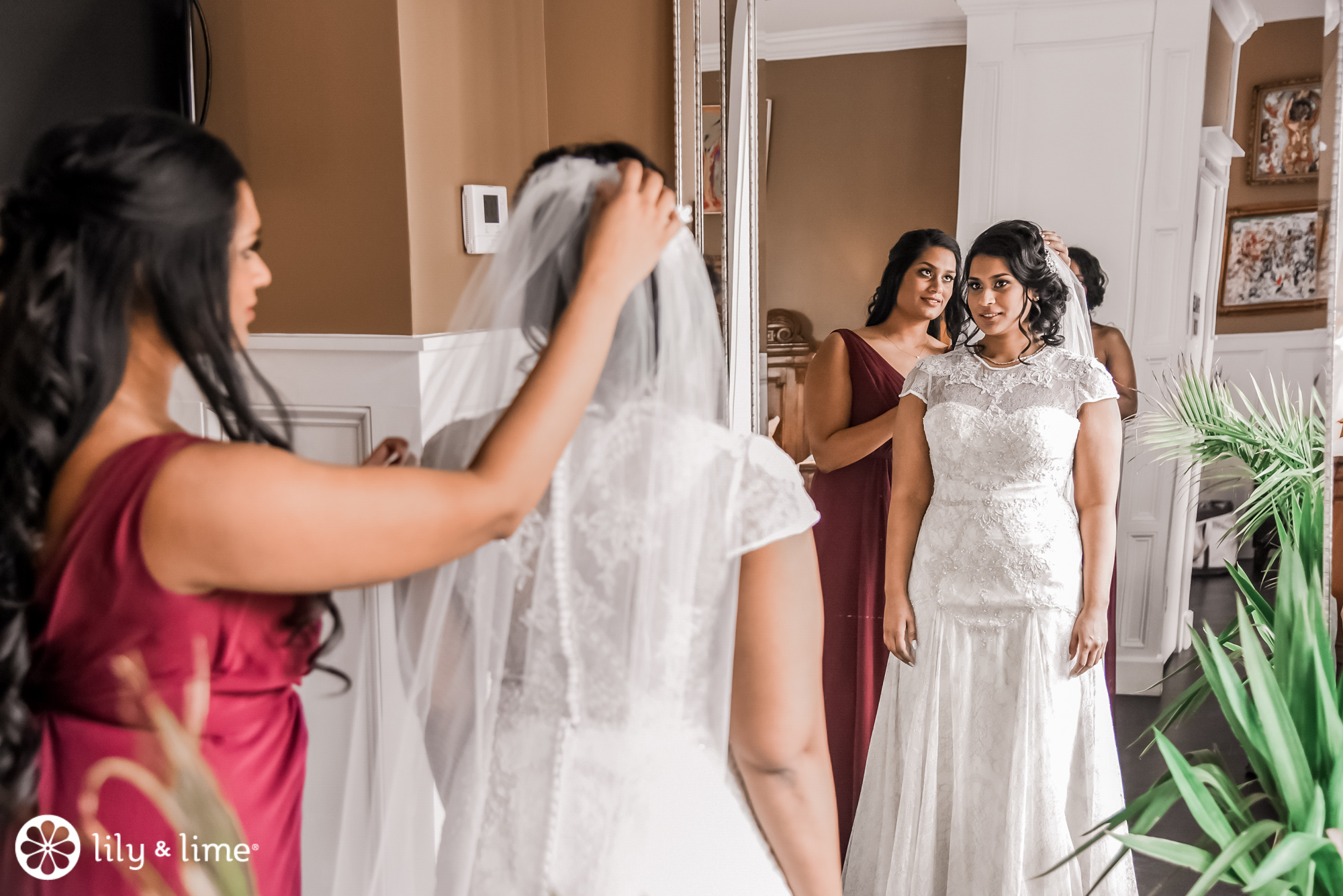 Hannah didn't rely on her short-sleeved lace dress to keep her warm for her winter wedding. The bride added a bridal wrap in white faux fur to keep her cozy for outdoor photos. The bridesmaids complemented this look with grey faux fur wraps that paired nicely with their burgundy dresses.