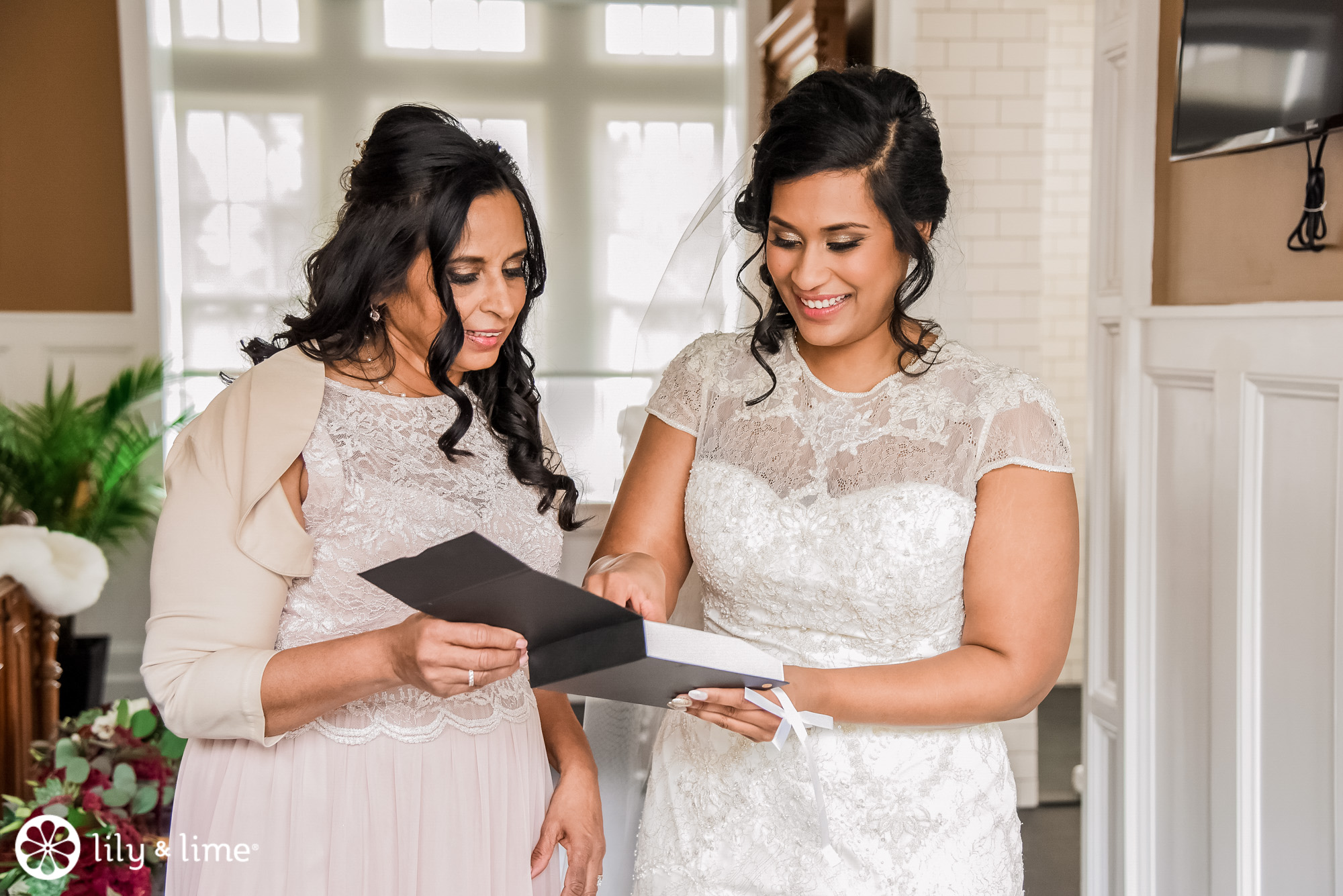 For her big day, Hannah chose a stunning lace dress paired with a cathedral length veil. She added an elegant hairpiece to complement her look. Hairpieces can be great, especially when the bride is wearing a long veil because it allows you to ditch the veil for more freedom while still giving your hair a little something special.