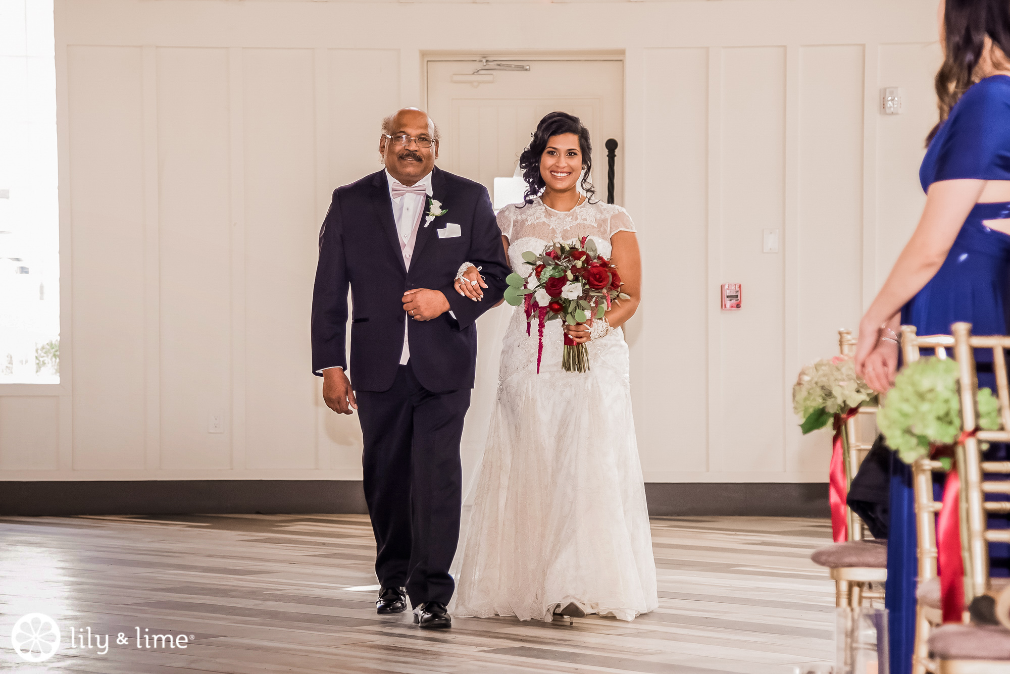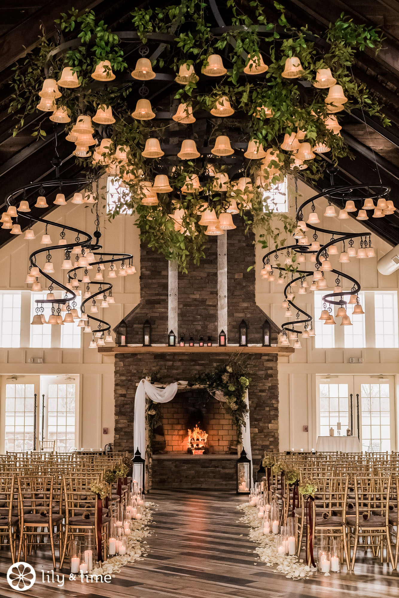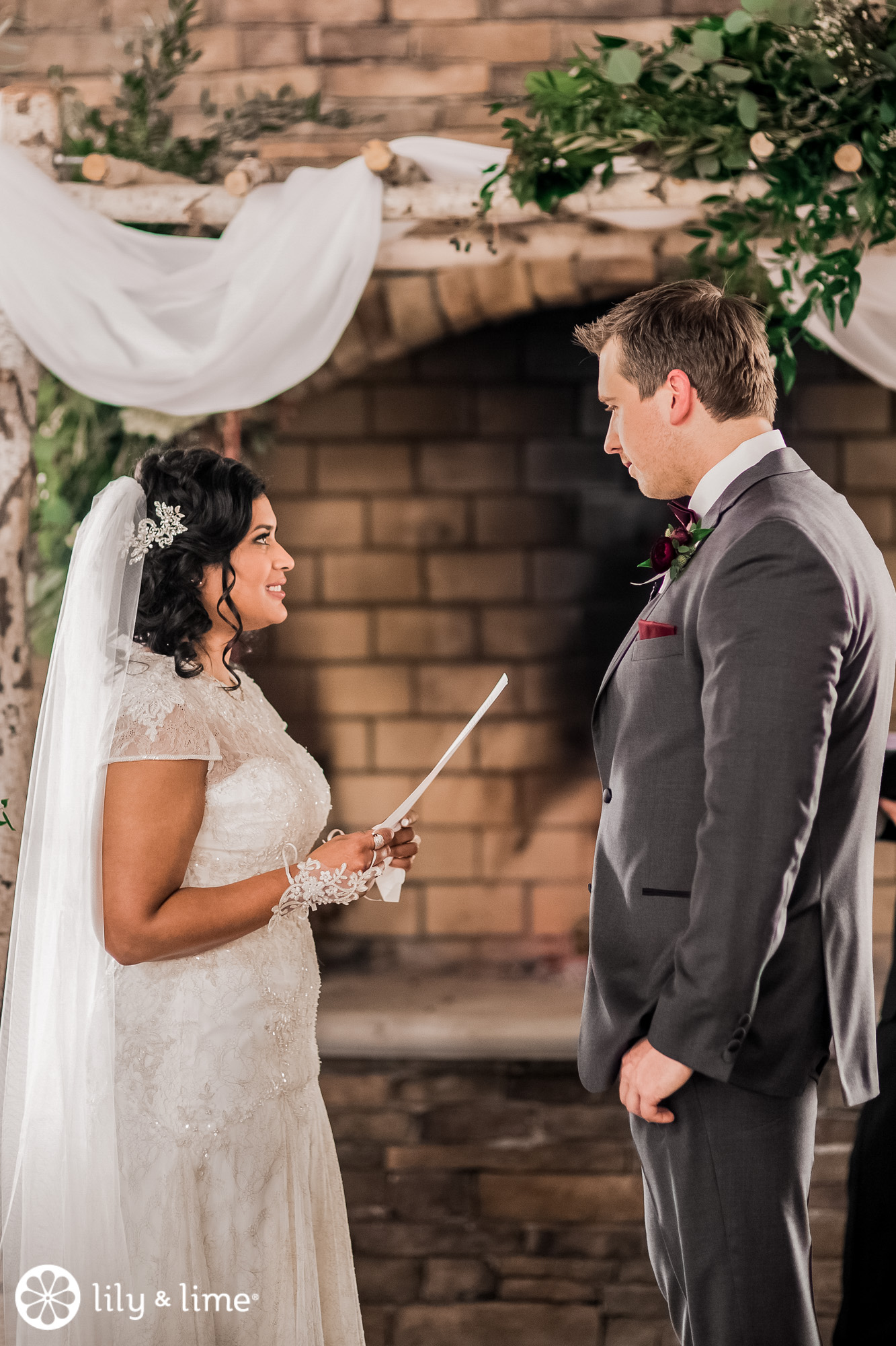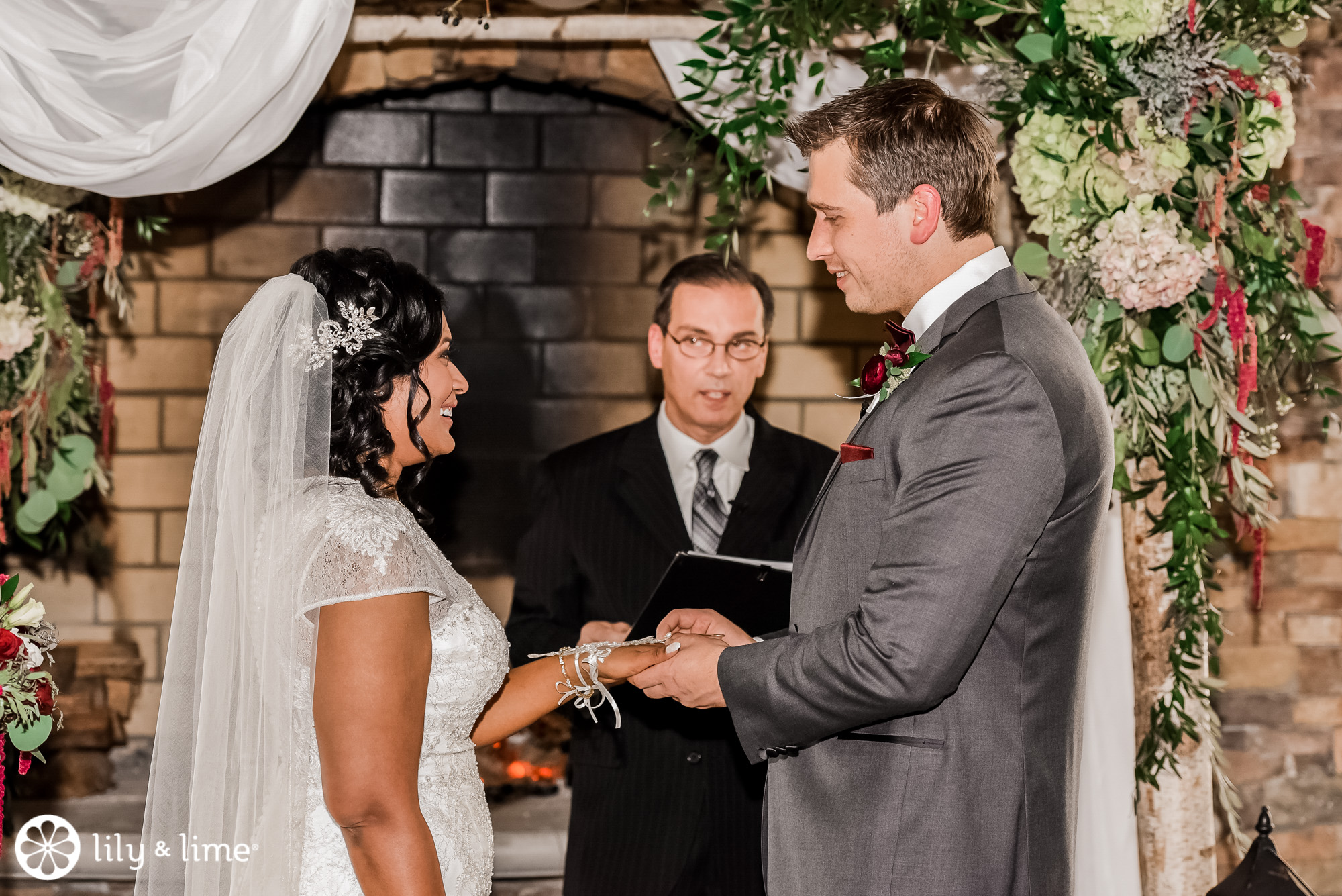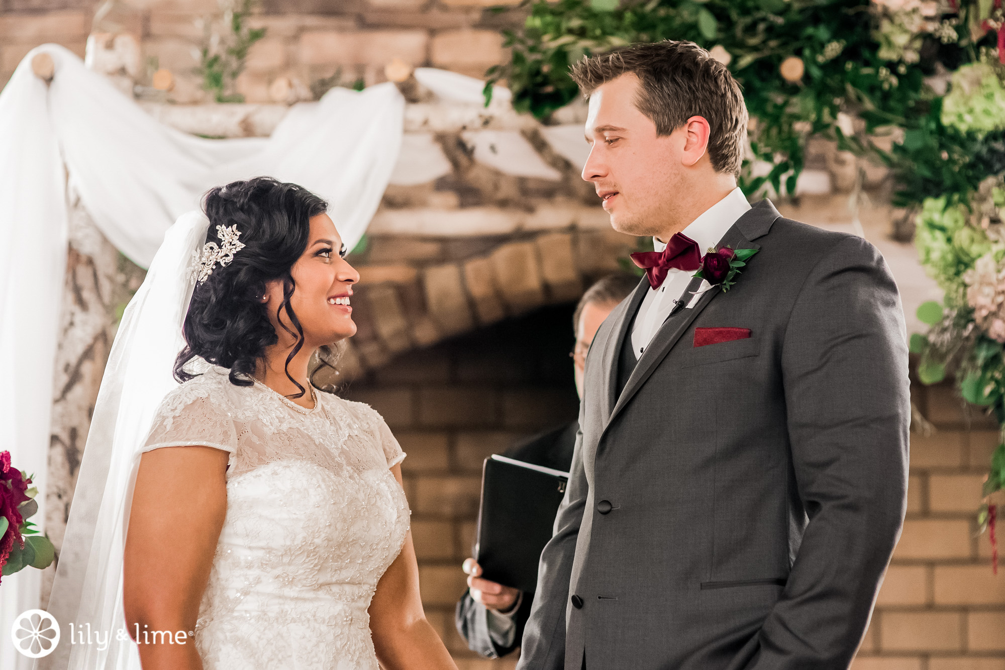 The couple knocked it out of the park when it came to the ceremony and reception decor. This wedding is everything you need for December wedding inspiration. The ceremony space was made warm and inviting by lush elements of greenery and touches of burgundy that lined the aisle. They had a whimsically rustic ceremony arch that looks lovely in the close-up shots for their ceremony.