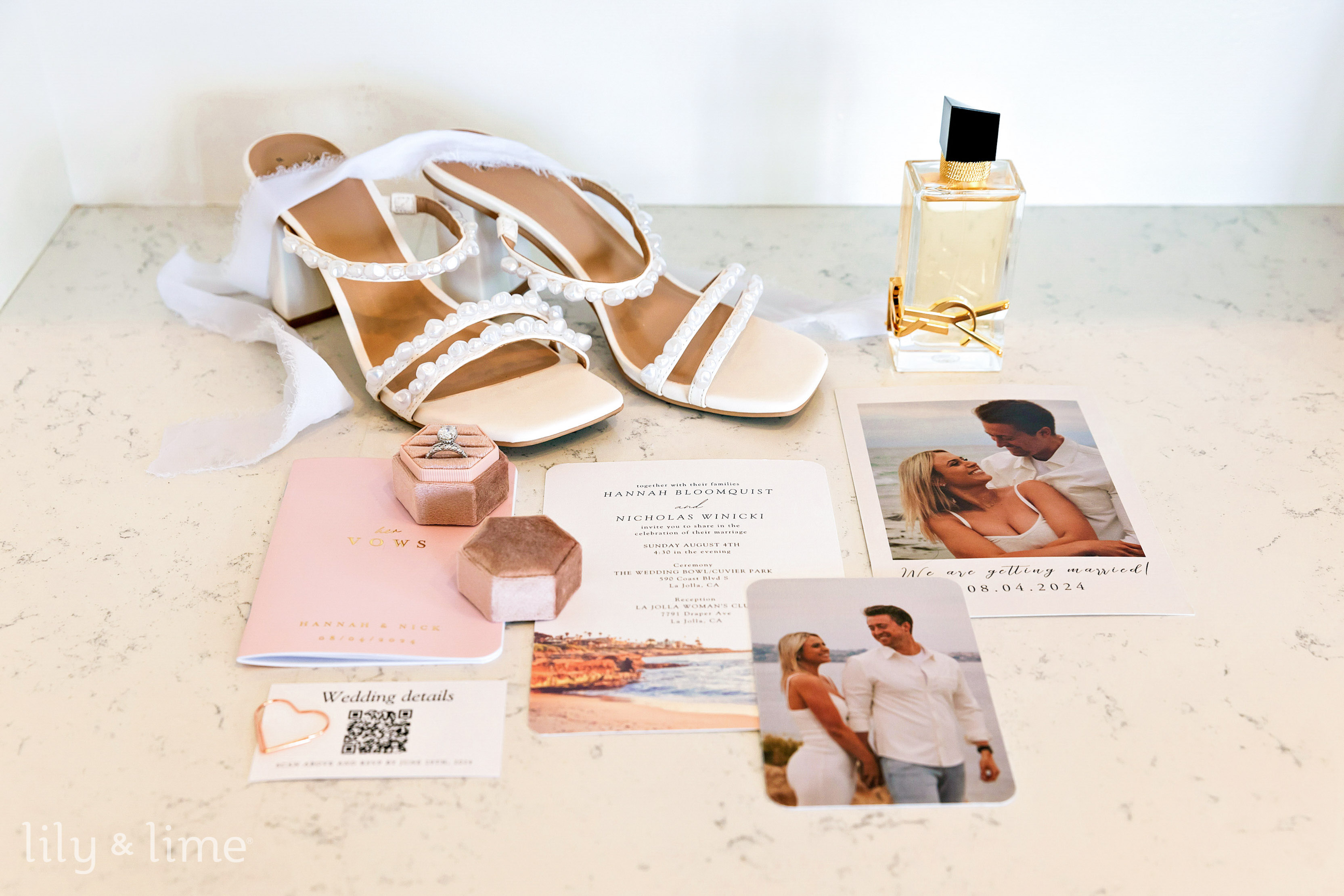 The morning of Hannah and Nick's wedding day in San Diego started with a serene excitement. Hannah began her preparations surrounded by her closest friends and family, her bridal suite filled with laughter and anticipation. She slipped into her wedding dress, a breathtaking white gown featuring a plunging neckline, delicate lace details, and a fit-and-flare silhouette that perfectly accentuated her elegance. Her look was completed with a classic bridal updo, a flowing veil, and a cascading bouquet of white flowers touched with blush and cream, embodying timeless beauty.