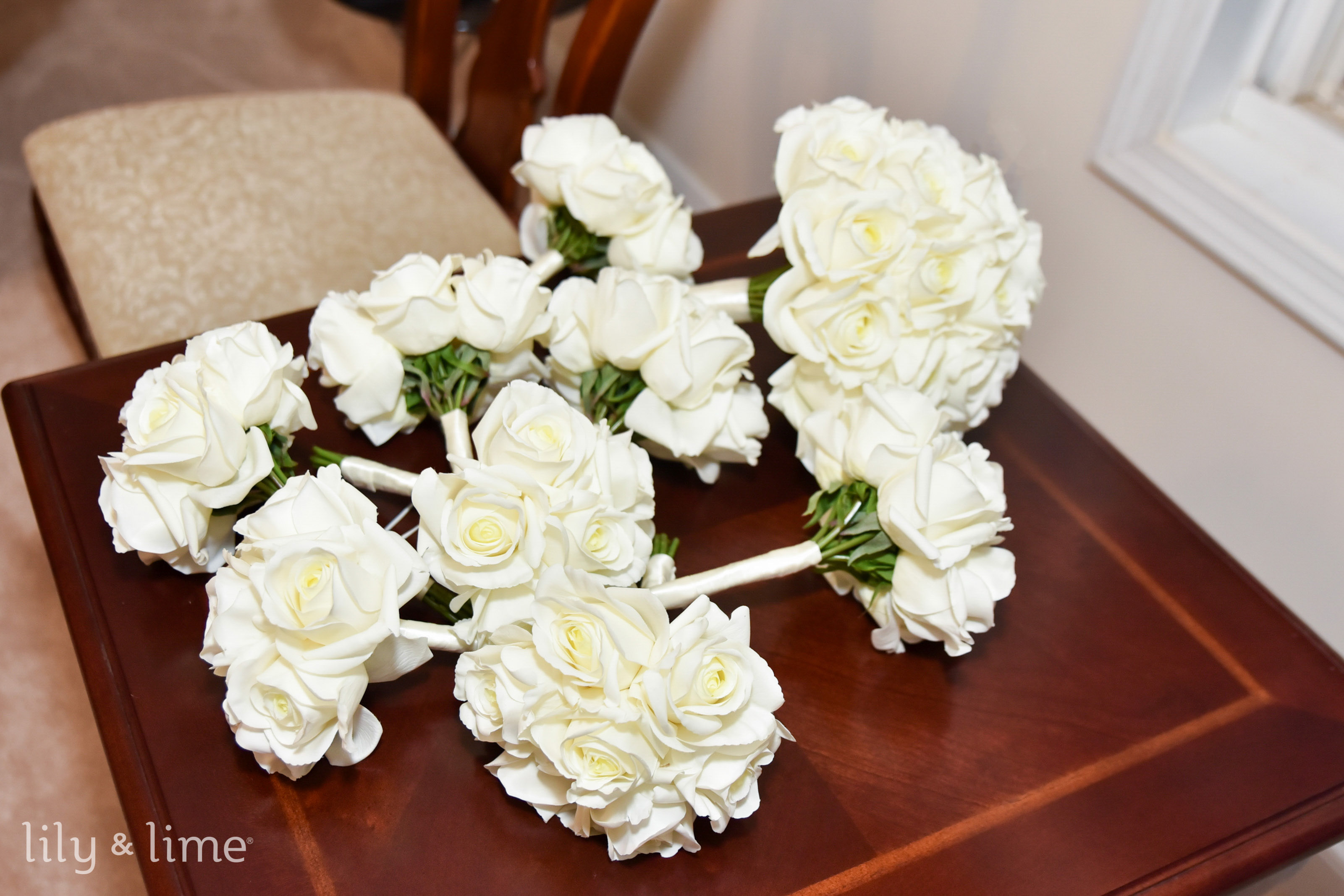 The first day of Josh and Sarah's wedding in Charlotte began with a tranquil morning as the bride, Melissa, prepared for her special day. She transitioned from a delicate white bridal robe into a stunning A-line wedding dress, complete with a simple design and detachable translucent sleeves. Her bridal look was beautifully complemented by a veil, a romantic updo, and a simple bouquet of white roses. Her bridesmaids surrounded her in silky robes of a champagne hue, later changing into mauve pink and champagne dresses that varied in silhouette, creating a harmonious mismatched look.