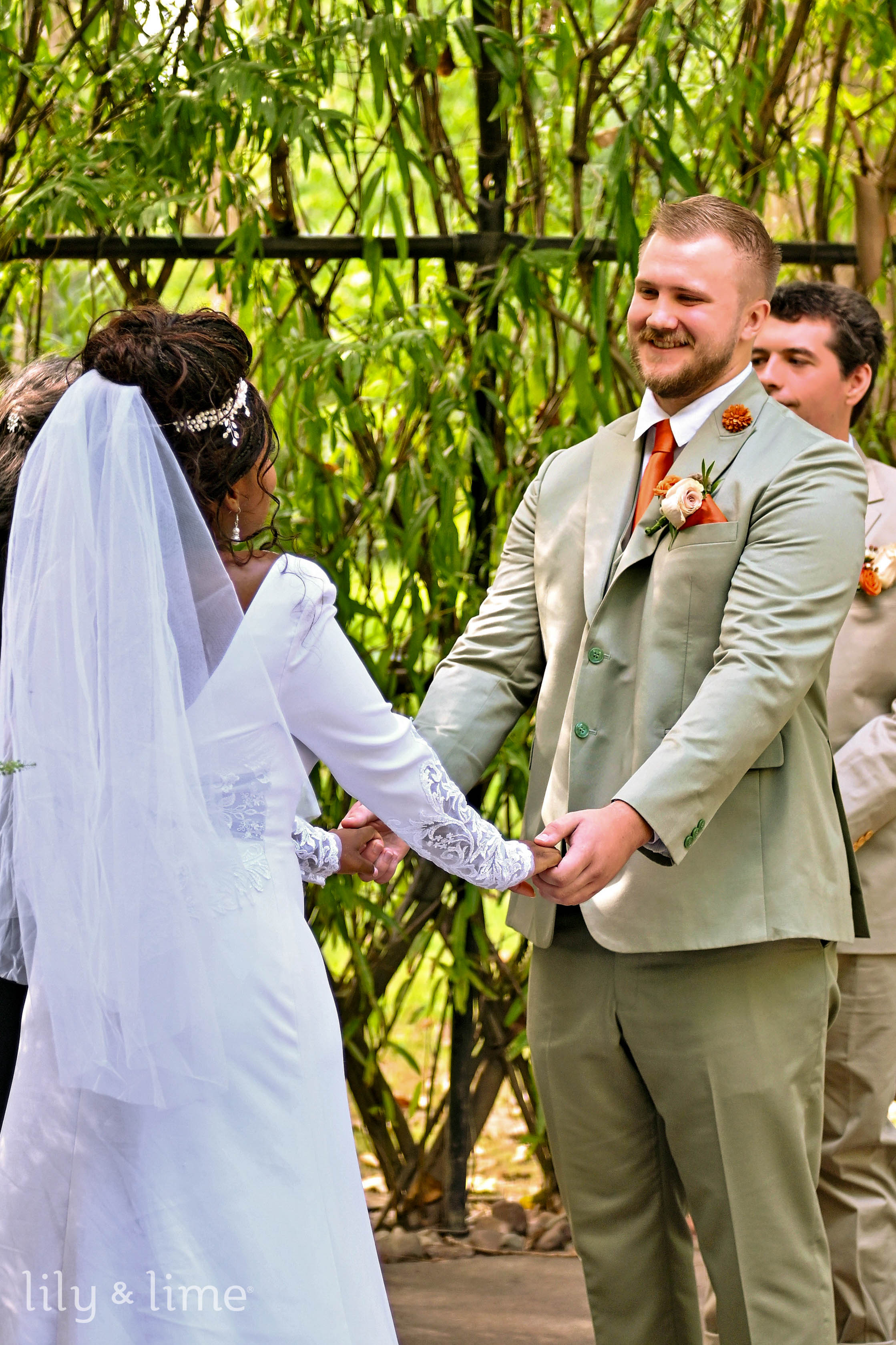 Their wedding party beautifully complemented the couple's style. The bridesmaids were radiant in a mix of sage green and terracotta dresses, carrying bouquets that mirrored Nikita's, while the groomsmen looked sharp in stylish beige suits. The ceremony unfolded in a breathtaking garden venue, where an abundance of natural greenery created a lush, living backdrop. The decor was simple yet elegant, allowing nature's beauty to take center stage. Every moment was filled with emotion, from Jyra’s first look at Nikita to their heartfelt vows, all documented through poignant wedding ceremony photographs.