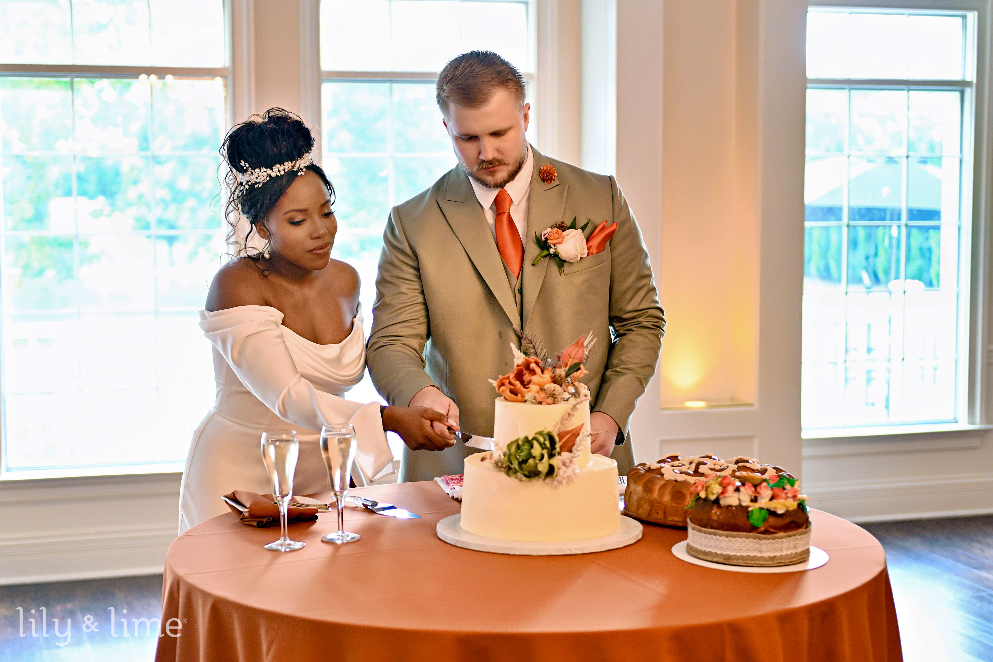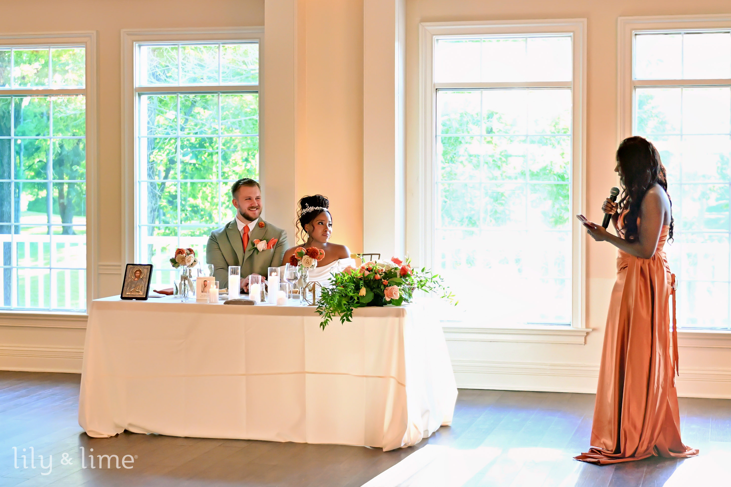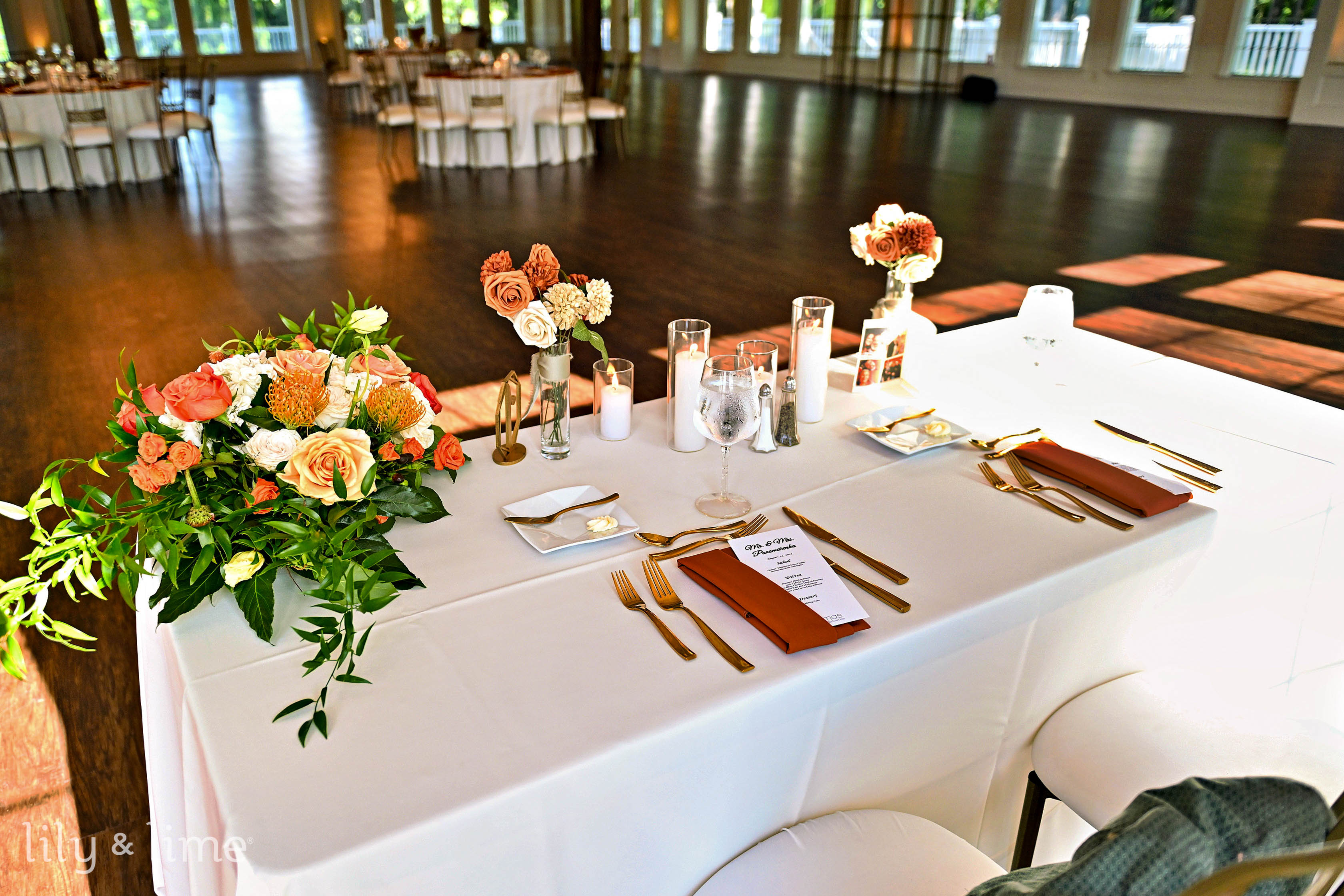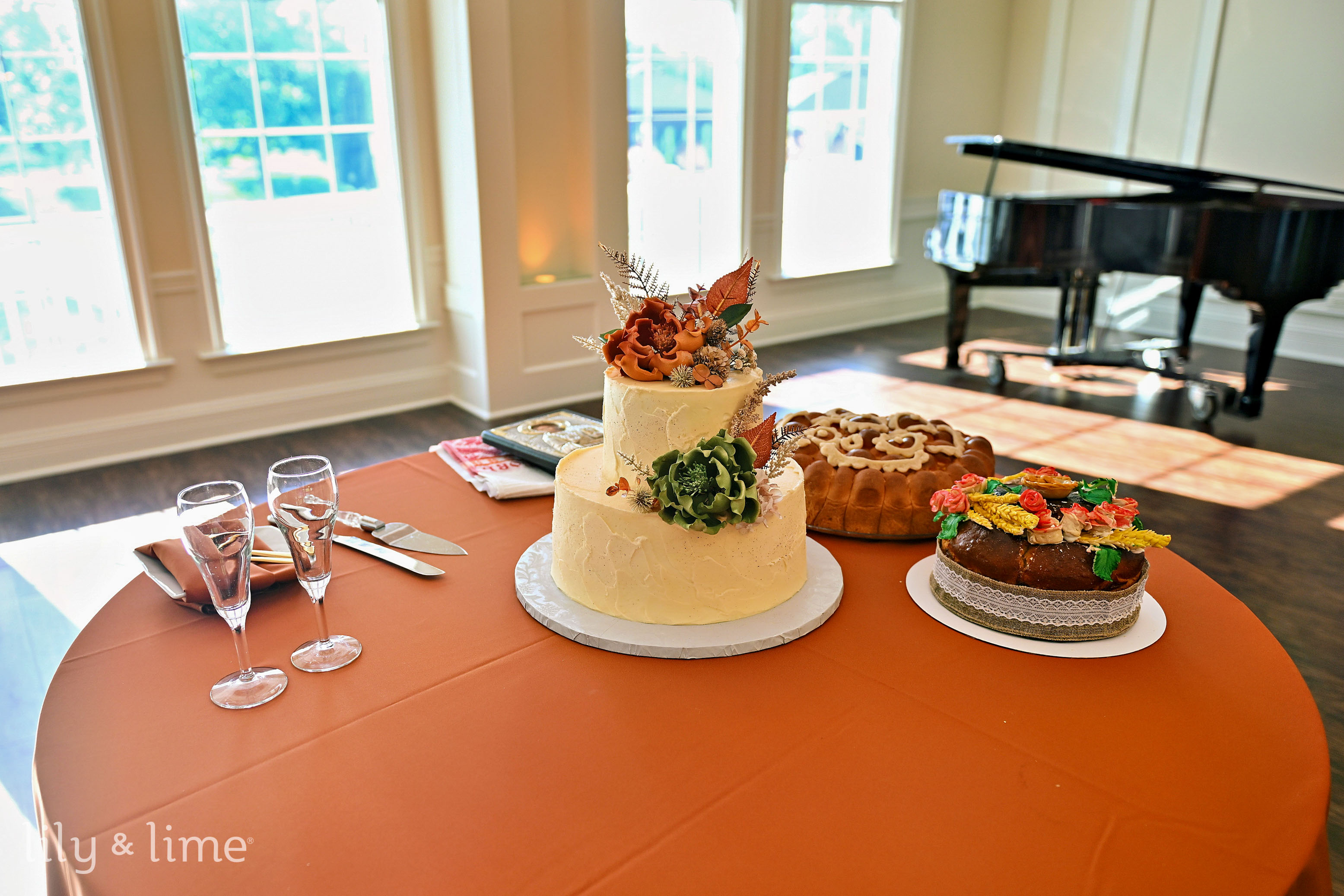 The celebration continued with an afternoon reception in an elegant indoor space. The room was aglow with white column candles in glass holders and crystal chandeliers that cast a warm light on the wooden flooring. Tables were adorned with rust and green floral arrangements and settings that matched the wedding's color palette. The reception was a whirlwind of joy, with our team capturing key moments like the heartfelt toasts, the sweet cake-cutting, and a first dance that was pure magic. The dance floor was alive with energy, concluding a perfect day. This Indianapolis wedding was a unique and beautiful affair, a testament to Jyra and Nikita's love, and it was an honor to preserve every cherished memory.
