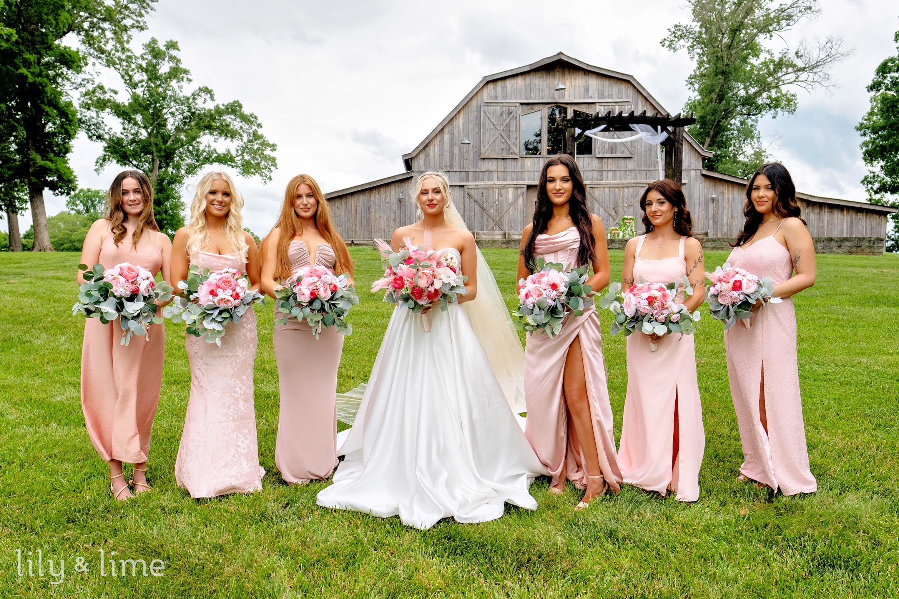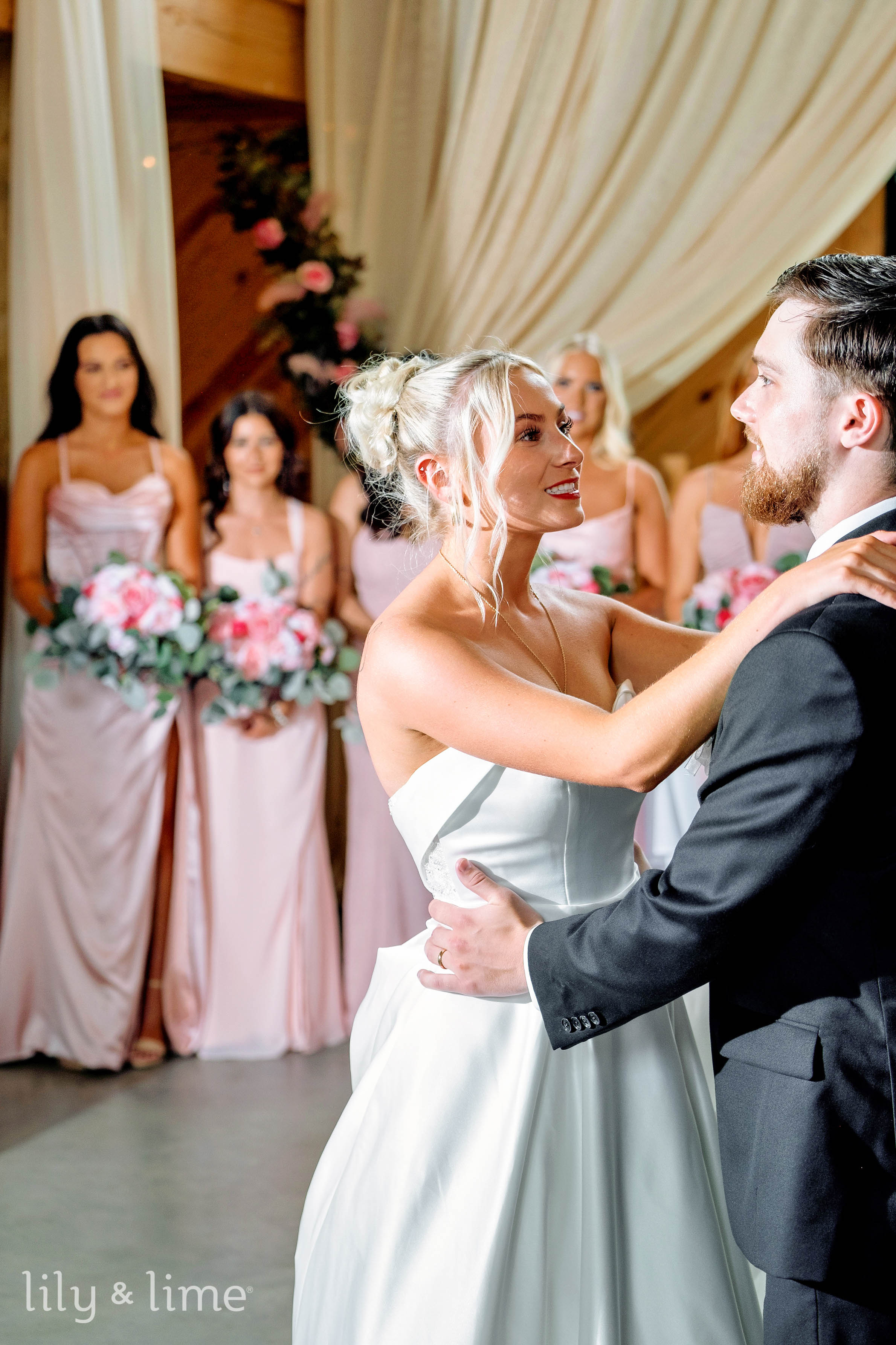 The day’s delicate details were captured in stunning photographs. The photographer artfully showcased the wedding rings, Kailah's elegant bridal shoes, her dress, and the pale pink bridesmaid dresses. Each element spoke to the couple's thoughtful planning and timeless style. Kailah’s bridesmaids wore mismatched pale pink gowns in varied silhouettes, achieving a cohesive yet unique look. The groomsmen, mirroring Michael's polished style, wore matching black suits with pink ties, creating the perfect balance of elegance and charm.