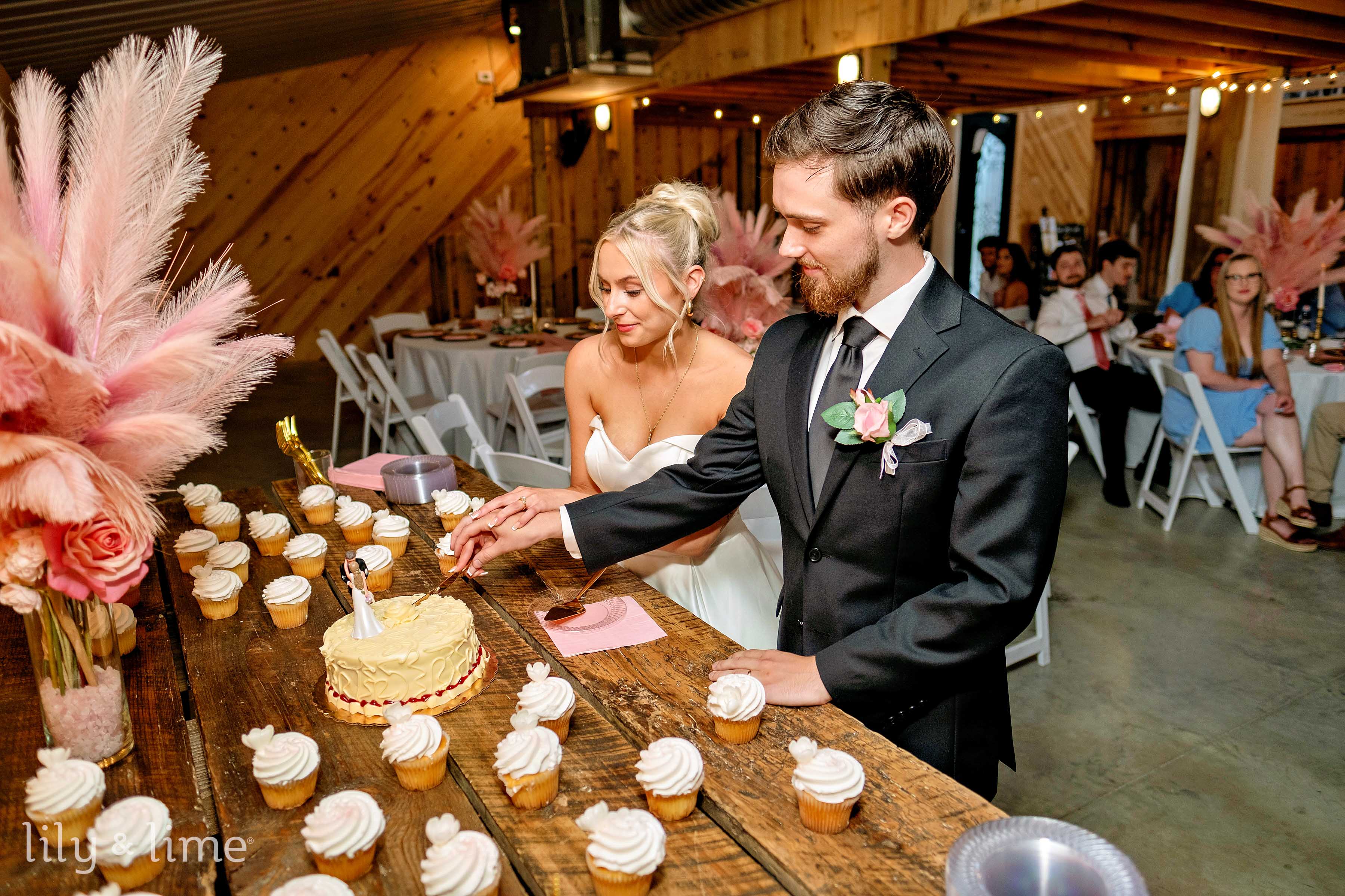 After being pronounced husband and wife, the newlyweds shared their radiant smiles with their bridal party and guests during a session of group and couple portraits. The reception that followed was nothing short of magical. Set in a rustic barn venue, the space was transformed into a wonderland of elegance. Twinkling fairy lights draped the interior, while soft white and pink accents adorned the tables. Greenery added a fresh, natural touch, blending seamlessly with the dreamy decor. The sweet table was a centerpiece in itself, offering an array of cupcakes alongside the couple’s single-tier wedding cake topped with custom figurines that reflected Kailah and Michael’s playful yet classic style.
