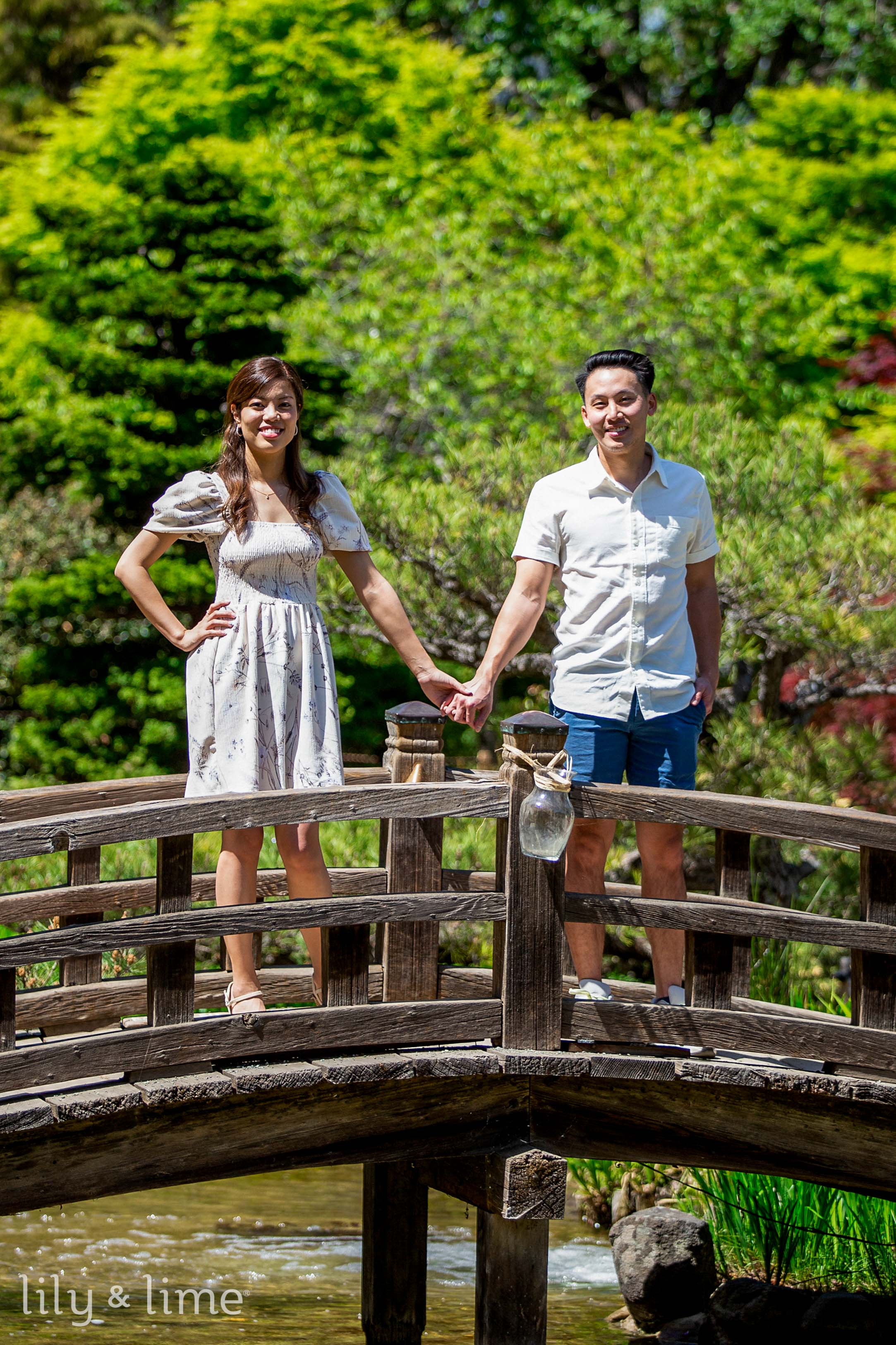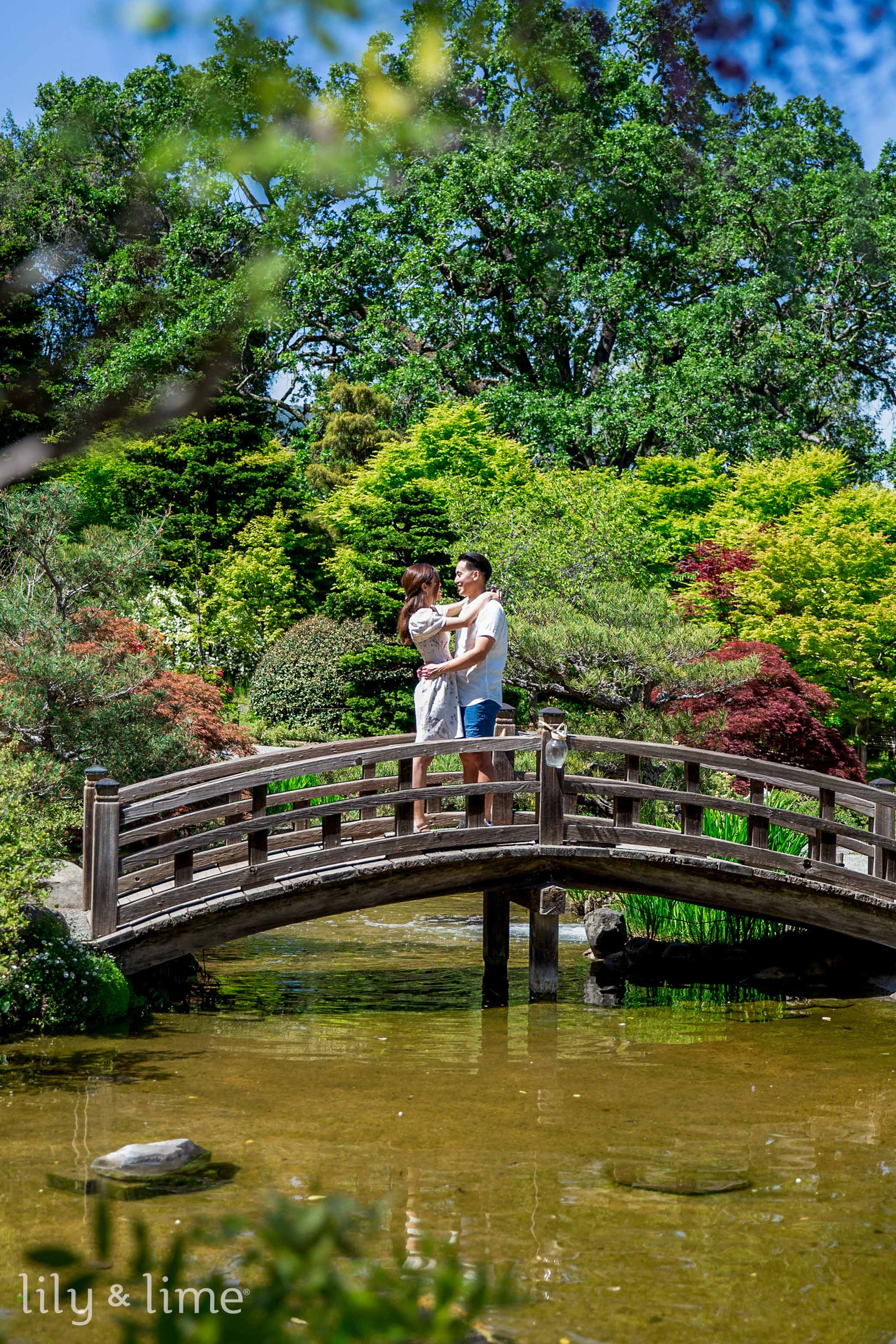 For the day, initially, our couple wanted to start with the bonsai trees. Kana and Alvin loved the colorful hues of the photo spot, and they loved this space. But before they could get to the spot with bonsai, and the towering trees, they decided to have a few photos taken on the cute Japanese bridge. The delicate nature of the garden made the photos look even better. Our photographer asked the two to walk on and get on the bridge and strike a few poses for the camera. Keeping their distance, our engagement photographer decided to direct the photo poses from far. Our photographer made sure to capture the bright green trees in the backdrop, which added a beautiful frame to their photos. The photos on the bridge capture the beauty of the couple beautifully. They held hands as they looked into each other’s eyes, they took a photo of them hugging each other, and the last one on the bridge was a heartfelt photo of these two embracings each other and looking romantically into each other’s eyes.