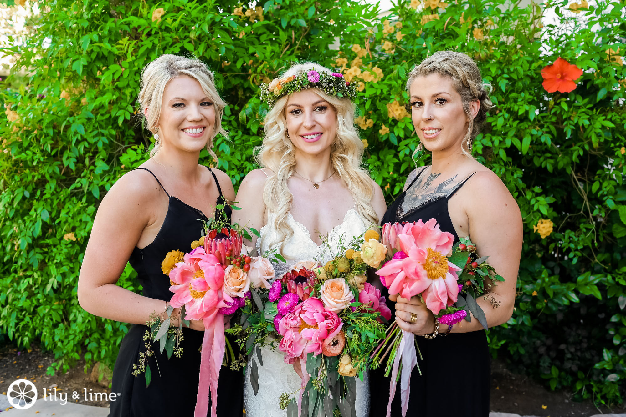 And Katherine’s bridal bouquet had us dreaming of the tropics with its vibrancy and bright colors. The bouquets contrasted exquisitely with the black bridesmaids’ dresses and the groomsmen’s tuxedos.