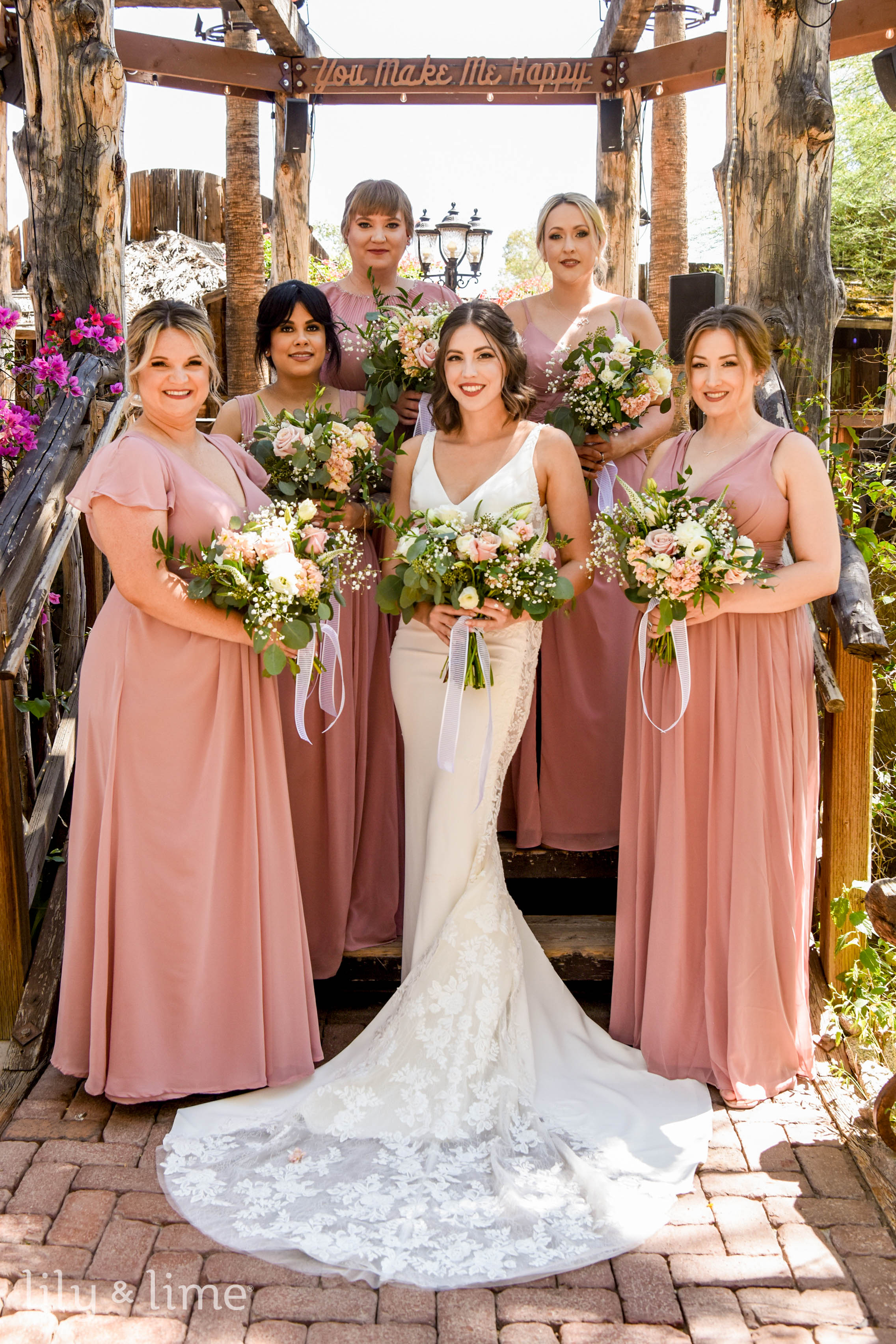 The wedding party, in matching blush bridesmaid dresses, carried bouquets of roses that mirrored Kristen's, while the groomsmen sported formal black suits, creating a well-coordinated and elegant wedding party. Each member of the party added to the day's flair, their outfits harmonizing beautifully with the venue's rustic and botanical charm.