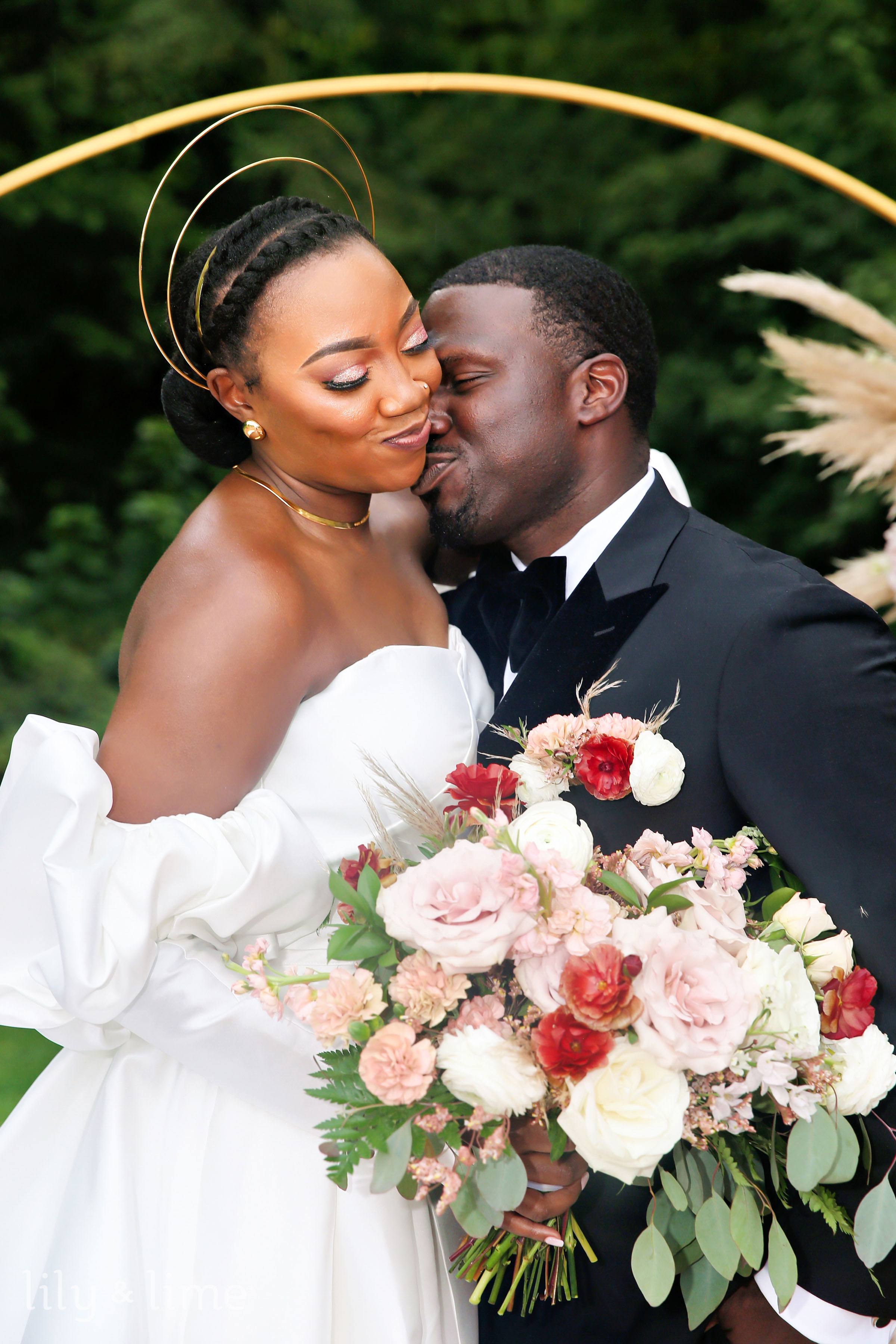 Kristi and Sheriff’s wedding day in Washington, D.C., was nothing short of magical. The day began with Kristi getting ready, surrounded by her closest friends and family. She stepped into her wedding dress, a crisp white masterpiece featuring a plunging neckline, fit and flare silhouette, pleated overskirt, and puffy sleeves. Her elegant bridal updo was adorned with a gold headpiece, and her gold jewelry added a touch of sophistication. She clutched a bouquet of white, pink, and orange flowers that complemented her radiant look—the perfect blend of timeless and modern.