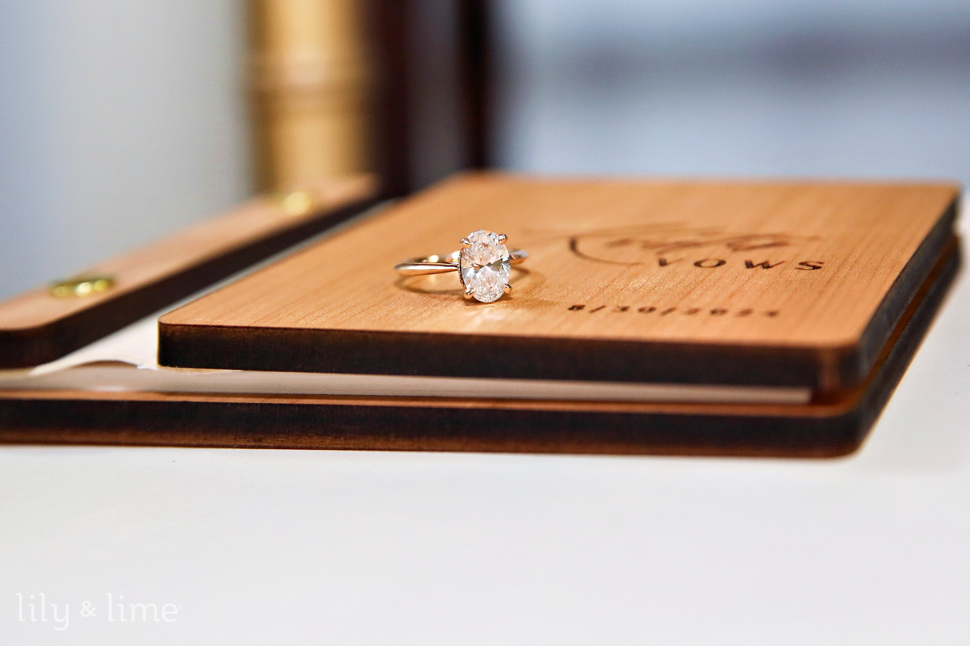 Meanwhile, Sheriff prepared for his big day in a dapper gray formal suit with black lapels. Completing his polished look was a crisp white shirt, gray pants, a black bow tie, and a delicate floral boutonniere pinned perfectly to his lapel. Their wedding details were captured in exquisite shots that included Kristi's bouquet, wooden vow books, and their shimmering rings. Kristi's bridesmaids were a vision in velvet moss green dresses, each in a unique silhouette, creating a perfect mismatched yet harmonious look. The groomsmen mirrored the elegance of the event in their black formal suits, white shirts, and pink bow ties, effortlessly tying into the overarching wedding theme.