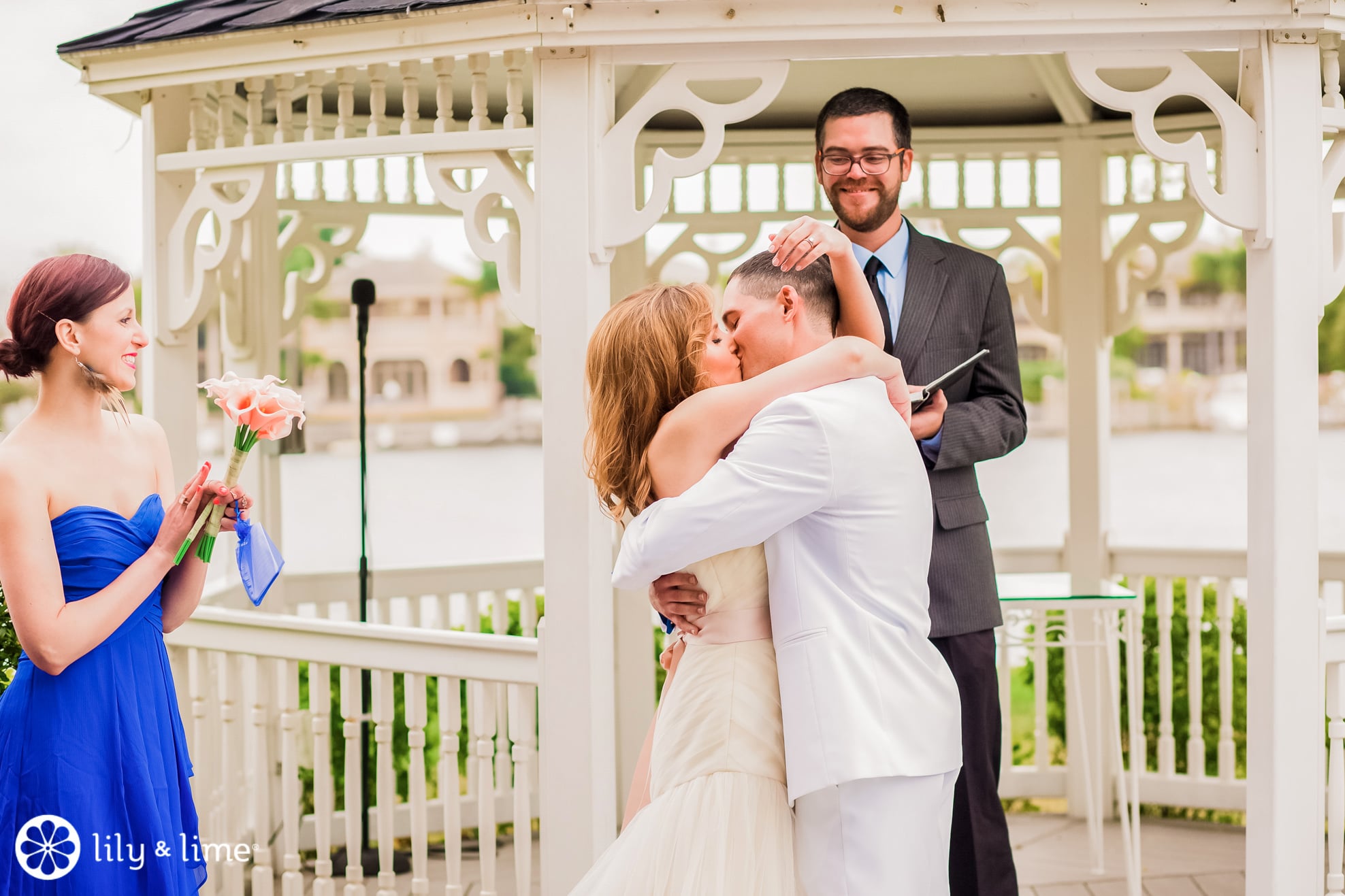 Kristina and Brett’s outdoor ceremony was quaint and romantic, replete with string lights and waterfront views. For the bouquets, the bride opted for some simple calla lilies. The small cluster of flowers complimented but didn’t compete with the ladies. The couple looked so happy and in love on the garden club grounds. Their genuine happiness made for lots of great photo ops. The variety of the grounds provided for a lot of different backdrops as well.