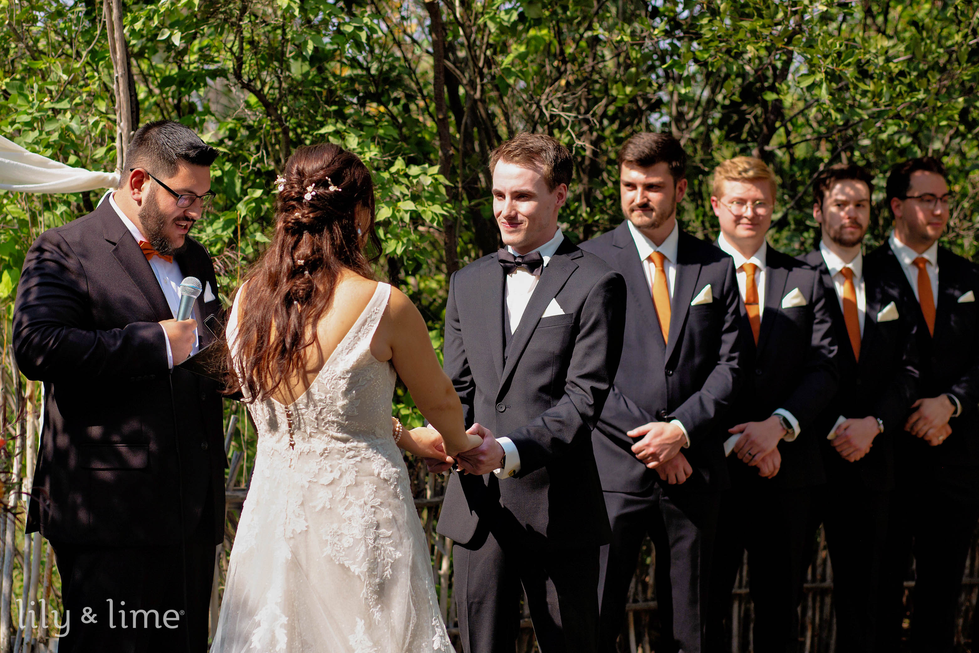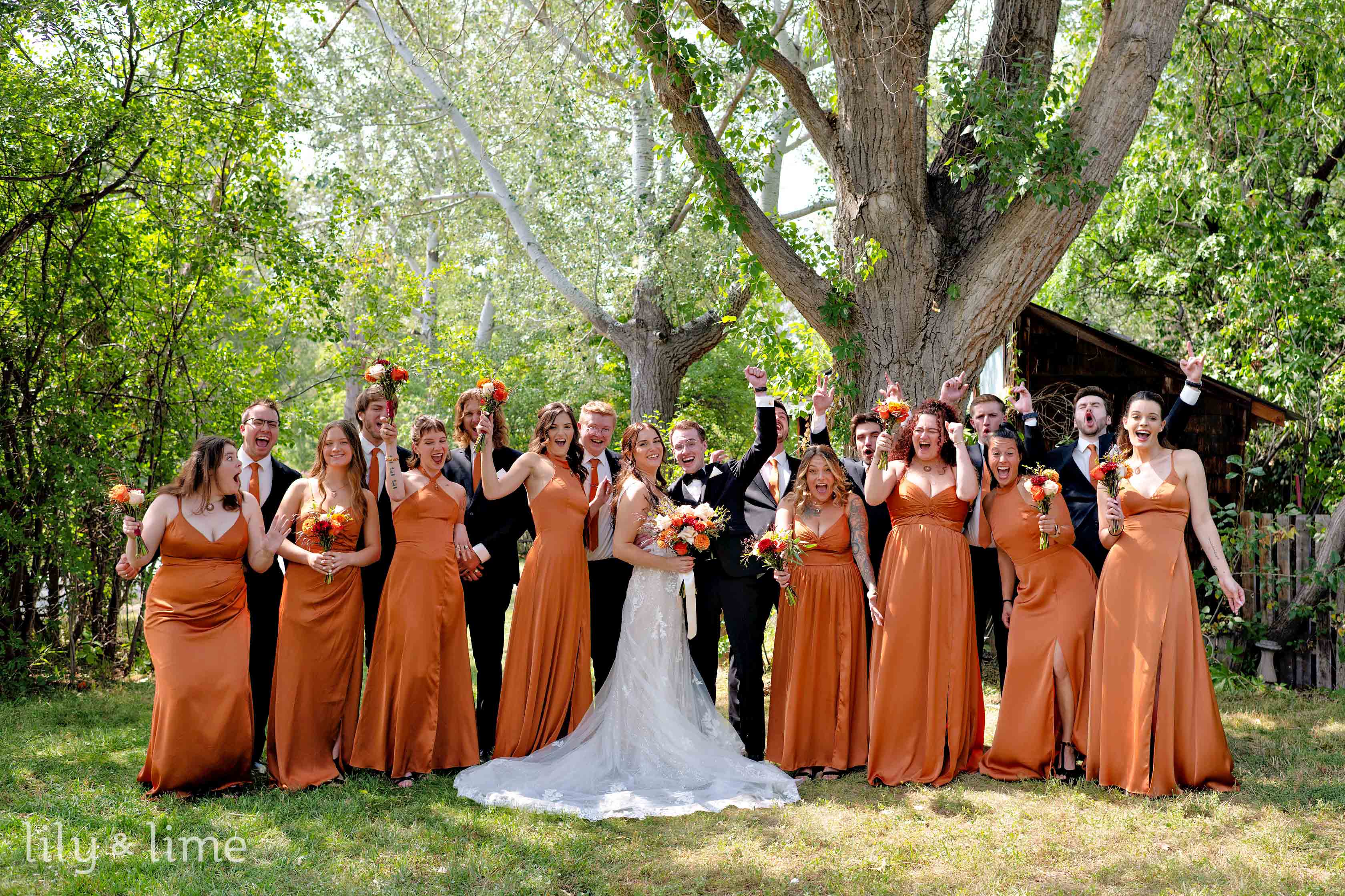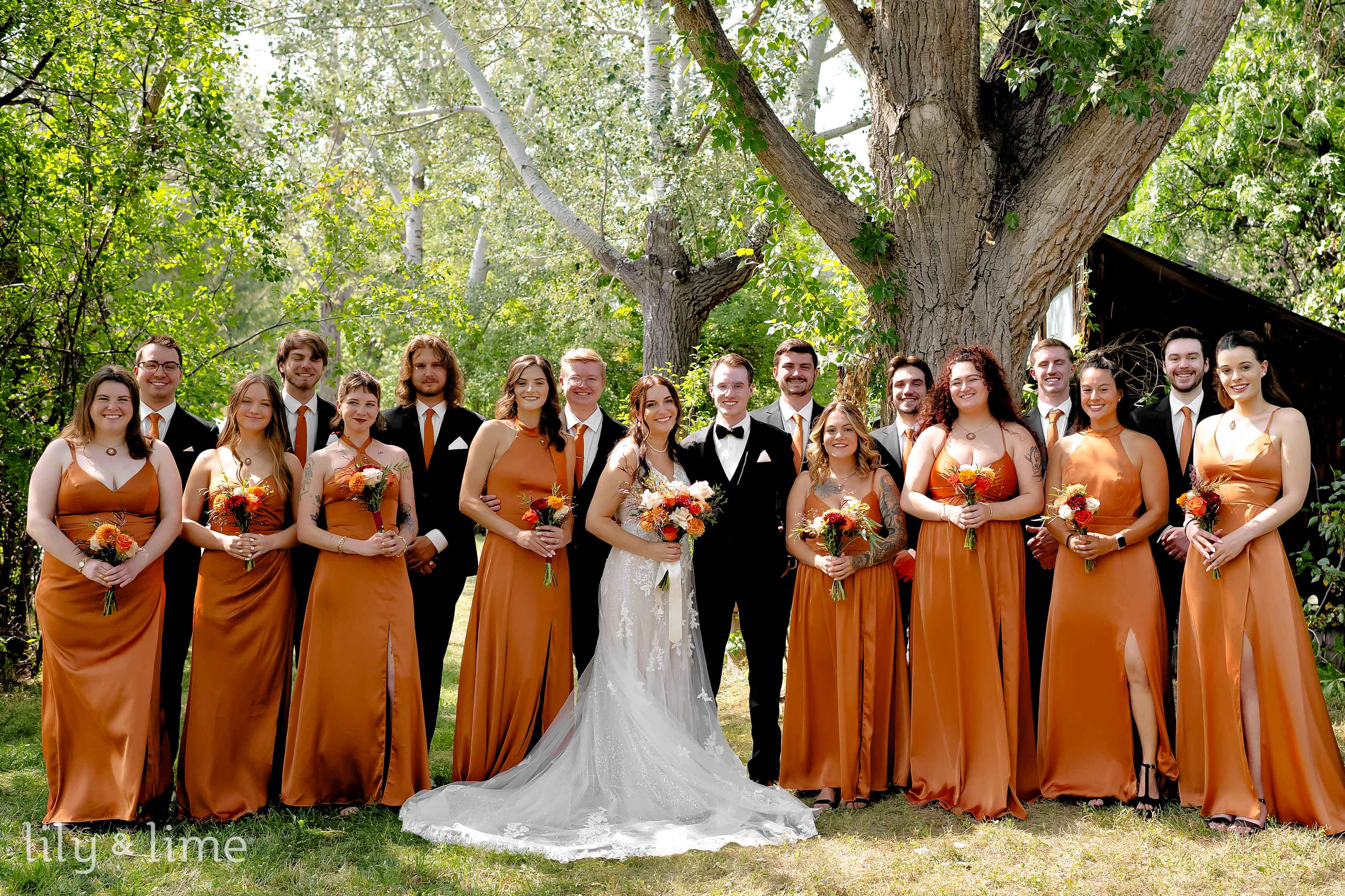 In her bridal suite, Laura and her bridesmaids shared laughter and drinks, creating unforgettable memories in their stylish getting-ready robes—white for the bride and black for her girls. These moments translated into stunning bridesmaid portraits. Similarly, Jack and his groomsmen shared their own moments of camaraderie before the ceremony, resulting in fun and memorable groomsmen portraits. Laura was a vision in a chic A-line wedding dress featuring delicate lace details and a graceful V-neck. Her look was perfected with an elegant open hairstyle, a striking orange and cream wedding bouquet, and soft, neutral bridal makeup. The emotional bridesmaid's first look was a highlight of the morning. Jack was dapper in a classic two-piece black wedding suit, paired with a crisp white shirt and a black silk bowtie. The wedding party’s attire was flawless; the bridesmaids wore stunning rust-orange dresses with matching bouquets, while the groomsmen sported stylish floral wedding suits with orange neckties.