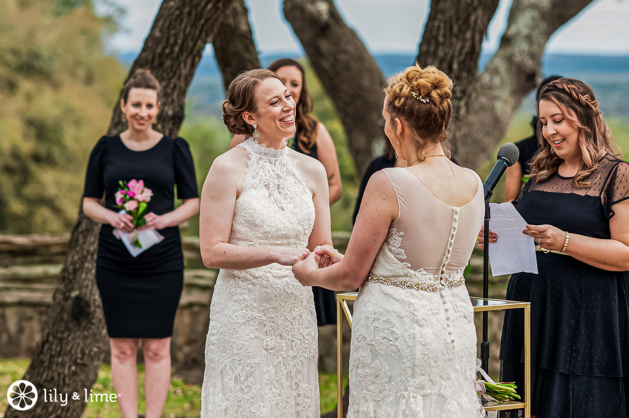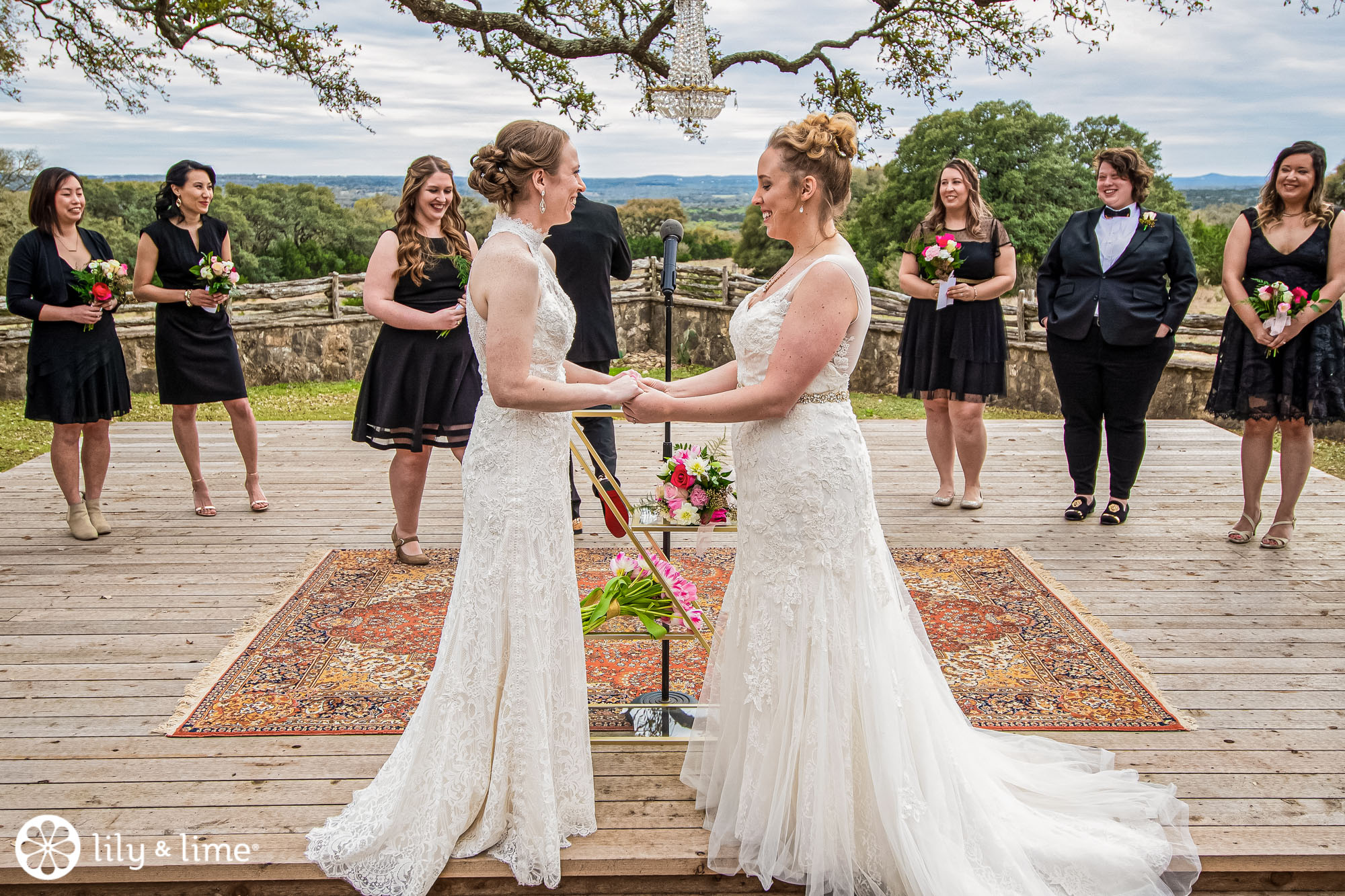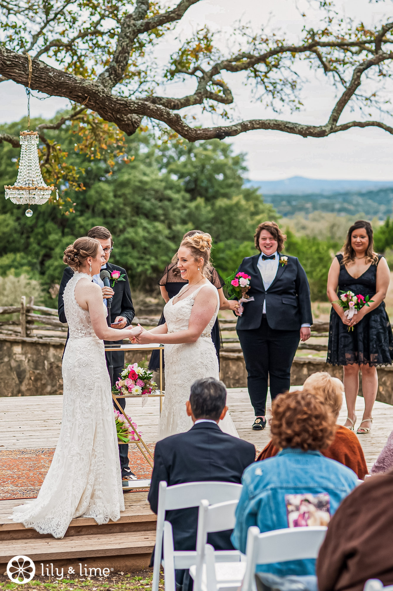 The beautiful Austin wedding venue is located in Wimberly, Texas. The venue is home to over a hundred oak trees surrounding where wedding ceremonies take place. And a bonus? Spectacular views all around the newly-engaged couple, taking vows. And that’s exactly how Lisa and Lindsey’s wedding was.