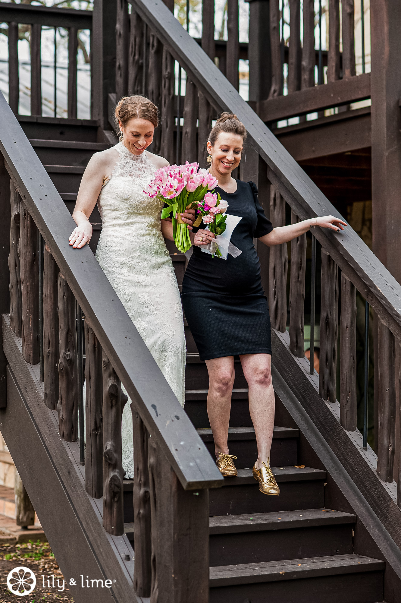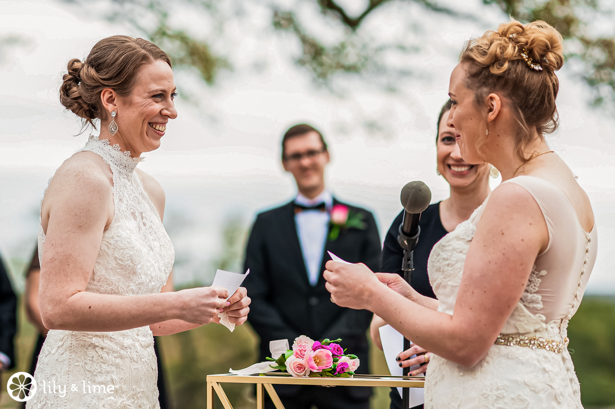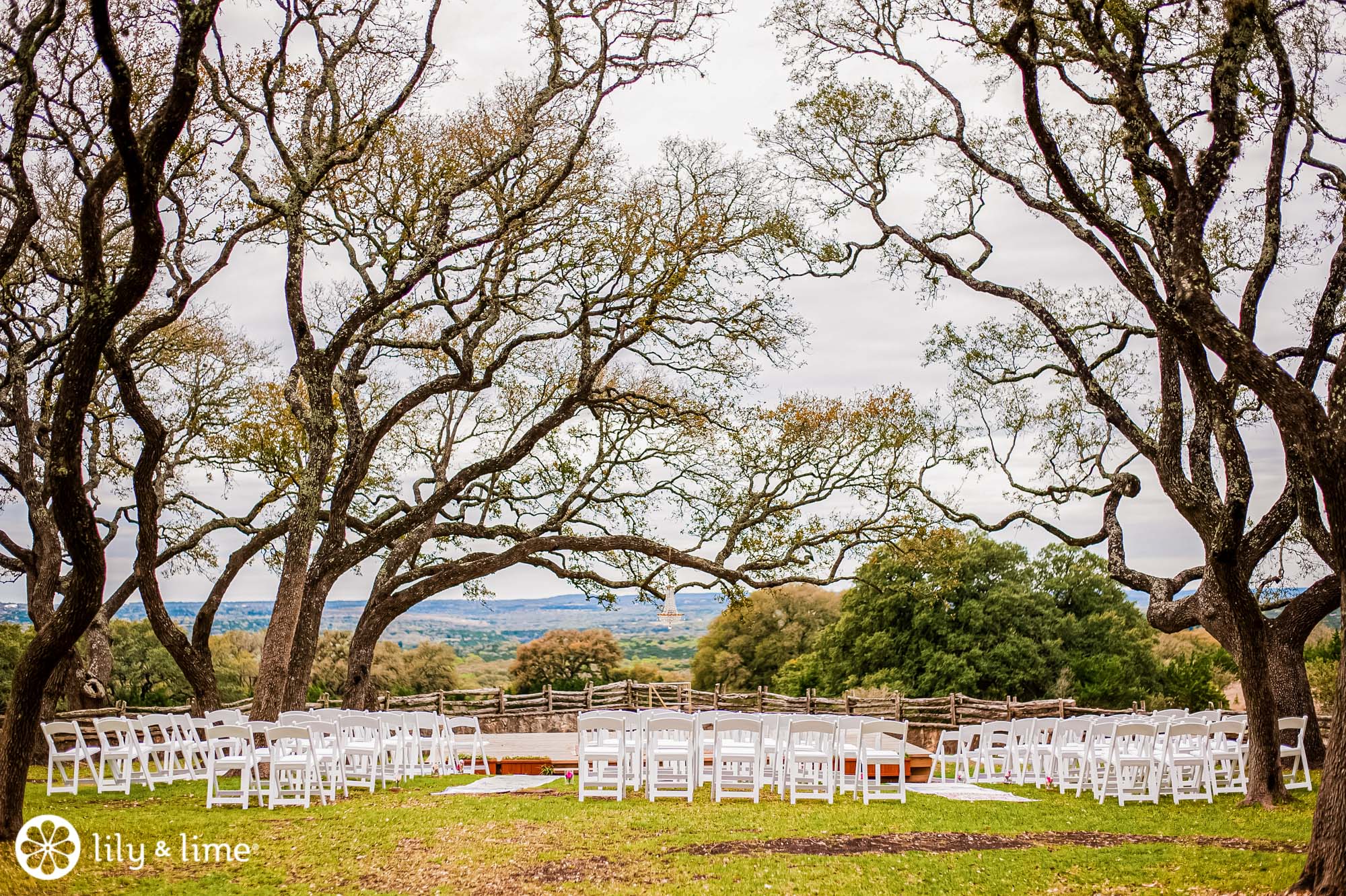 The beautiful Austin wedding venue is located in Wimberly, Texas. The venue is home to over a hundred oak trees surrounding where wedding ceremonies take place. And a bonus? Spectacular views all around the newly-engaged couple, taking vows. And that’s exactly how Lisa and Lindsey’s wedding was.