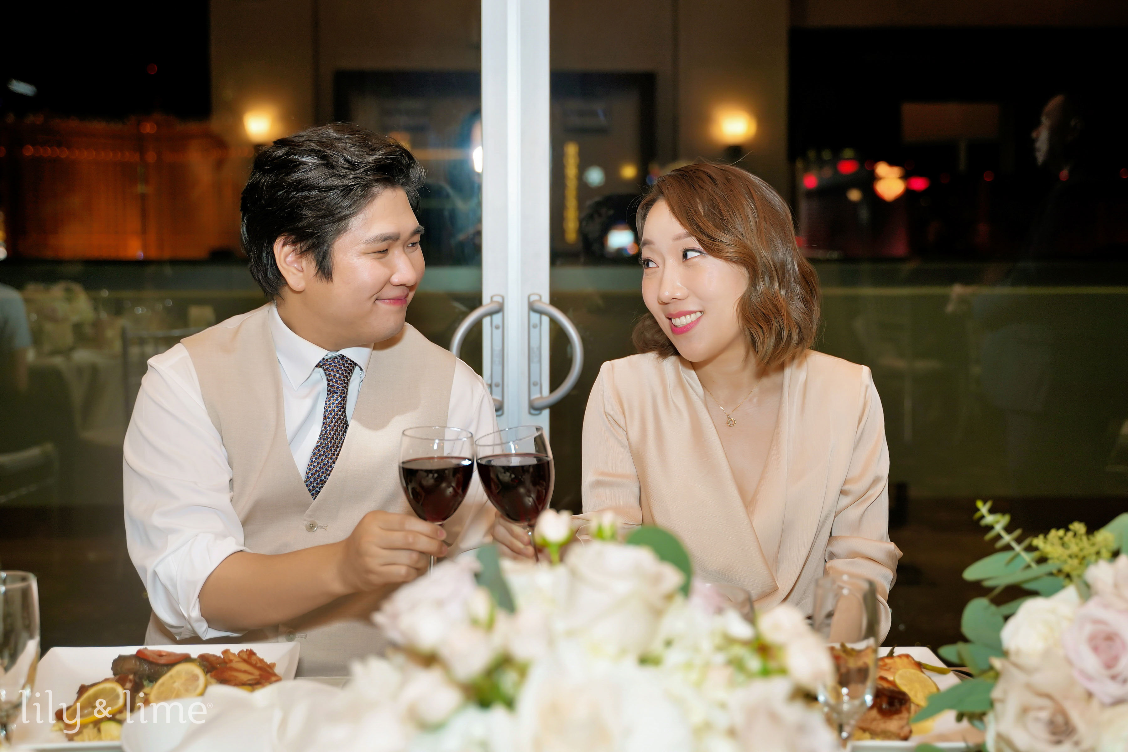The reception’s highlight was an elegant all-white wedding cake, adorned with delicate flower petals. As the bride and groom changed into their reception attire, Jungmi in a chic short wedding dress and Haram in a tuxedo vest, the evening was set for a delightful celebration. The dance floor became the heart of the reception, with several key moments beautifully captured, showcasing the joy and love shared by all.