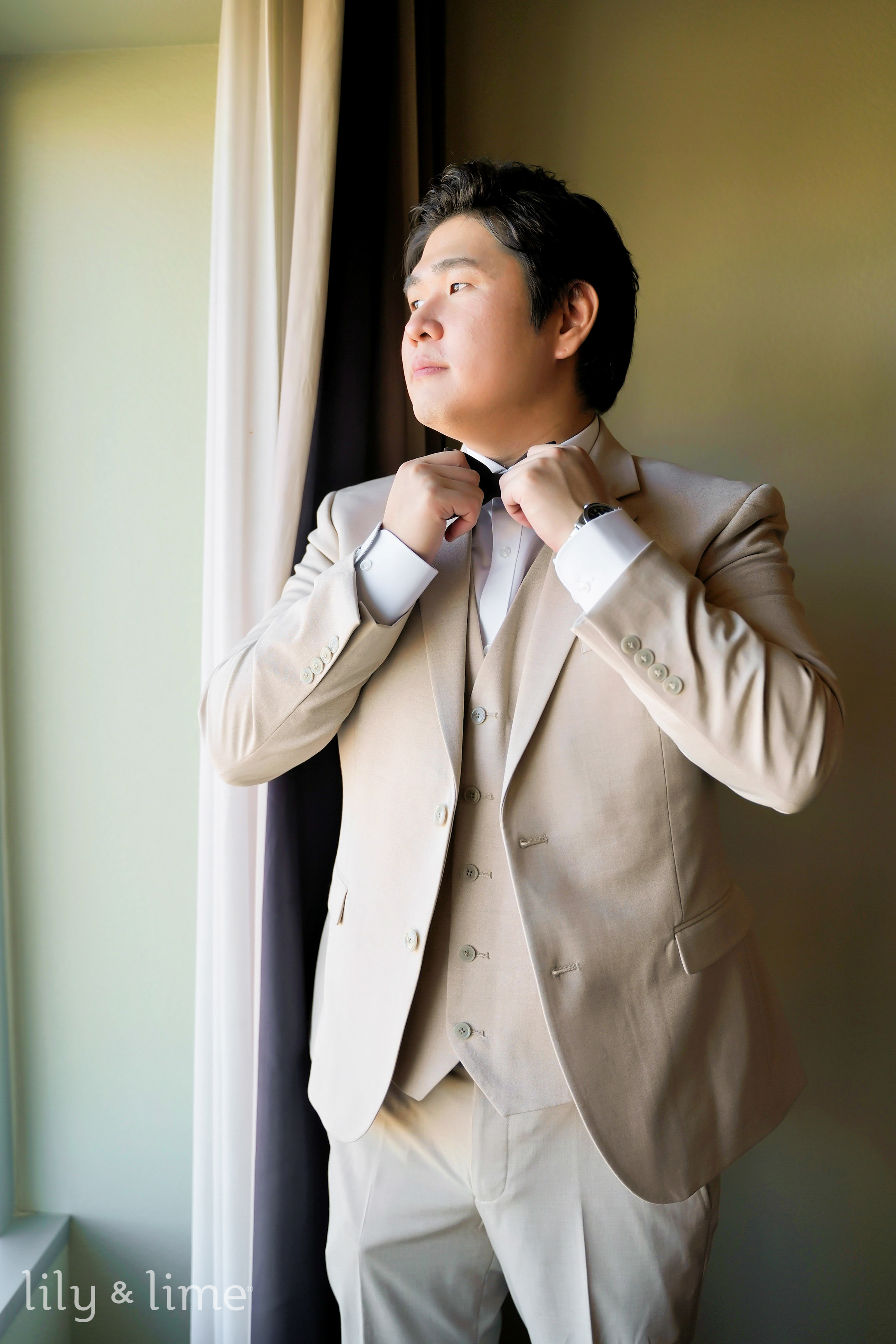 Meanwhile, Haram was in his suite, exuding sophistication in a dapper beige suit. Paired with a crisp white shirt, tanned brown shoes, a dark brown bowtie, and a white rose boutonniere, he was the epitome of groom elegance. The getting-ready photos captured the excitement and anticipation of the day, reflecting their joy and love.