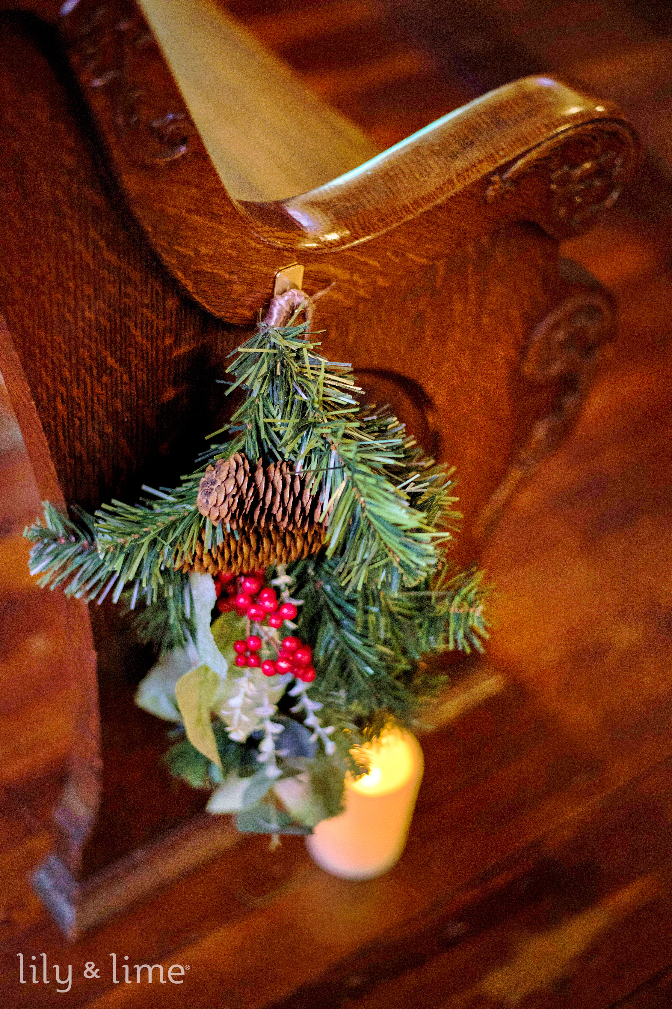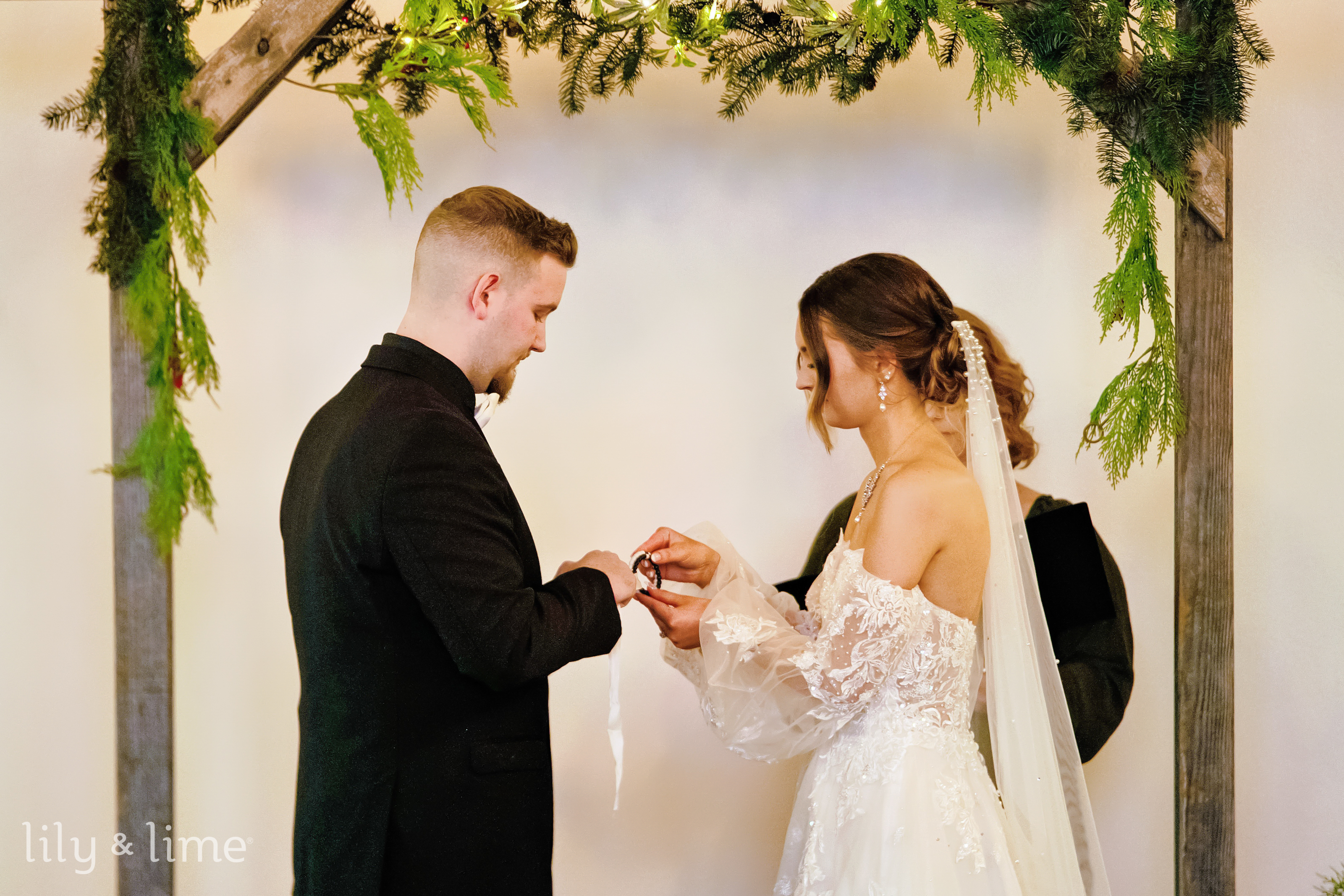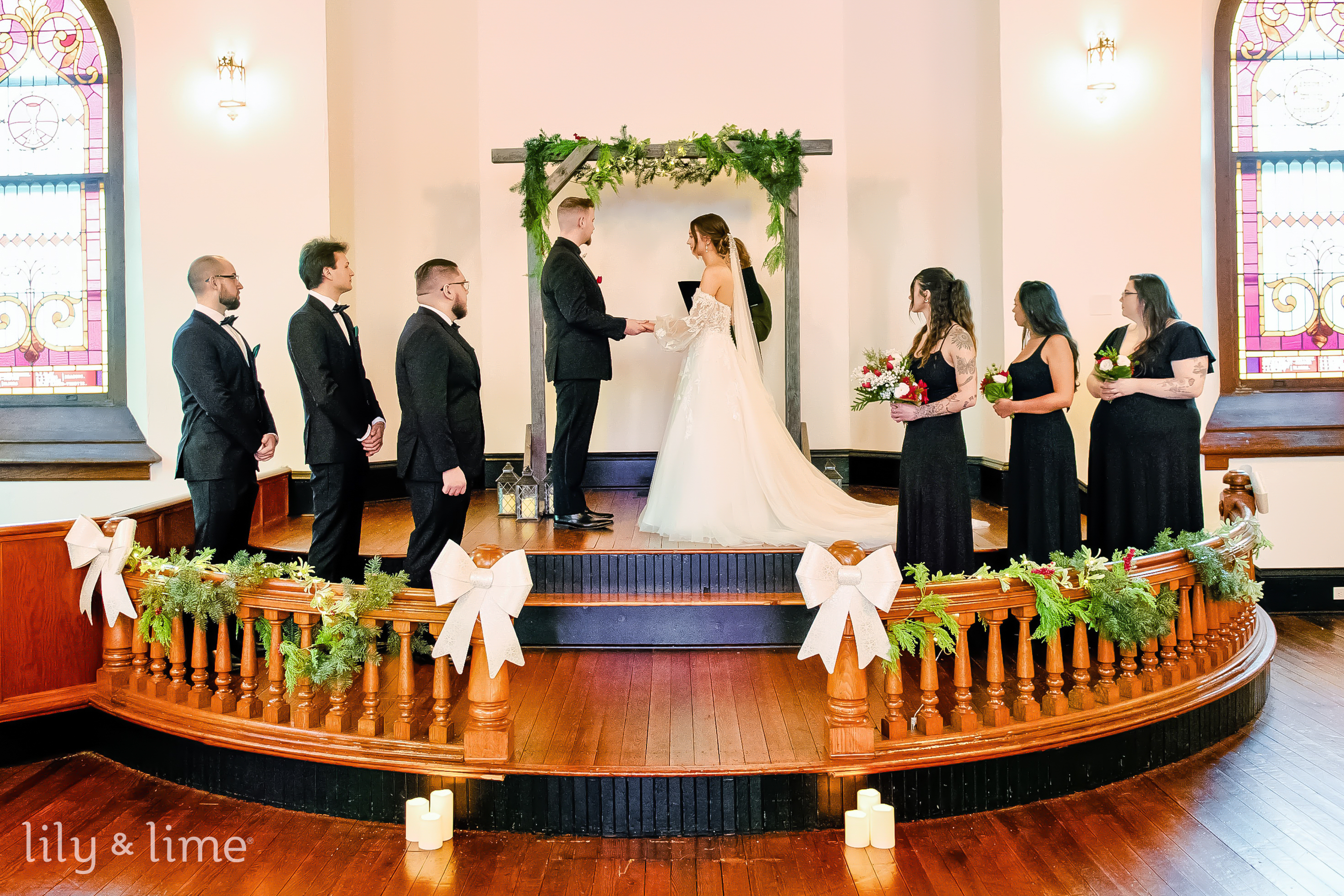 The couple’s first-look session was a highlight of the day, filled with joy and anticipation as they saw each other for the first time. The love and excitement in their eyes set the tone for the rest of the celebration. The ceremony took place in a beautiful chapel venue adorned with rustic and festive decor. A greenery arch framed the altar, accented with pinecones, bows, and wooden signs that added a country wedding charm. The emotional exchange of vows was beautifully captured, with every tear and smile telling the story of their love.