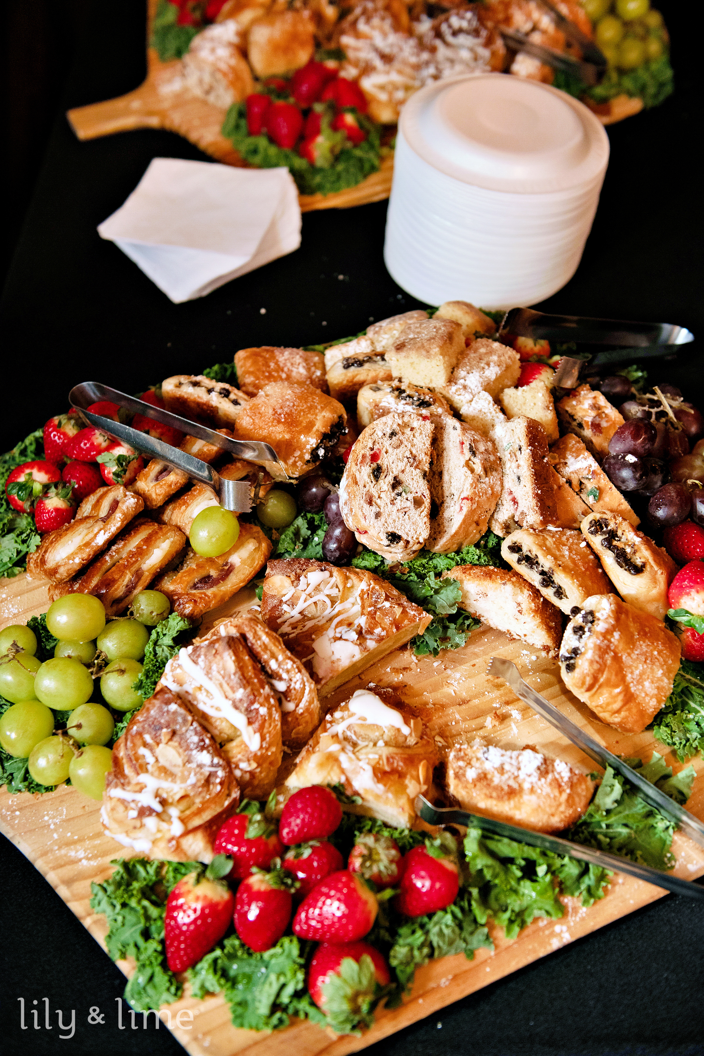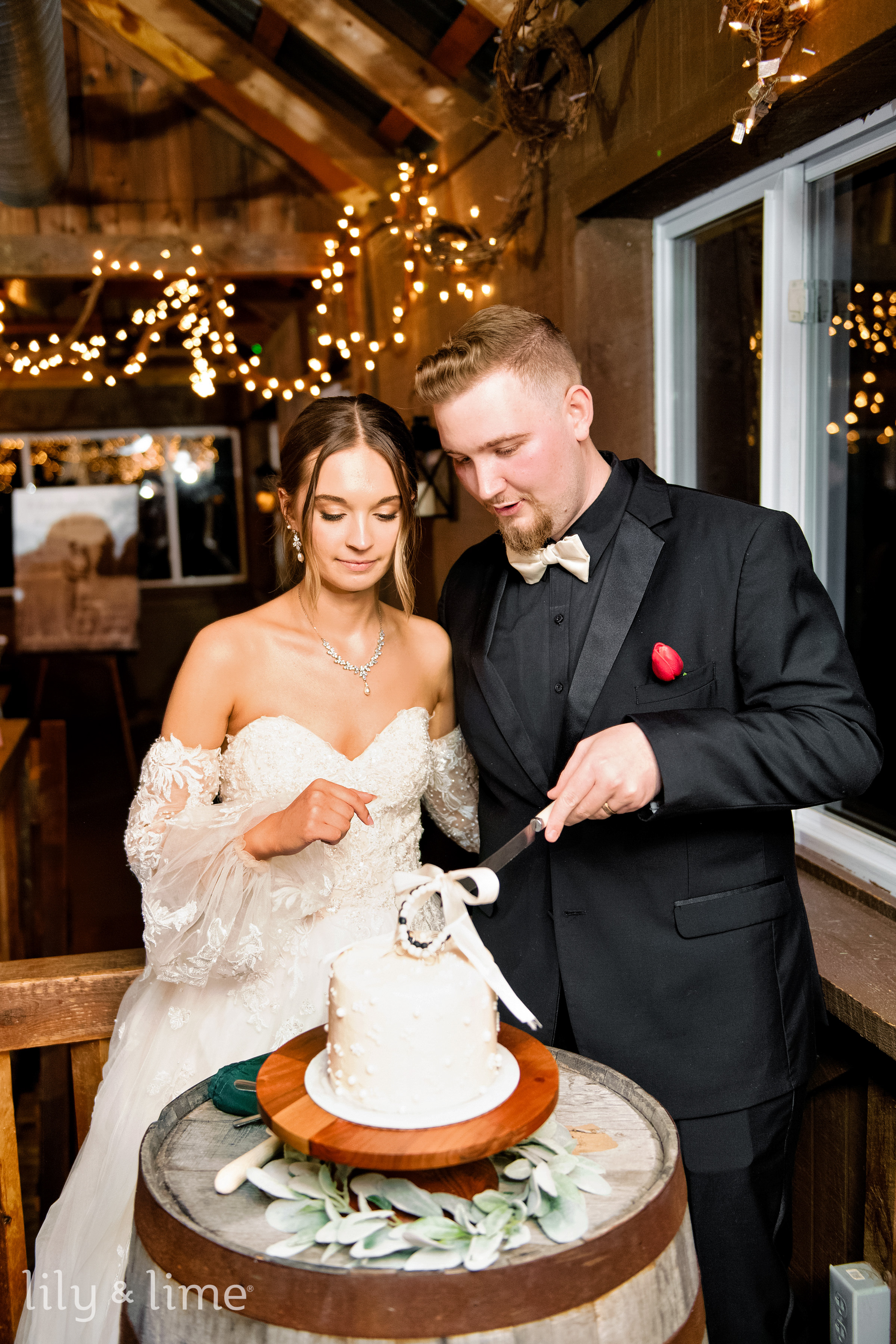 The afternoon reception was held in a rustic barn, transformed into a Christmas wonderland. The red and green color scheme, greenery decor, and warm lighting created a cozy and festive atmosphere. Unique touches like a reindeer-inspired seating chart, barrel decor, and Christmas ornament centerpieces added personality to the space. The wedding food display was a feast for the eyes, and the all-white wedding cake with pearl details was a simple yet elegant centerpiece.