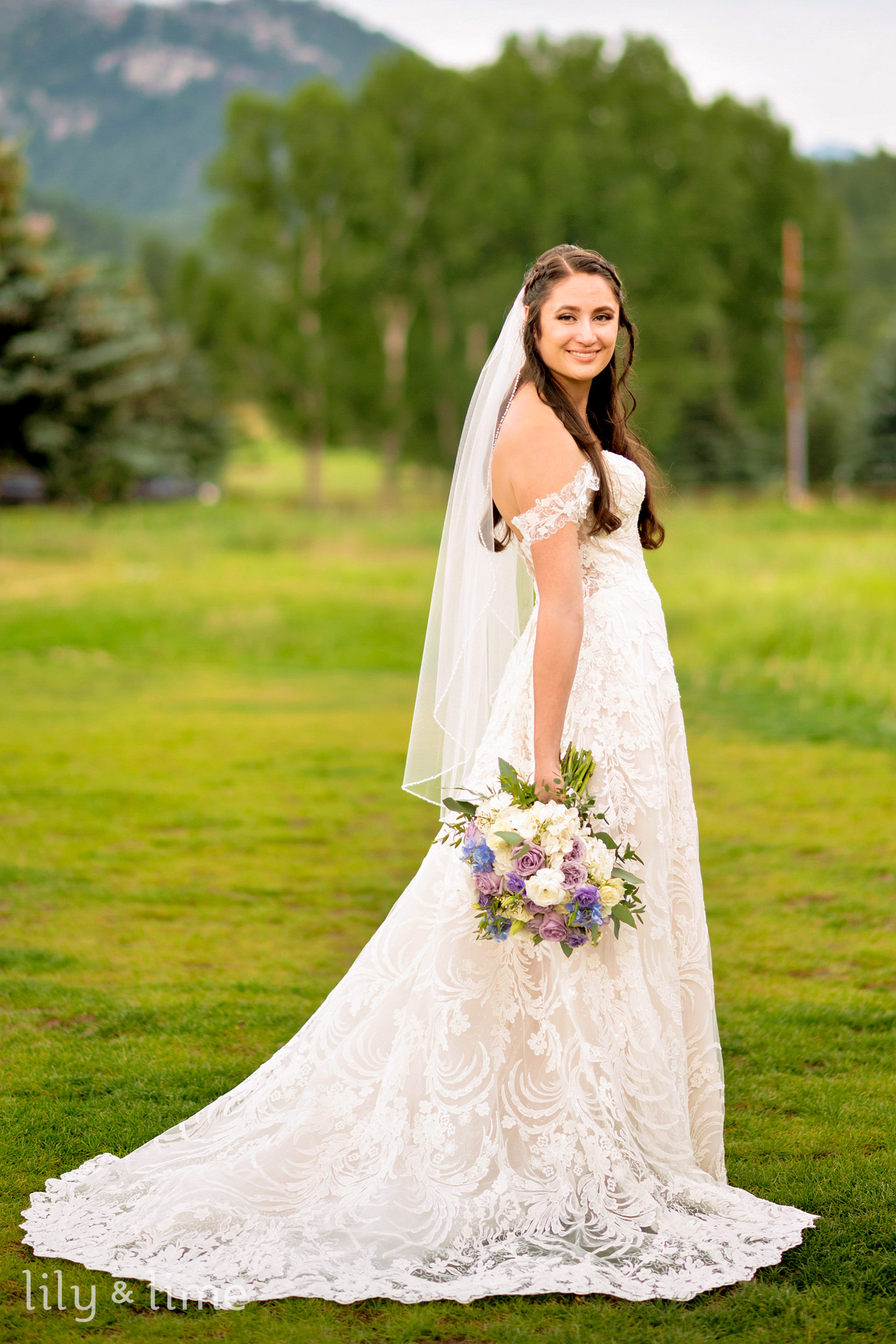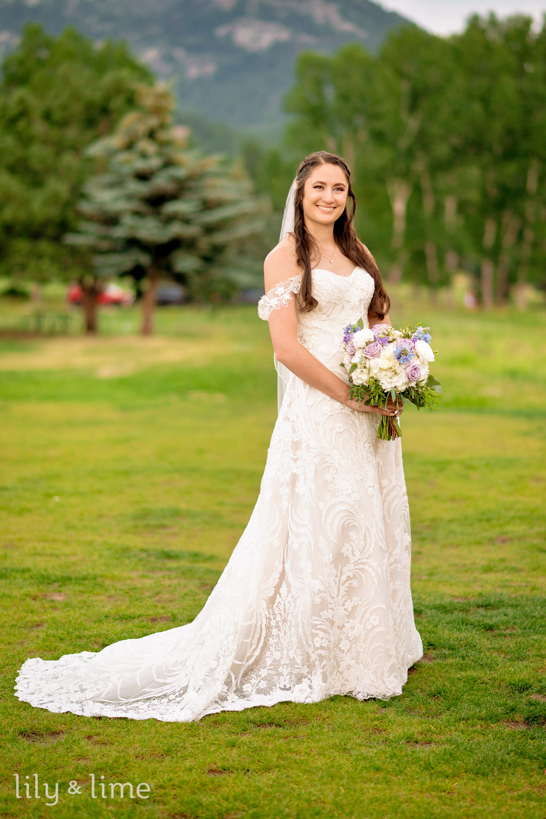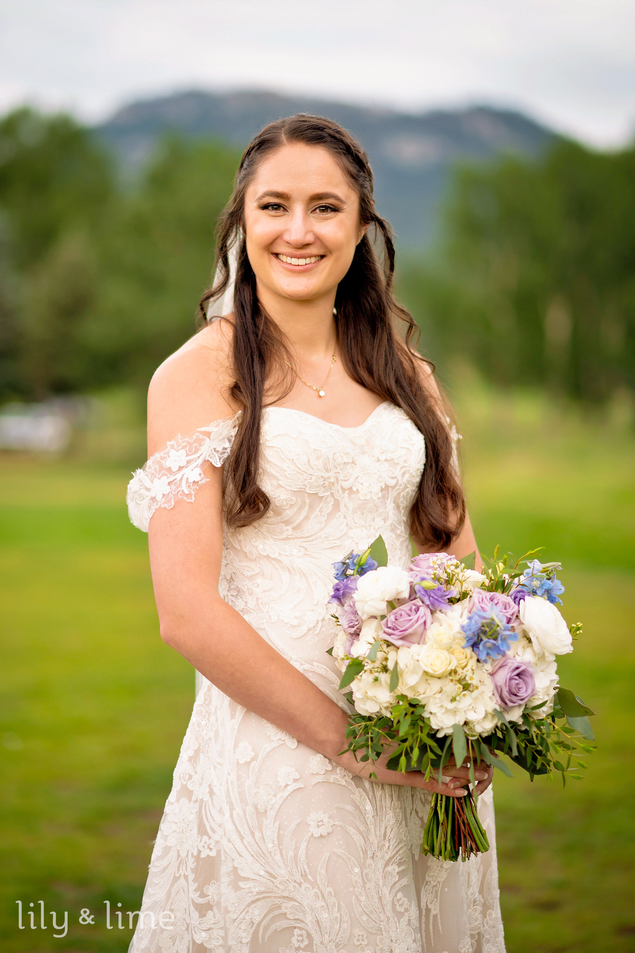 Madison looked radiant in her beautiful pink getting-ready robe. For her big day, Madison chose a chic strapless wedding dress that perfectly captured timeless elegance. The sweetheart neckline and off-the-shoulder sleeves complemented her figure beautifully, while crystal appliques and stunning lace details added sparkle and romance. The A-line silhouette created a classic bridal look that was both sophisticated and comfortable. She completed her ensemble with an elegant half-up, half-down hairstyle that showcased her natural beauty, carried a gorgeous white and lavender wedding bouquet that tied perfectly into their color scheme, wore a flowing veil that caught the Denver mountain breeze, and chose neutral bridal makeup that enhanced her radiant glow.