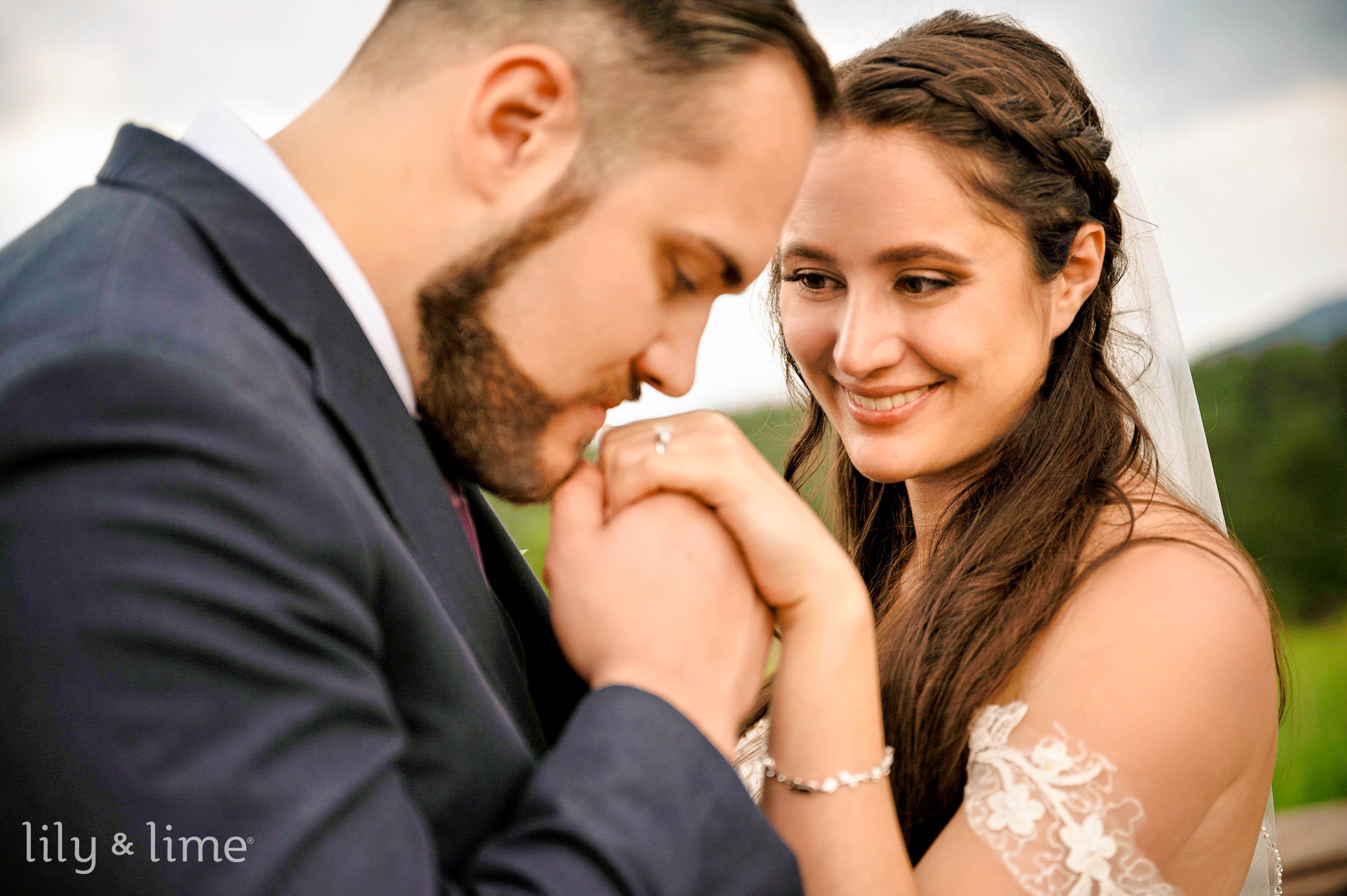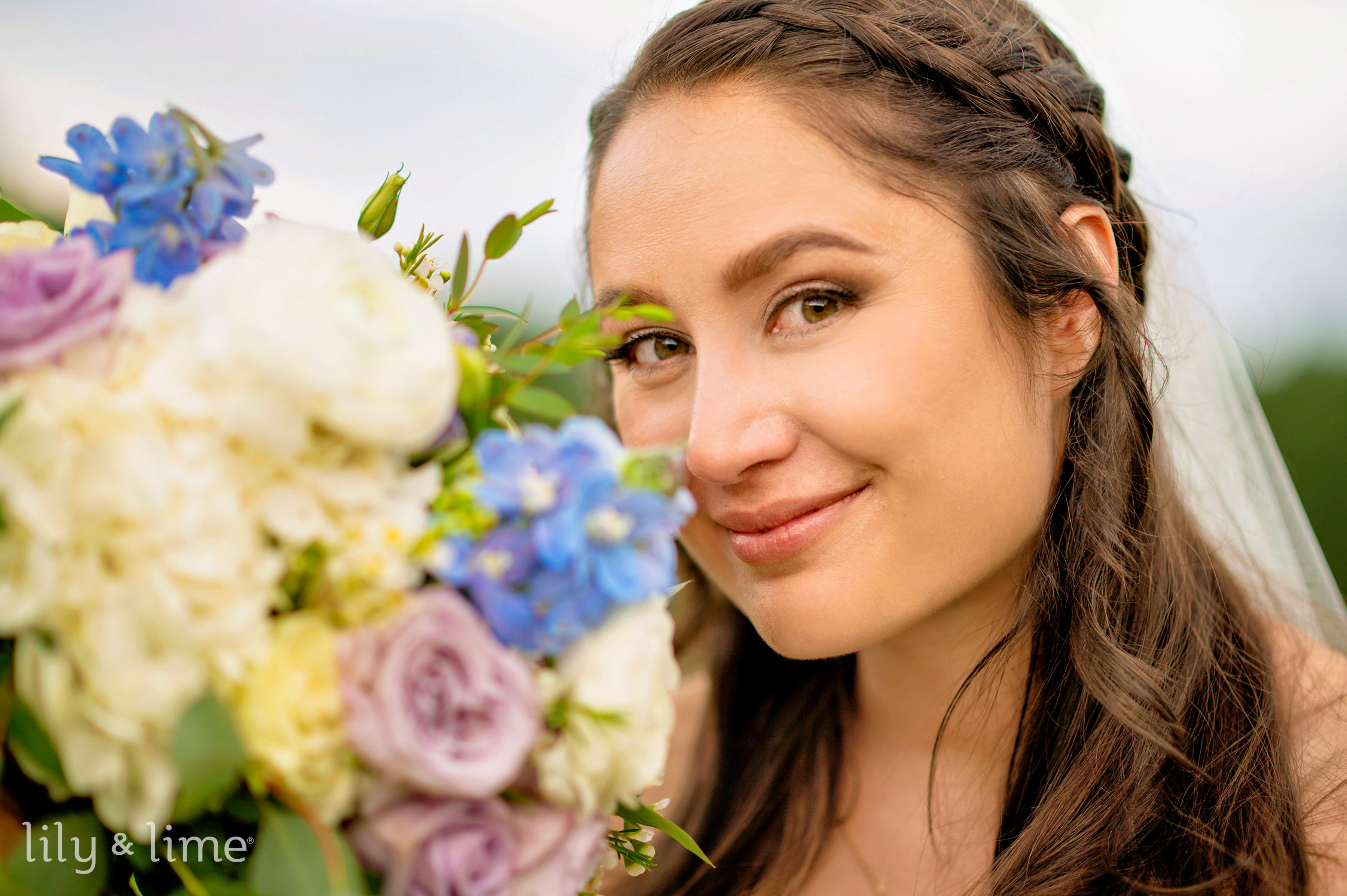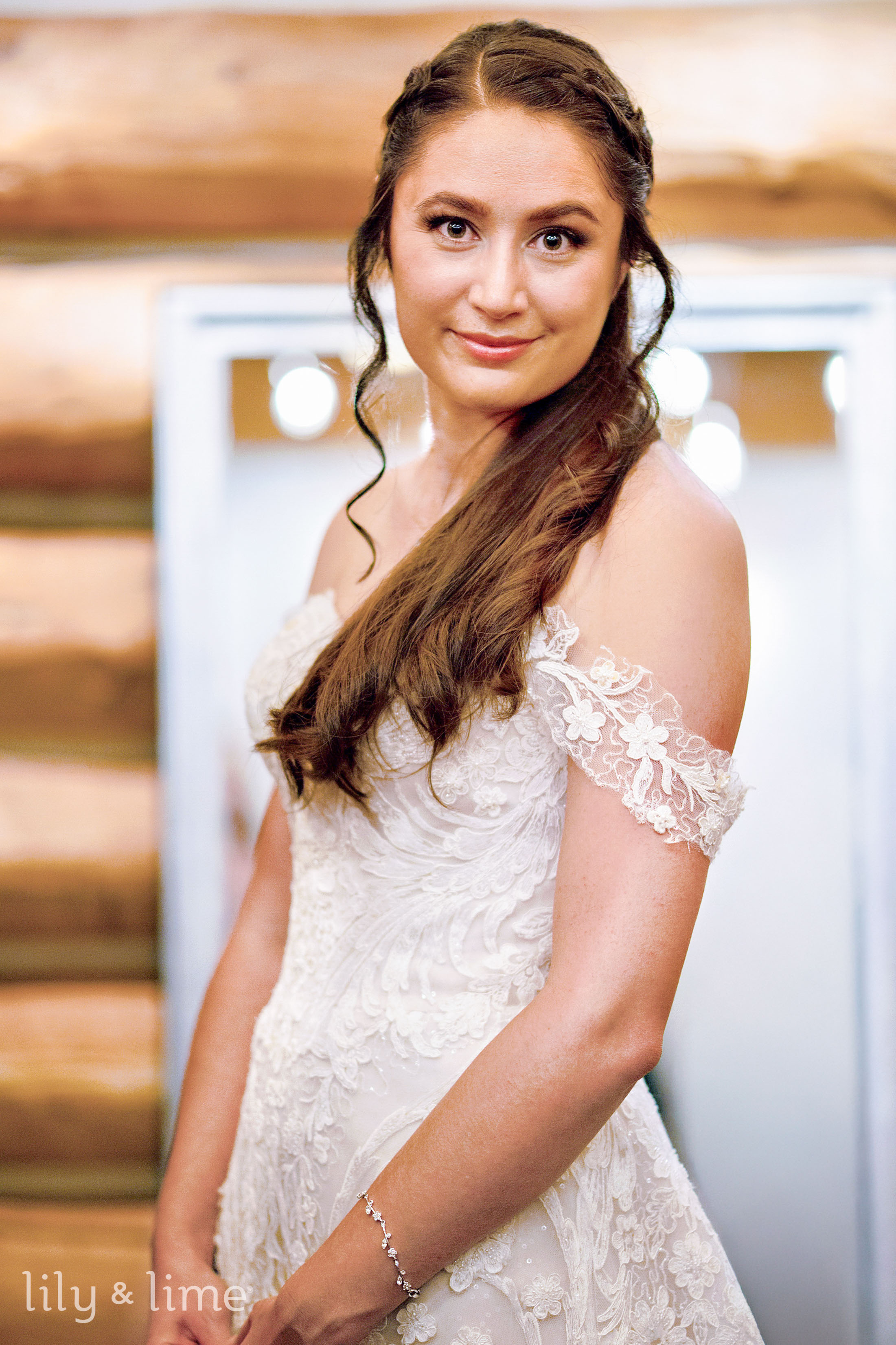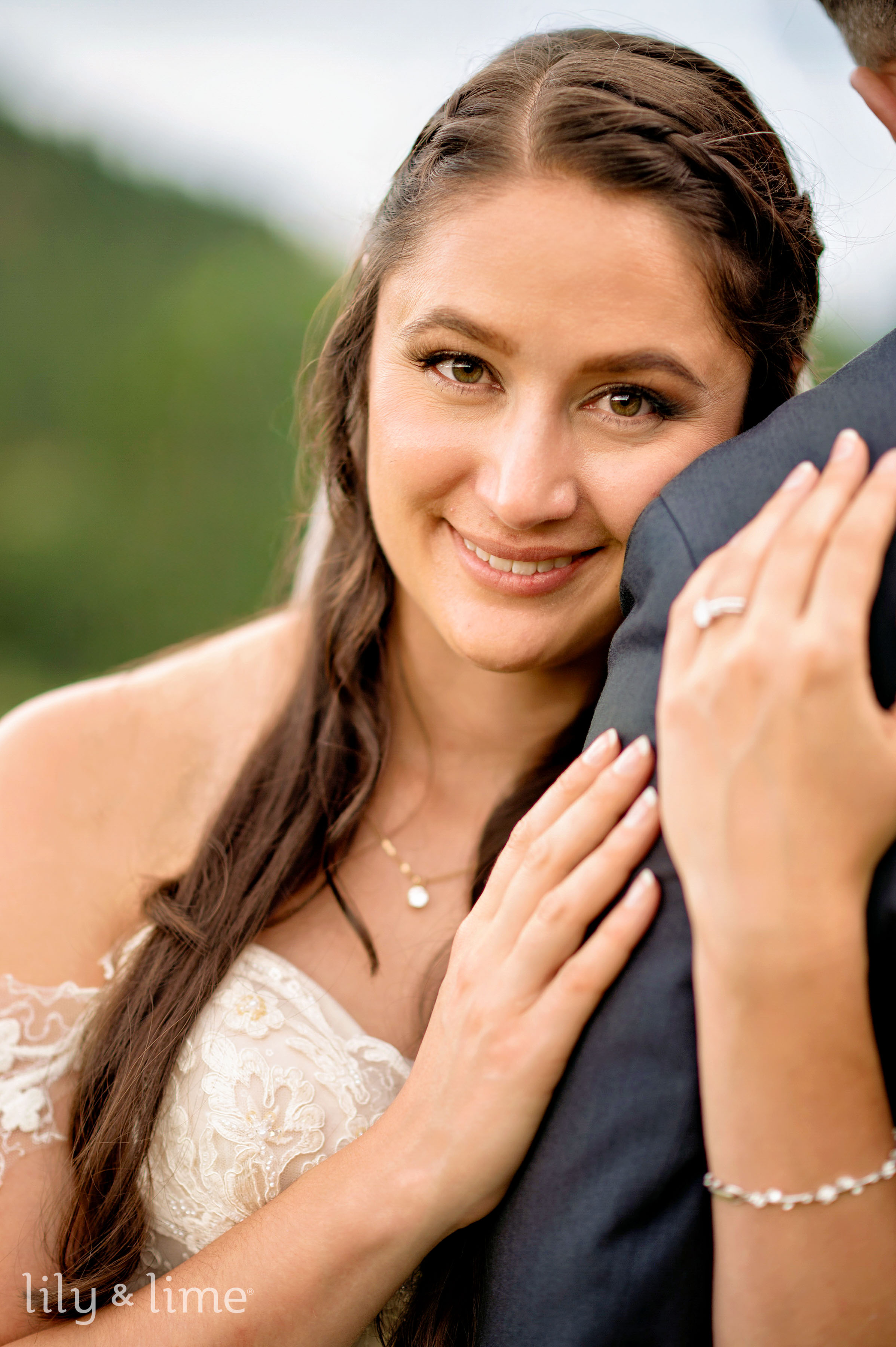Madison looked radiant in her beautiful pink getting-ready robe. For her big day, Madison chose a chic strapless wedding dress that perfectly captured timeless elegance. The sweetheart neckline and off-the-shoulder sleeves complemented her figure beautifully, while crystal appliques and stunning lace details added sparkle and romance. The A-line silhouette created a classic bridal look that was both sophisticated and comfortable. She completed her ensemble with an elegant half-up, half-down hairstyle that showcased her natural beauty, carried a gorgeous white and lavender wedding bouquet that tied perfectly into their color scheme, wore a flowing veil that caught the Denver mountain breeze, and chose neutral bridal makeup that enhanced her radiant glow.