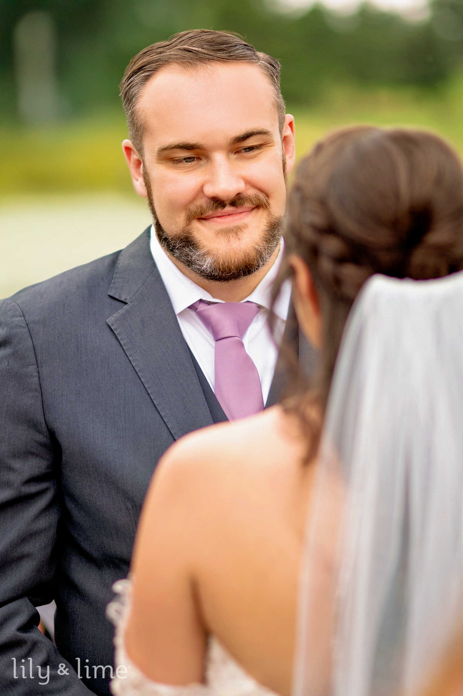 Robert looked completely dapper in his three-piece gray wedding suit, paired with a crisp white formal shirt that provided the perfect contrast. His shiny black shoes, lavender necktie, and white and purple boutonniere created a cohesive look that complemented Madison's style perfectly. The wedding party's attire created a harmonious visual story, with the bridesmaids wearing elegant lavender dresses and carrying white and pink bouquets, while the groomsmen looked sharp in stylish gray wedding suits that matched Robert's sophisticated choice.