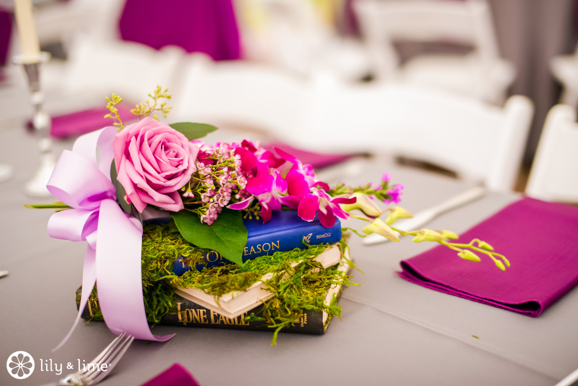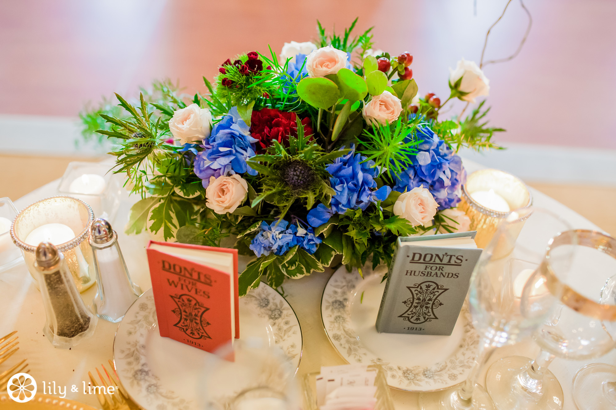 Books tie in your love for reading while adding interest and height to the table. Vintage books, like Don’ts for Wives and Don’ts for Husbands, with old-school wedding advice are a fun choice because guests can thumb through them and delight in their comical advice (it didn’t all age well). They make for interesting centerpiece accents and they’re great conversation starters to boot.