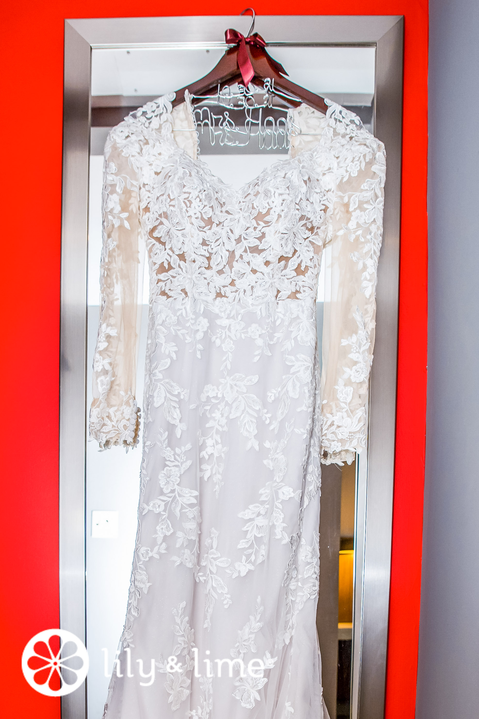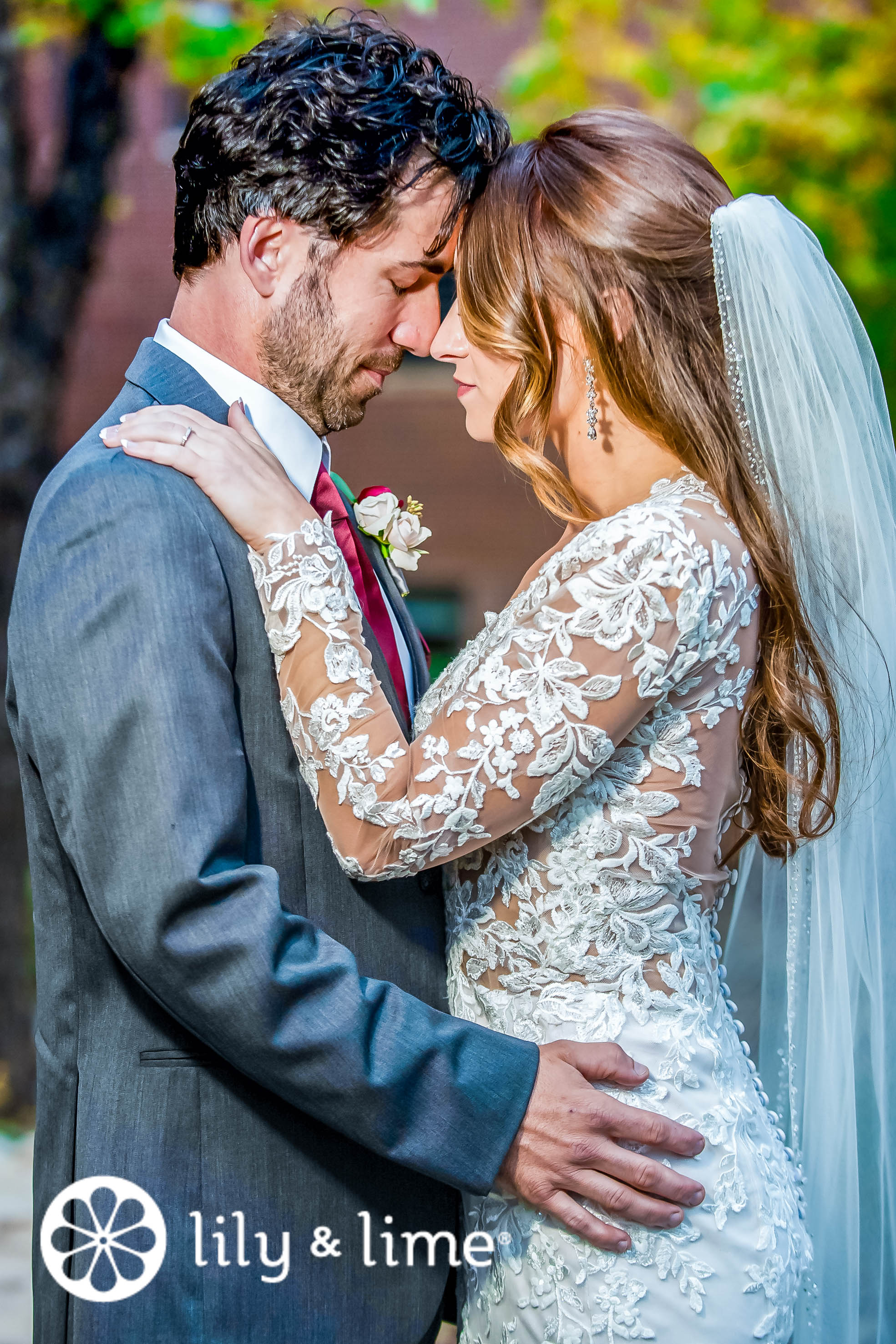 The couple had decided to get dressed separately. The getting-ready photos show how excited they were to get married. The weather on their wedding day had been perfect, it was neither sunny nor cloudy. The faintness in the sky gave the couple a magical sky to get photographed under. Additionally, being deep in the fall season, there was plenty of color in the environment that added to the magical touch of their wedding photos. As the soon-to-be bride stepped into her dressing room, she was dressed in a gray sweatshirt and a pair of jeans. Her dress was as wonderful as the bride's. It had a delicate lace design all over the wedding dress. She smiled and told our wedding photographer, as she held the dress up for him to take photos of, that she bought it from TheDress Shop. To improve the “getting-ready” experience, Mary had picked out a beautiful dress hanger that said “Mrs. Haas' on it in cursive lettering. She also held out the dress from the window of the room so that she could have a memory of the city in the background to look back on. For their getting-ready outfits, Mary and her bridesmaids dressed up in dark gray comfortable sweatshirts monogrammed with the bride’s initials, “KM.” The bride and the maid of honor were dressed in their sweatshirts but had blue jeans, while the other bridesmaids were dressed in black jeans. The groom had decided to spend some time with the boys before all of them, including the groom’s father, put on deep gray three-piece wedding suits, paired with red satin ties, pocket squares, and a boutonniere. The groom’s boutonniere was red, while the others had cream flowers.