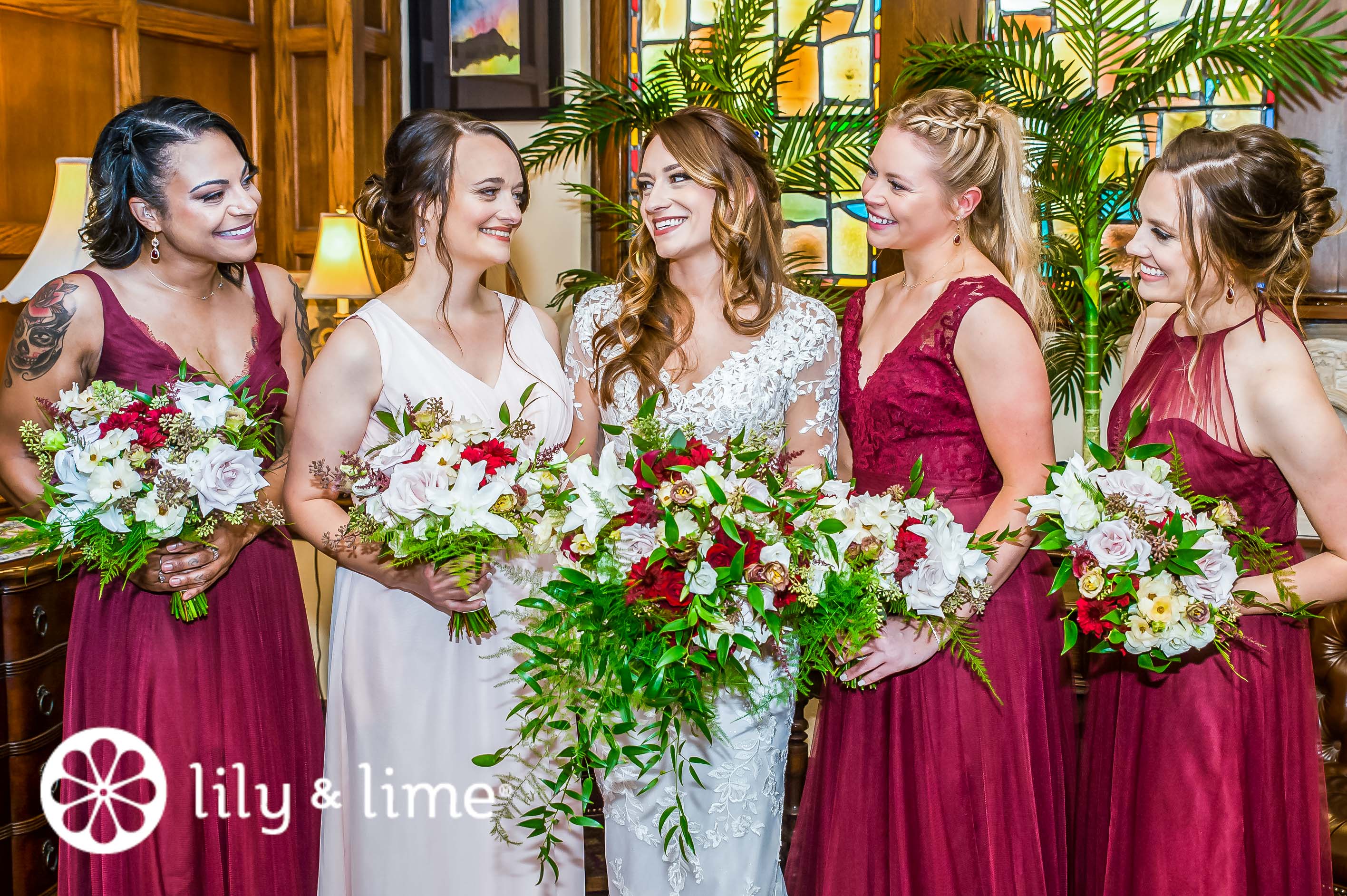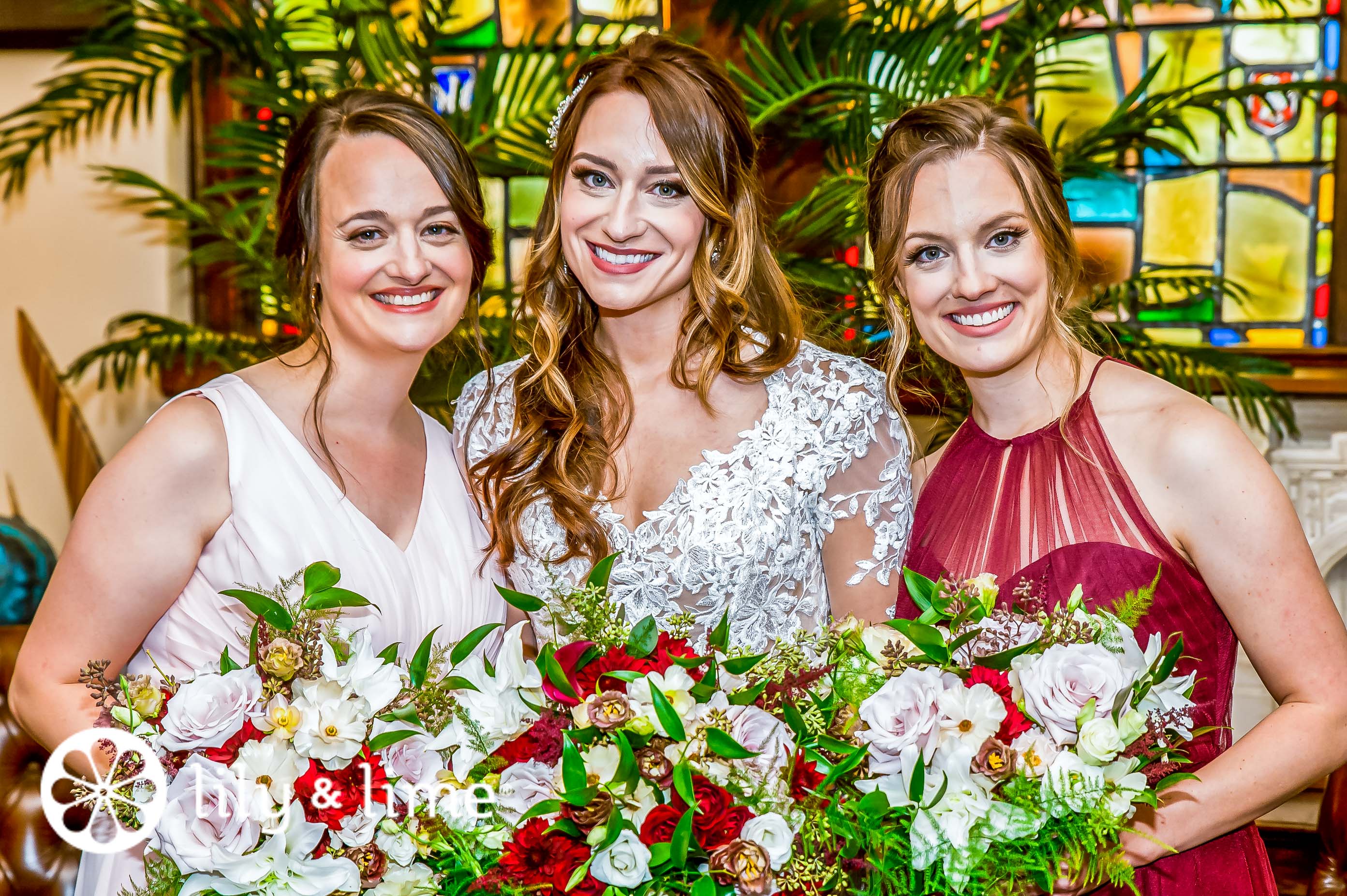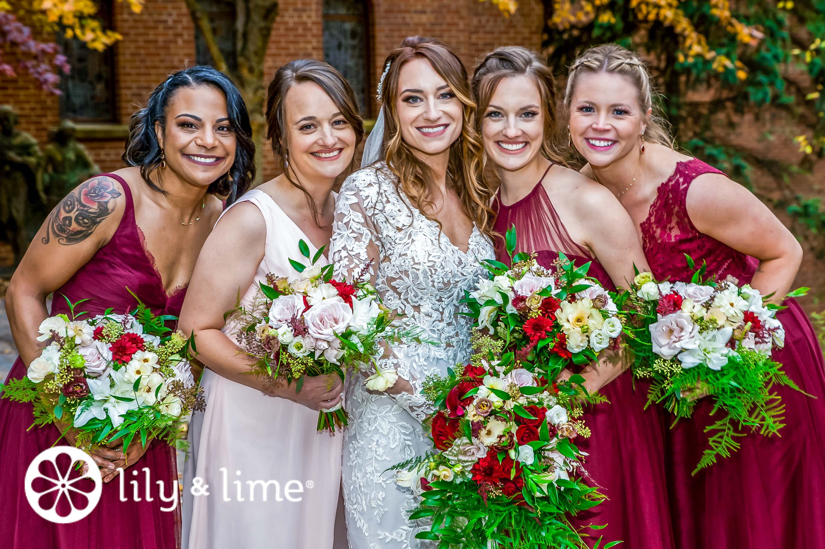 The reception venue, Inn at St. John's Plymouth, was perfect. Filled with large trees and beautiful interiors, the wedding reception decor was minimal and romantic. The venue’s Romanesque architecture paired with handcrafted woodwork and marble floors built on a romantic vibe. The halls had tall ceilings and large windows, which were covered with lovely sheer curtains. The hall’s original look was so stunning that the couple did not want to add more details to it. It was easy to see that Mary and Royce loved the interiors so much that they did not want to add much to their wedding reception. To improve their wedding look, they chose gold details, including gold chairs, and gold cutlery. The couple also decided to have small floral arrangements on the dinner tables, and a few of the tables on the corner had a larger floral arrangement with red and white flowers. The sweetheart table was decorated with similar colors as well. The escort cards were placed on a white table for the guests to find. As the guests were still arriving, the couple decided to take some photos outside, in the beautiful venue. Before the bridesmaids and the bride got a chance to take some photos, the groom and the bride posed for some photos. Taking advantage of the golden hour, the two loved exploring the vast gardens, the stone steps, and the beautiful stream that ran through the venue. Royce and Mary absolutely loved the surroundings and enjoyed posing for their photos. With the evening glow, Royce pulled Mary in for a close embrace. Then he pulled her close to plant a loving kiss on her cheek. After that, Mary asked the girls to gather around and pose for a photo. The bridesmaids and the maid of honor brought their bouquets as well for the photo.