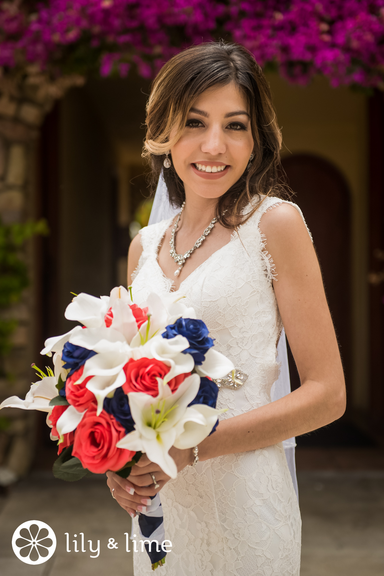 Monica’s bouquet was a sight to behold. She carried a gathering of white lilies, roses and callies, coral roses, and navy roses. It was an elegant, sophisticated way to pull in their playful wedding colors. Plus, it gave Monica a nice pop of color against her white dress!