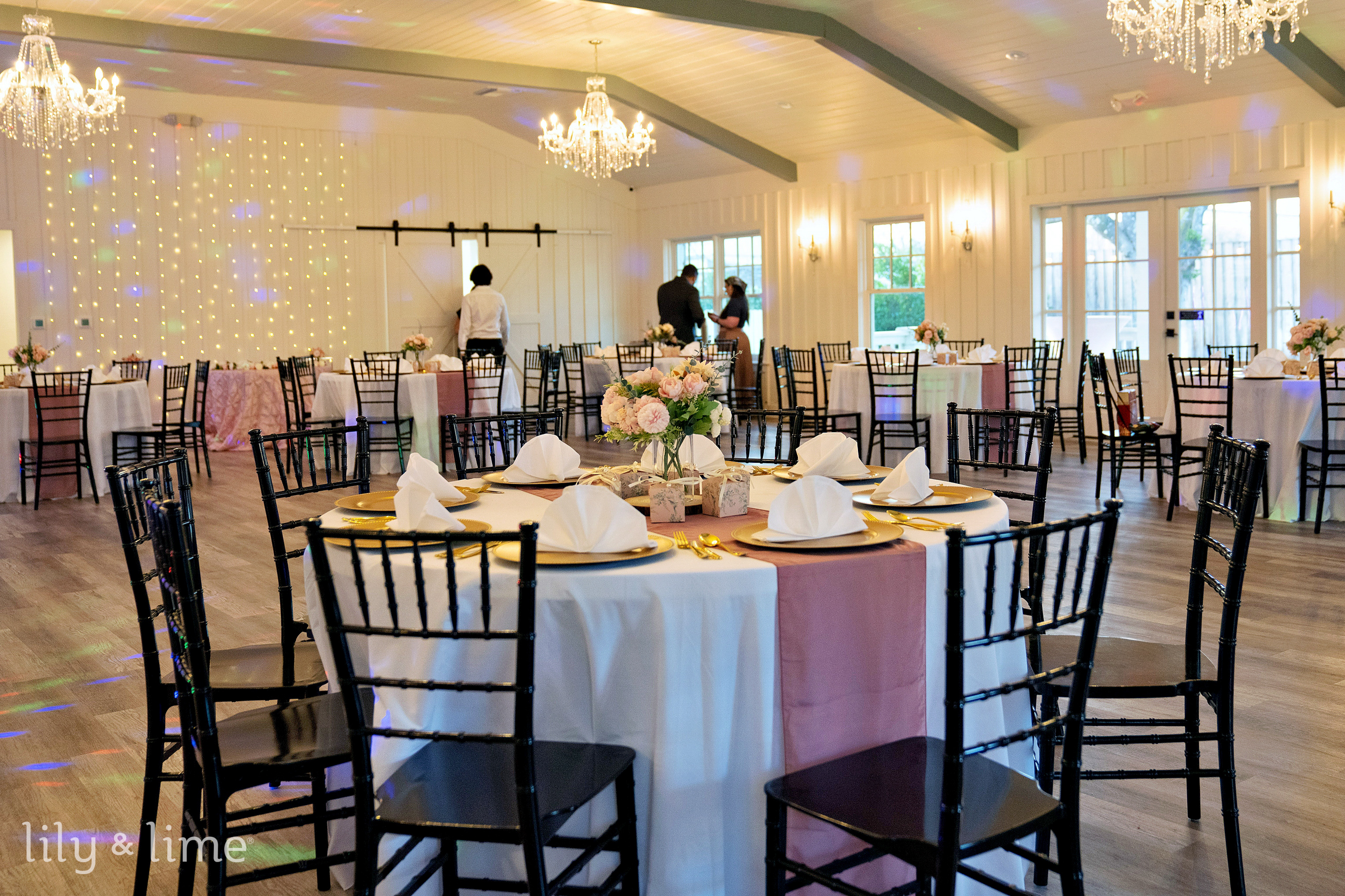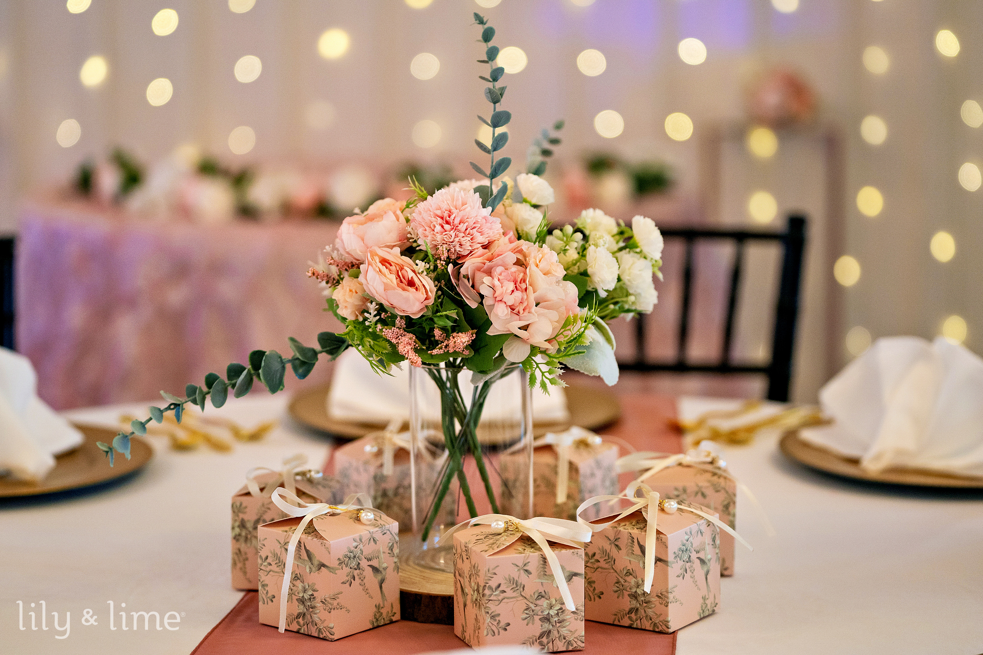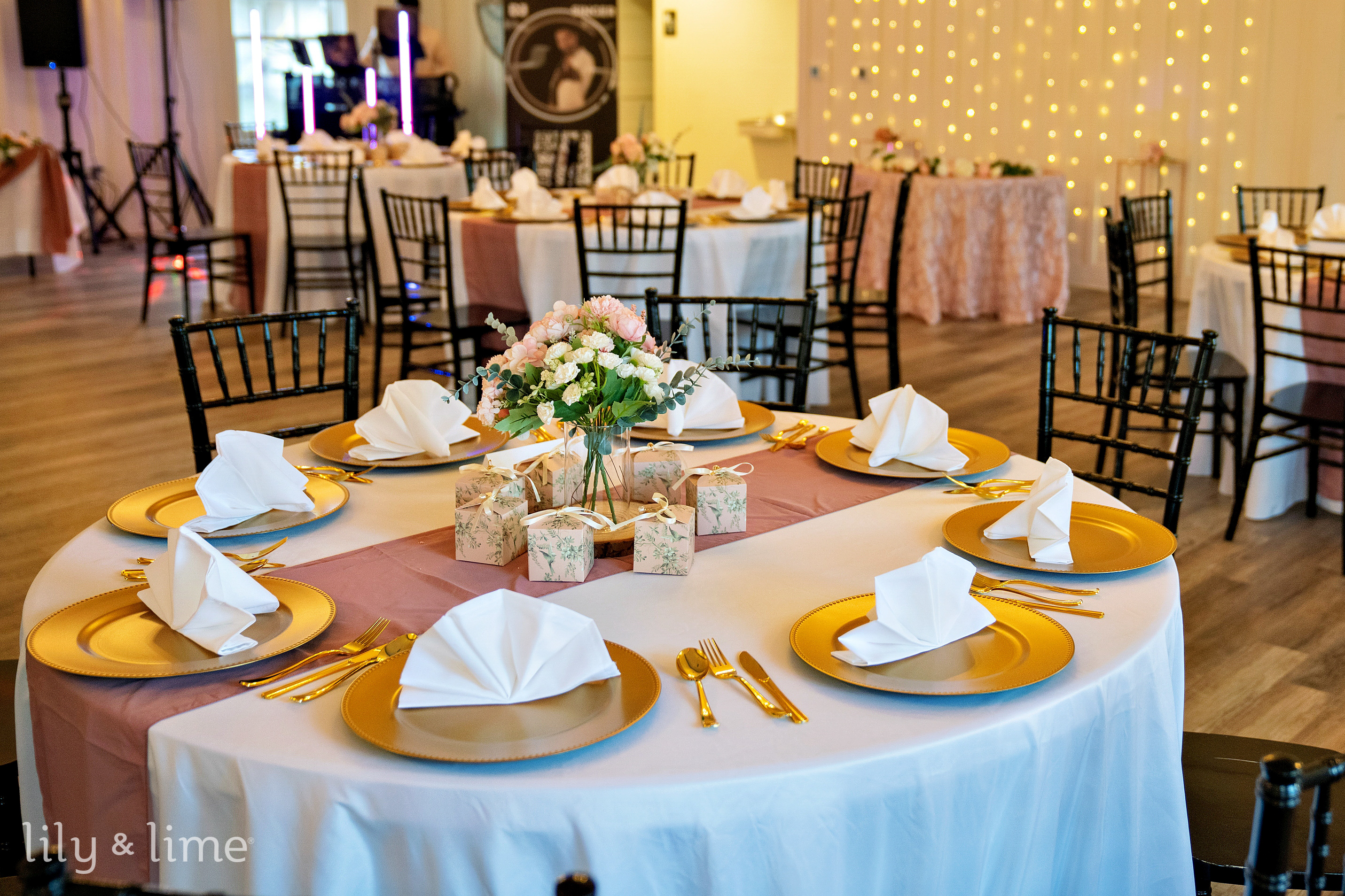 The celebration continued at the elegant indoor reception, a space transformed into a romantic haven. The decor was a masterful blend of soft and sophisticated details, featuring white and pink table settings accented with gleaming gold chargers. Pastel floral arrangements, charming pink signages, and flowing pink drapery added layers of warmth and color. Pink floral and greenery details were woven throughout the space, tying all the sweet details together beautifully. A highlight was the elegant, simple white wedding cake, adorned with fresh berries, which stood as a testament to the couple’s understated and classic taste.