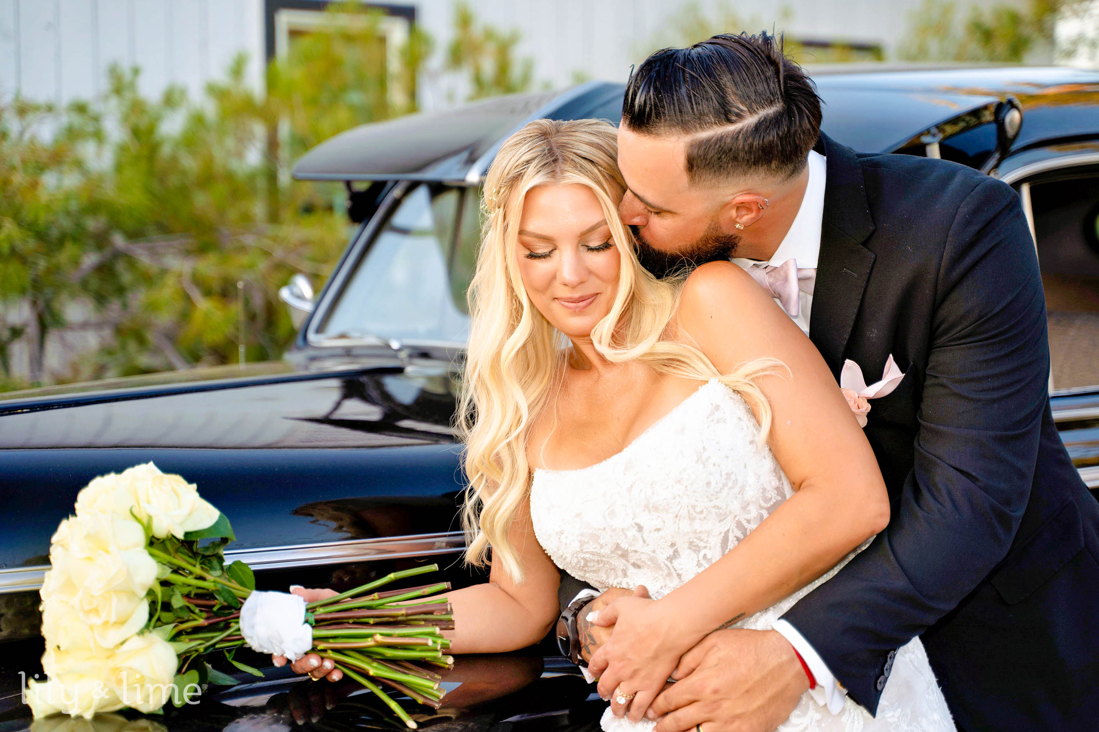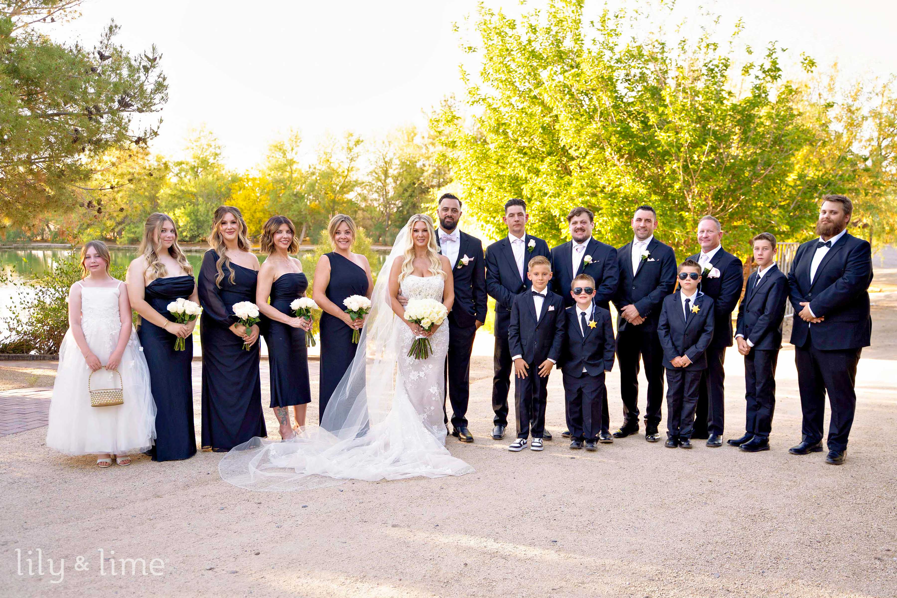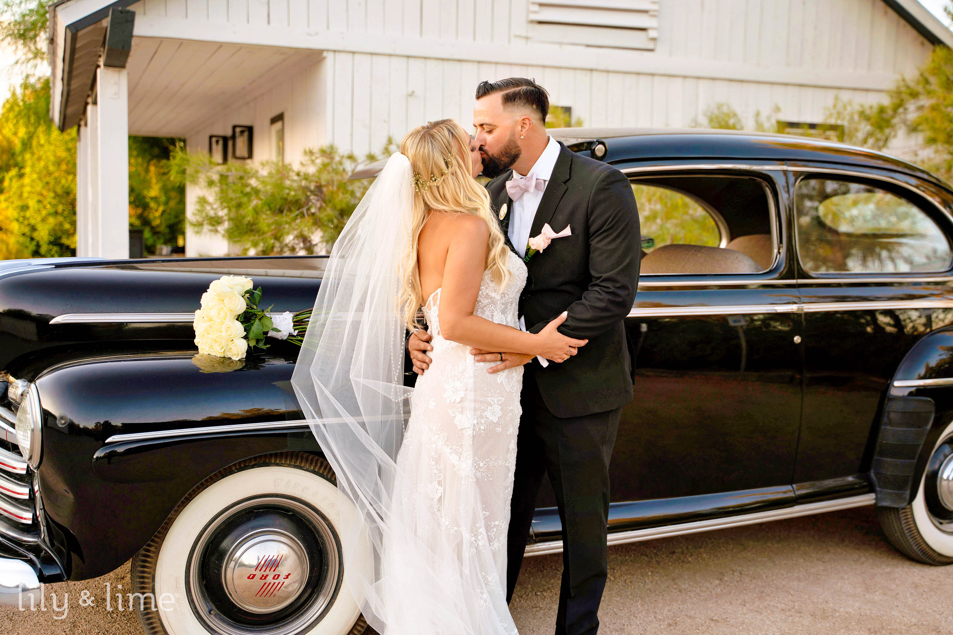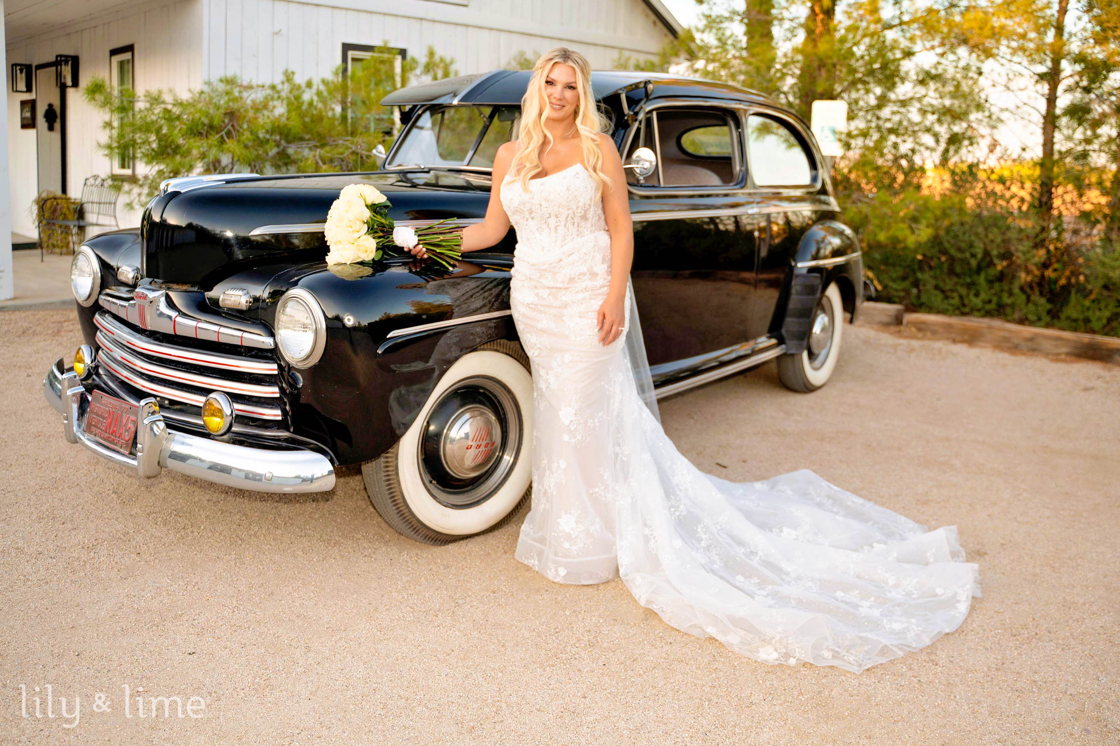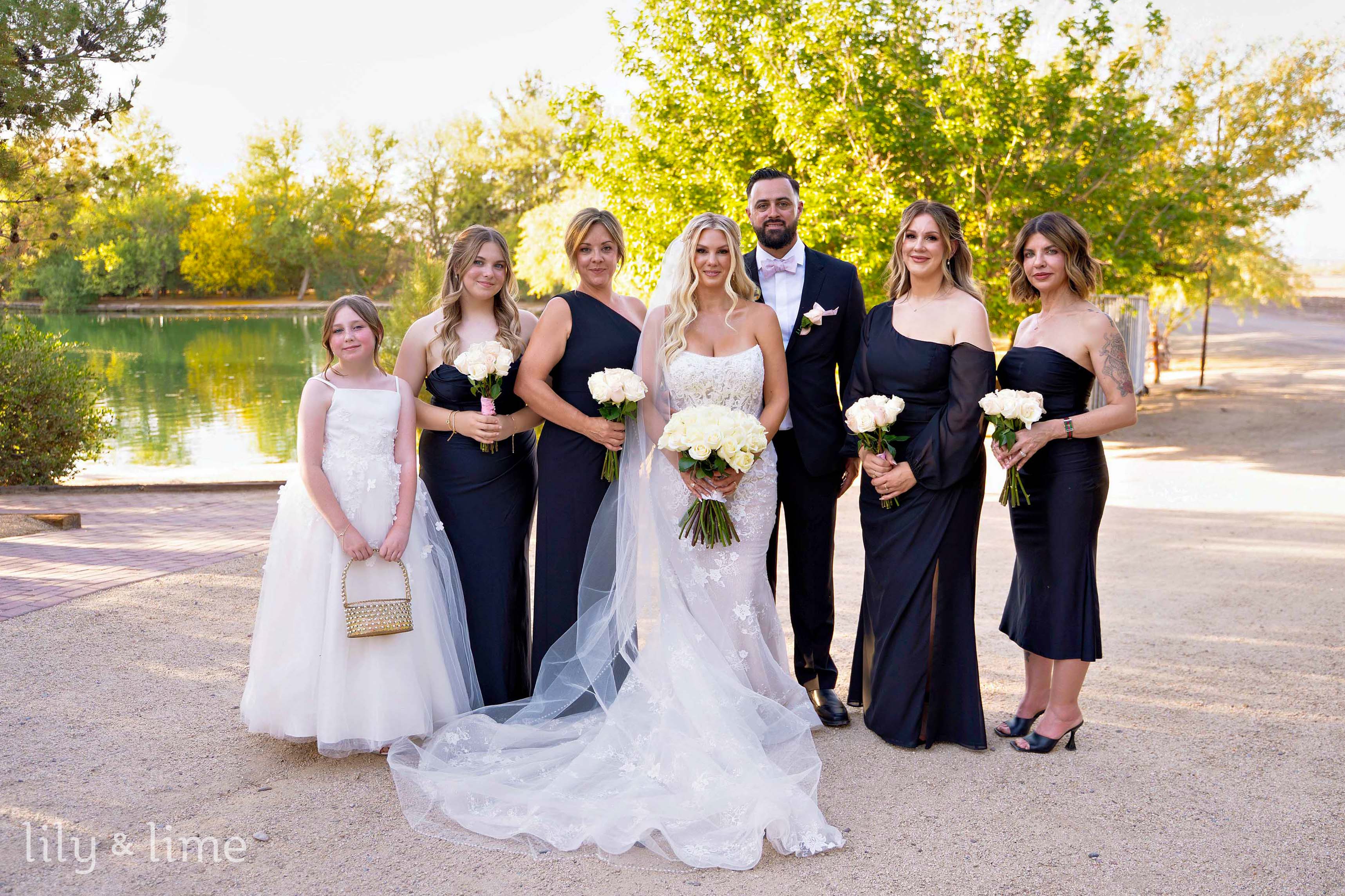 Following the ceremony, the wedding party and family gathered for group portraits amidst the picturesque venue. The black bridesmaid dresses with white wedding bouquets glowed against the rustic setting, while the groomsmen’s classic attire added a touch of timeless sophistication. Rebecca and Austin’s couple’s portraits were nothing short of cinematic, with sweeping natural landscapes and a grand limousine adding a splash of glamor and romance to their story.