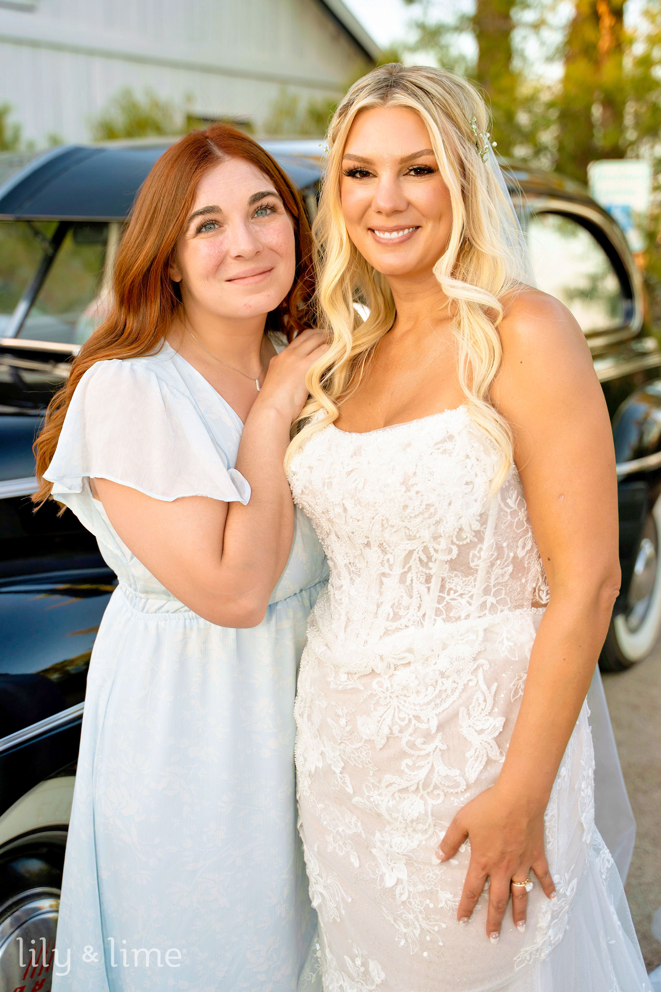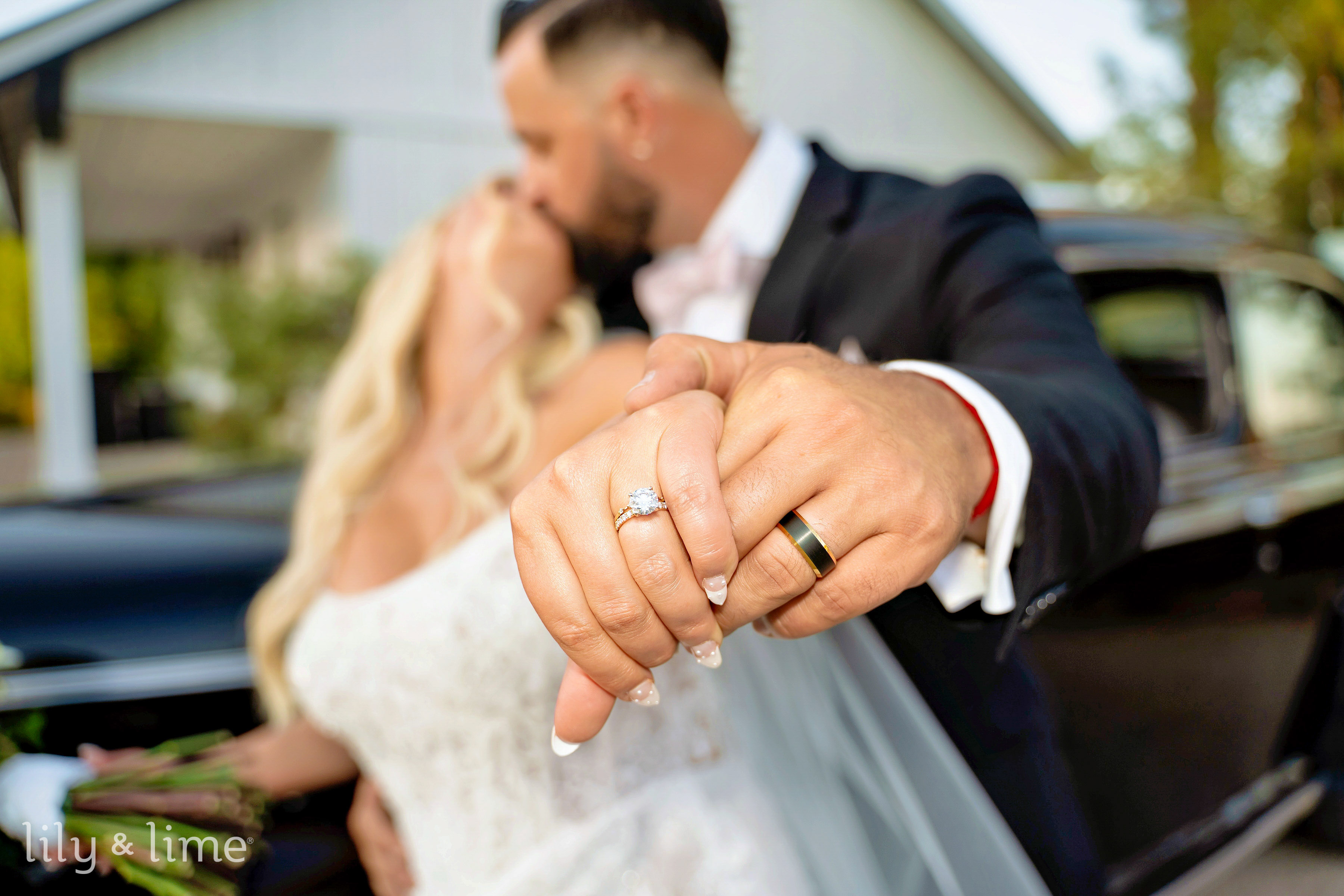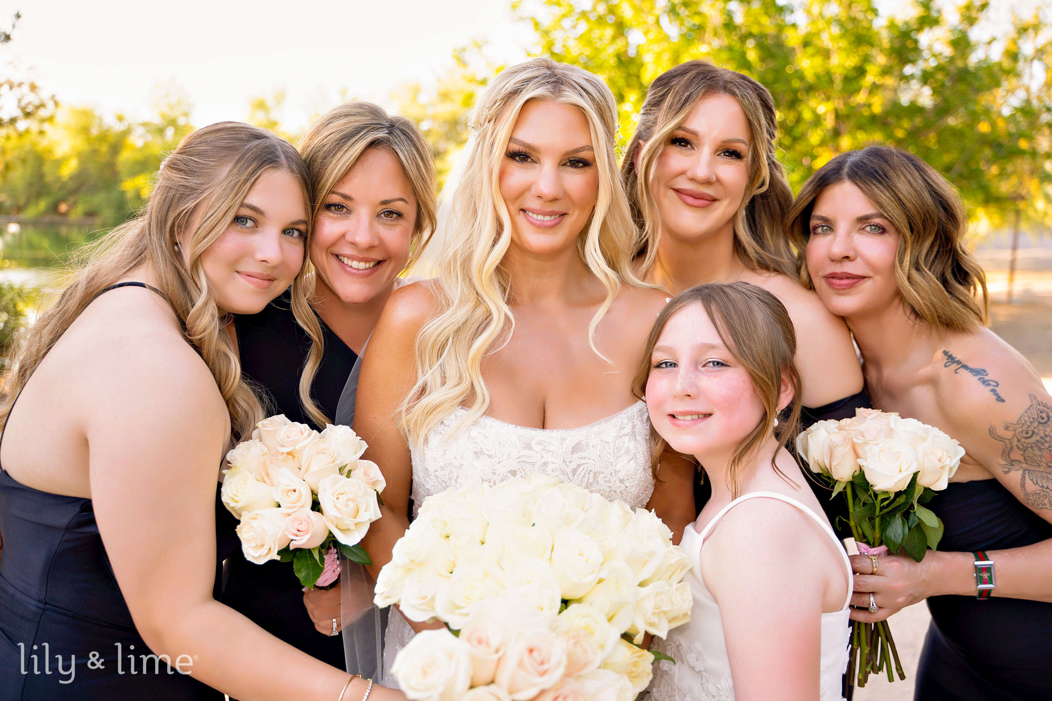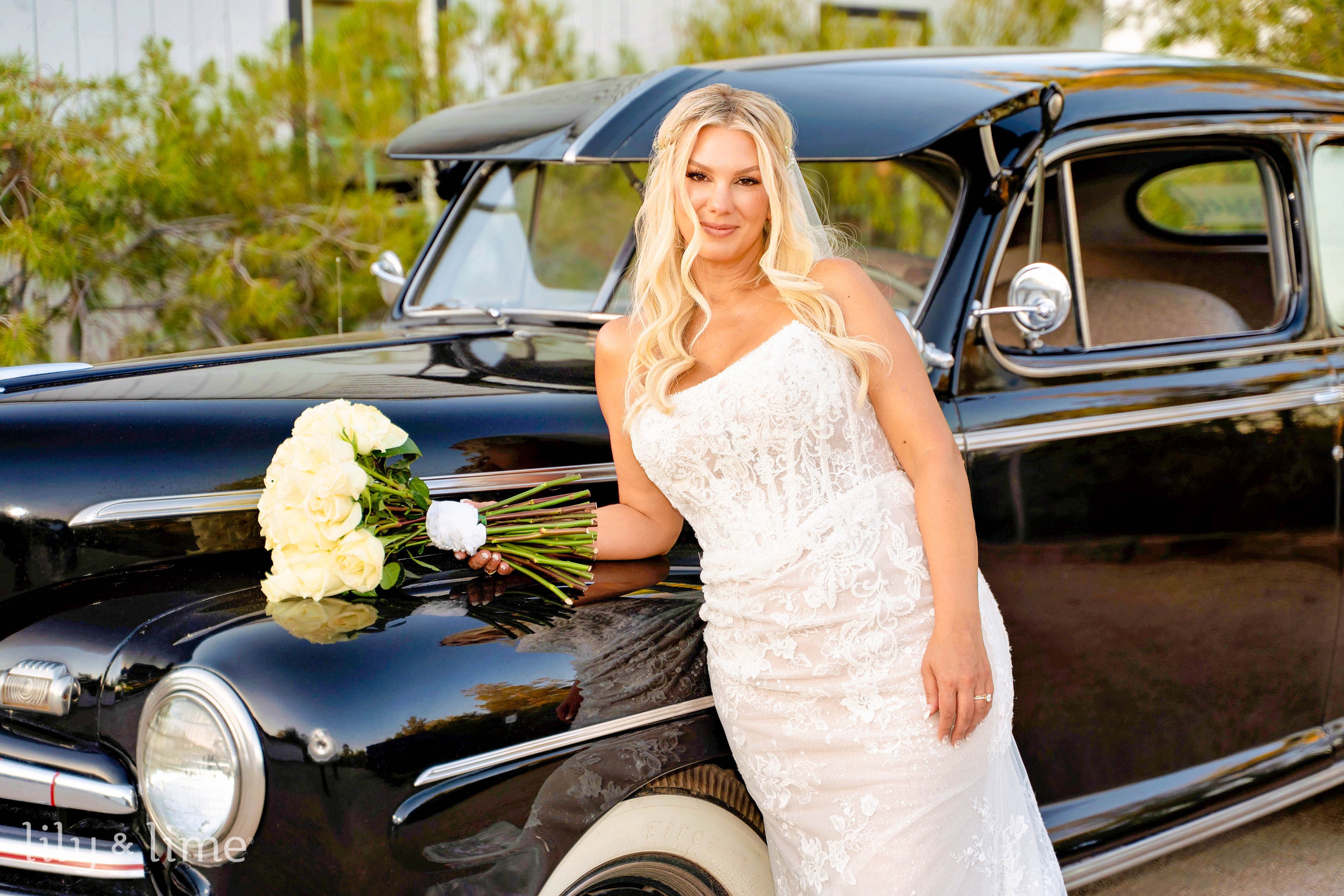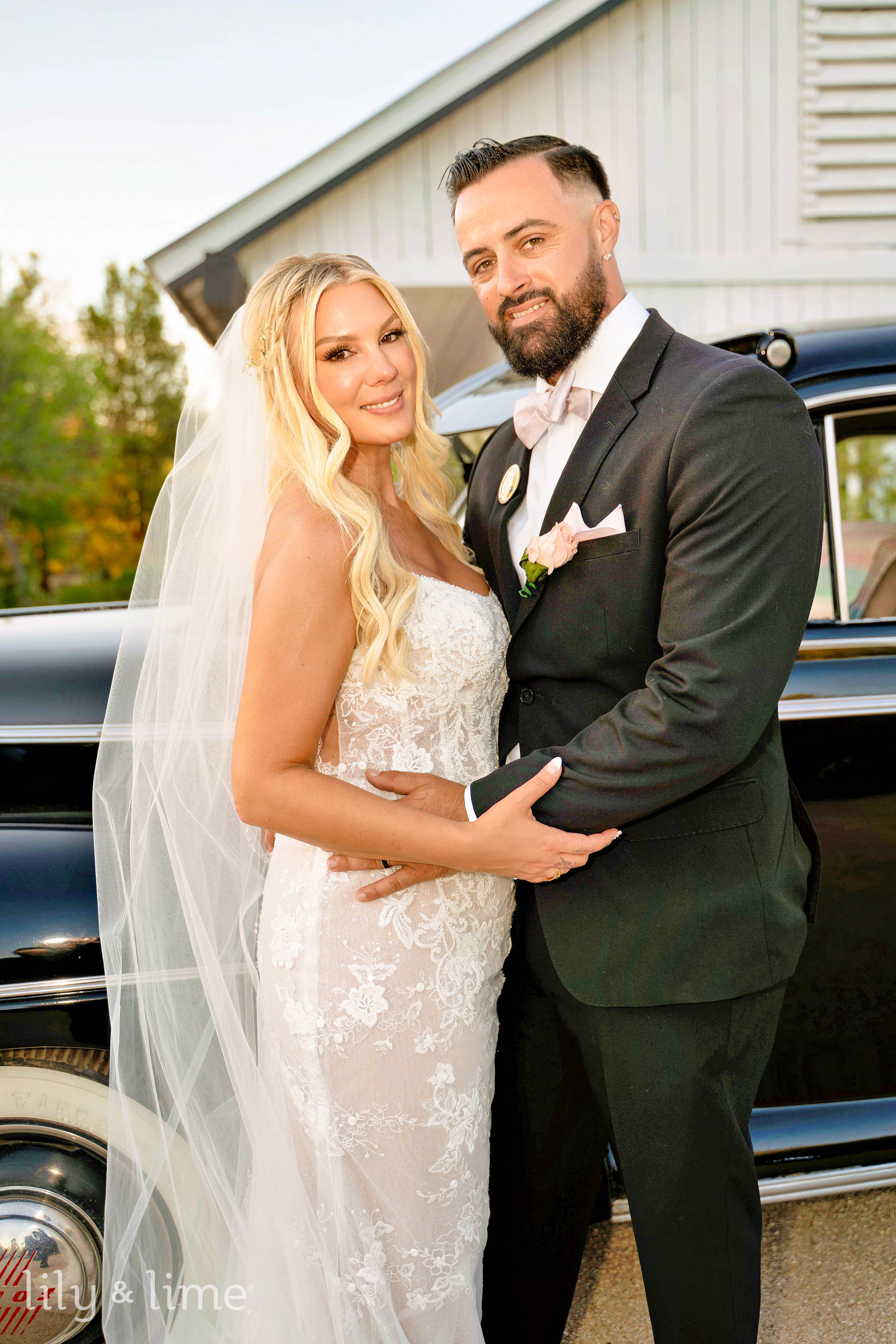 Following the ceremony, the wedding party and family gathered for group portraits amidst the picturesque venue. The black bridesmaid dresses with white wedding bouquets glowed against the rustic setting, while the groomsmen’s classic attire added a touch of timeless sophistication. Rebecca and Austin’s couple’s portraits were nothing short of cinematic, with sweeping natural landscapes and a grand limousine adding a splash of glamor and romance to their story.