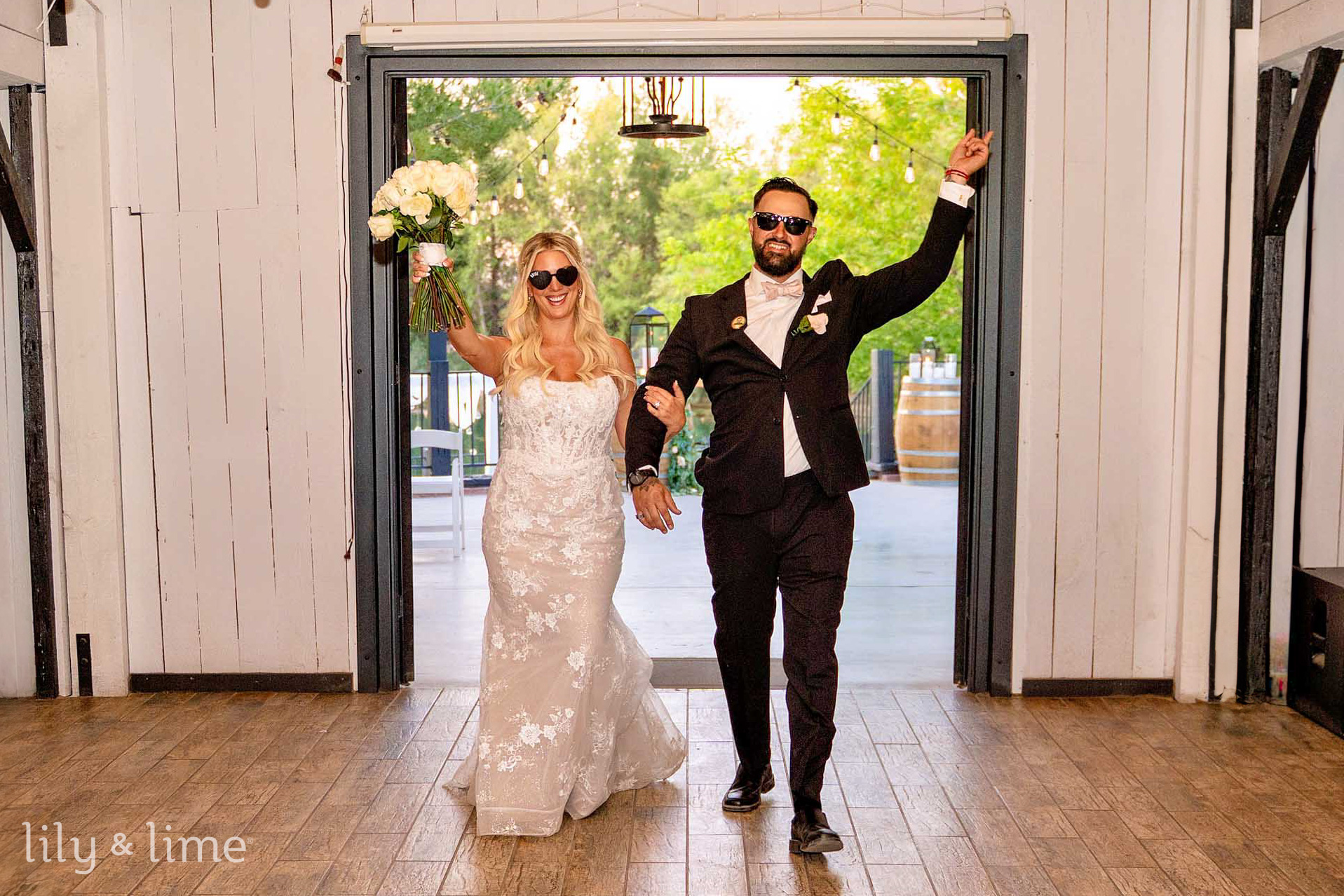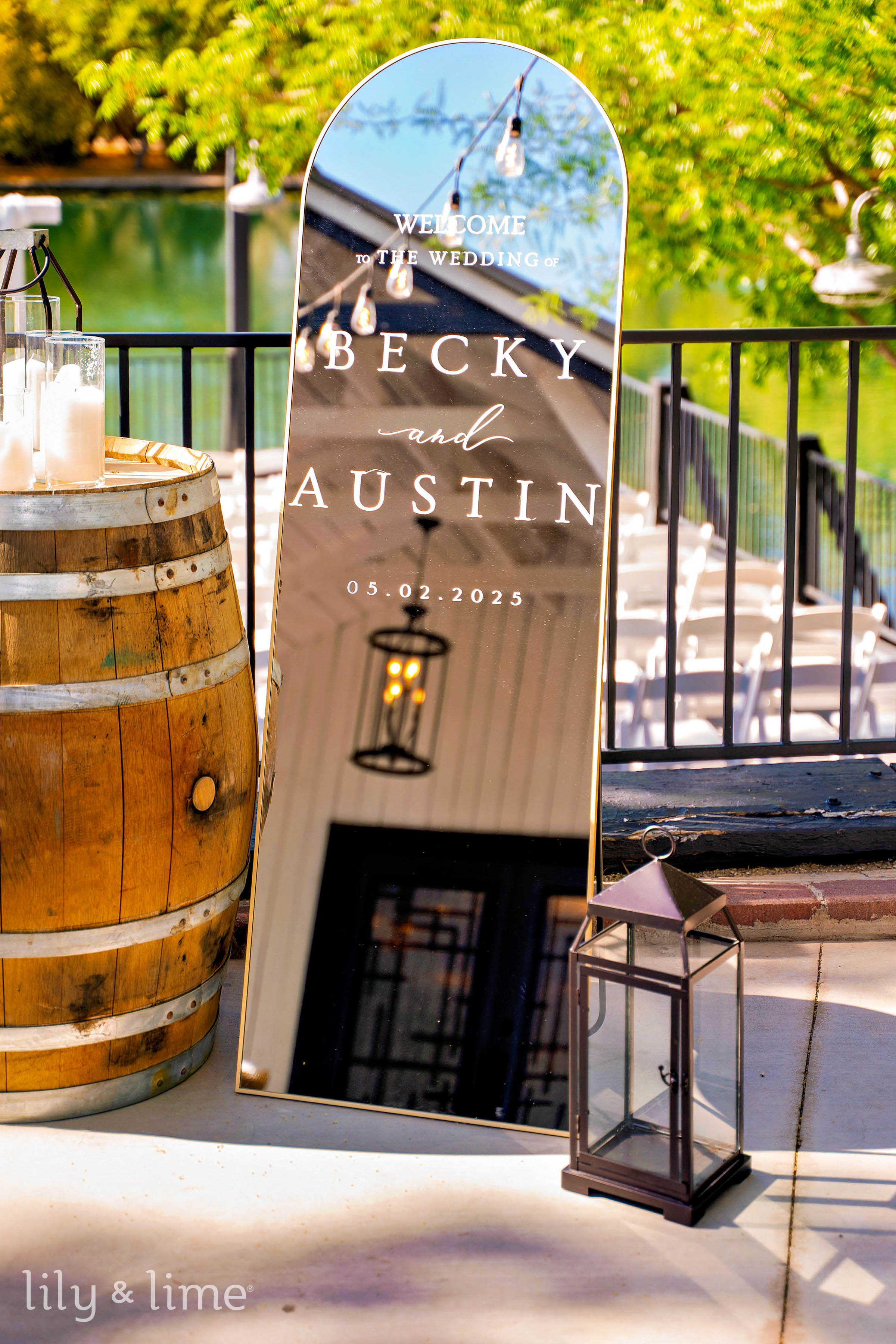 With sunny skies and serene lakeside views, the wedding ceremony was a vision of summer elegance. Rustic barrel décor adorned with candles and charming mirror signage complemented the view of the shimmering lake. Guests were greeted with thoughtful ceremony hand fans that doubled as summer wedding favors, while our Phoenix wedding photographers captured every emotional exchange between the couple and their loved ones. Each teary-eyed vow and beaming smile was immortalized in stunning photographs.