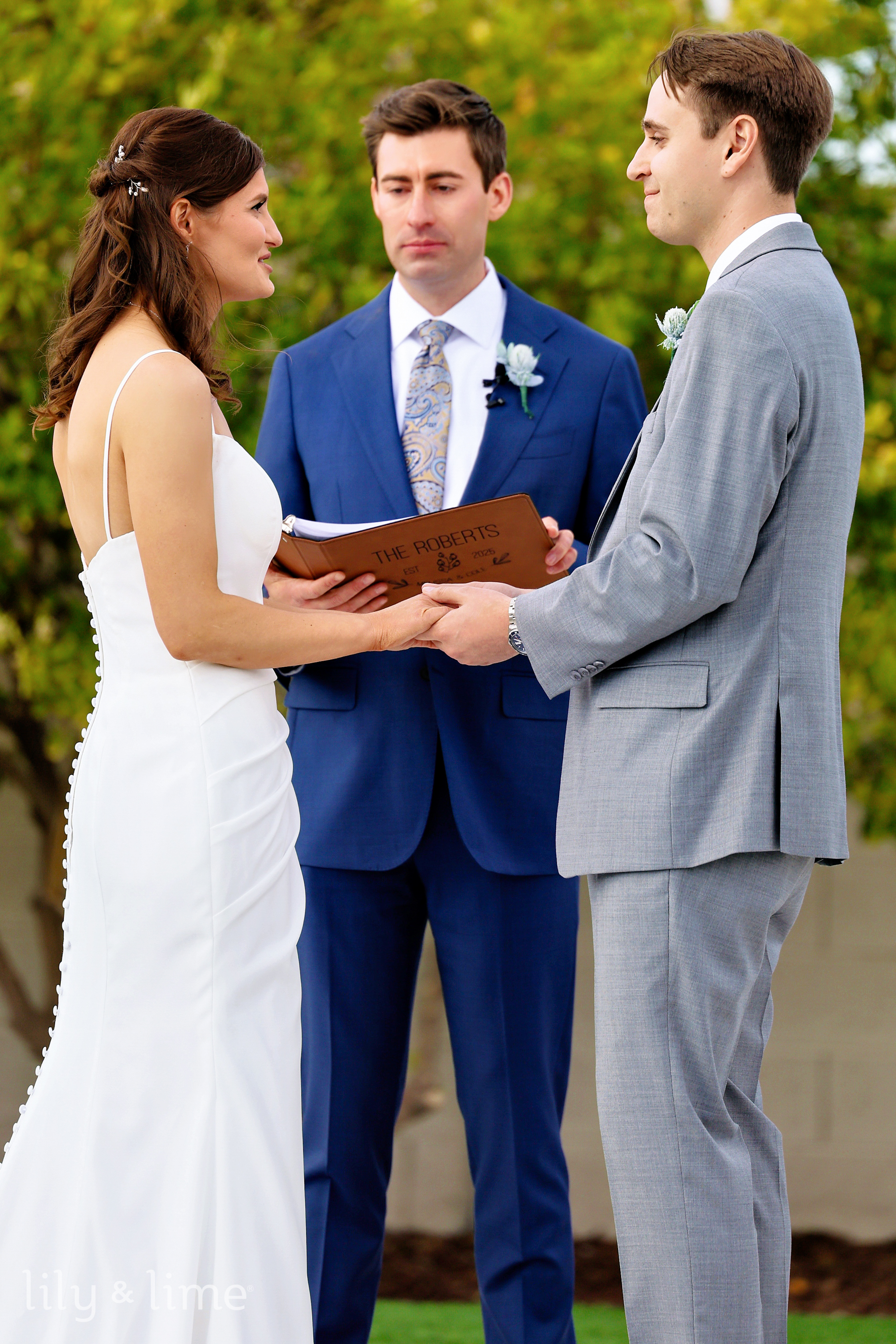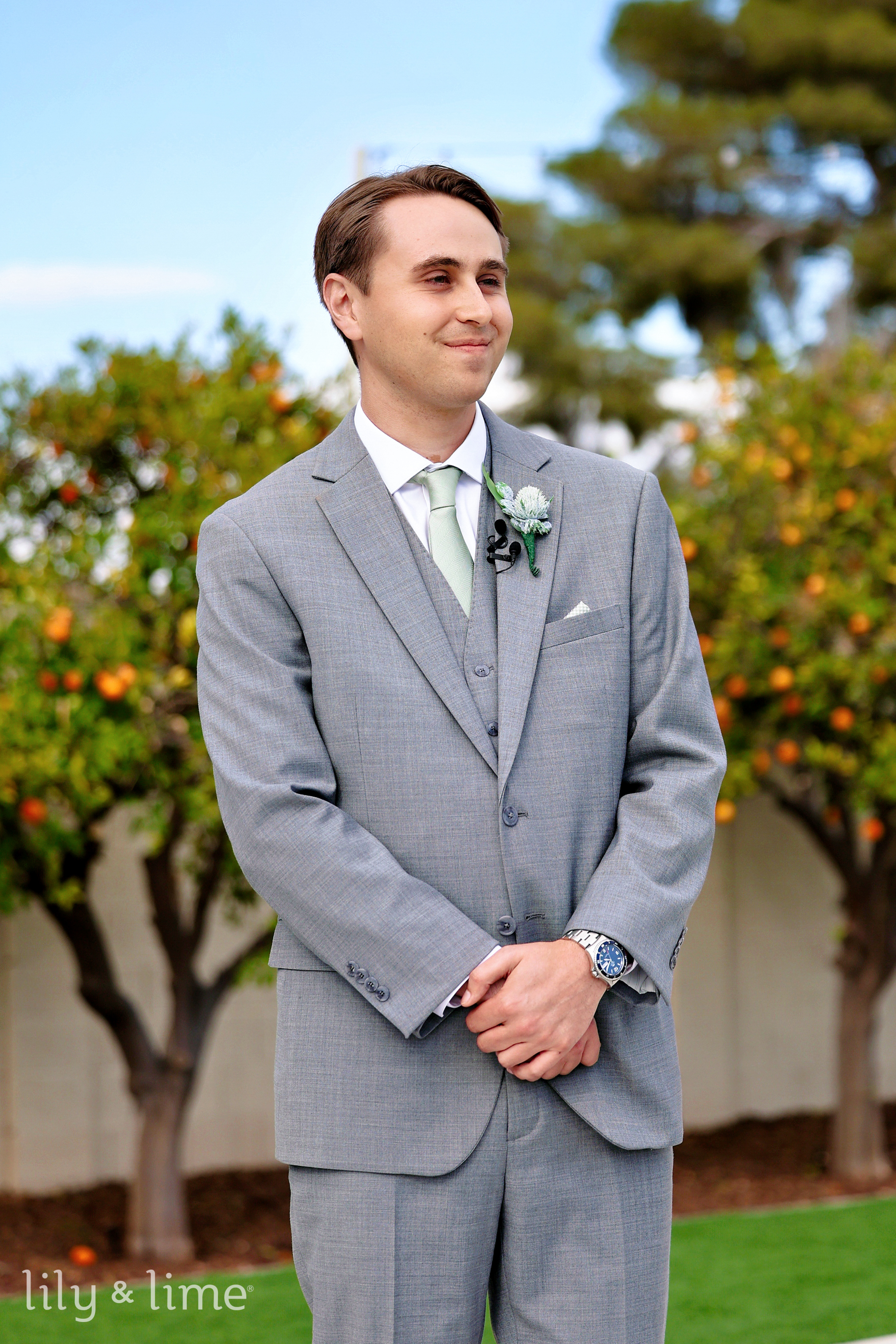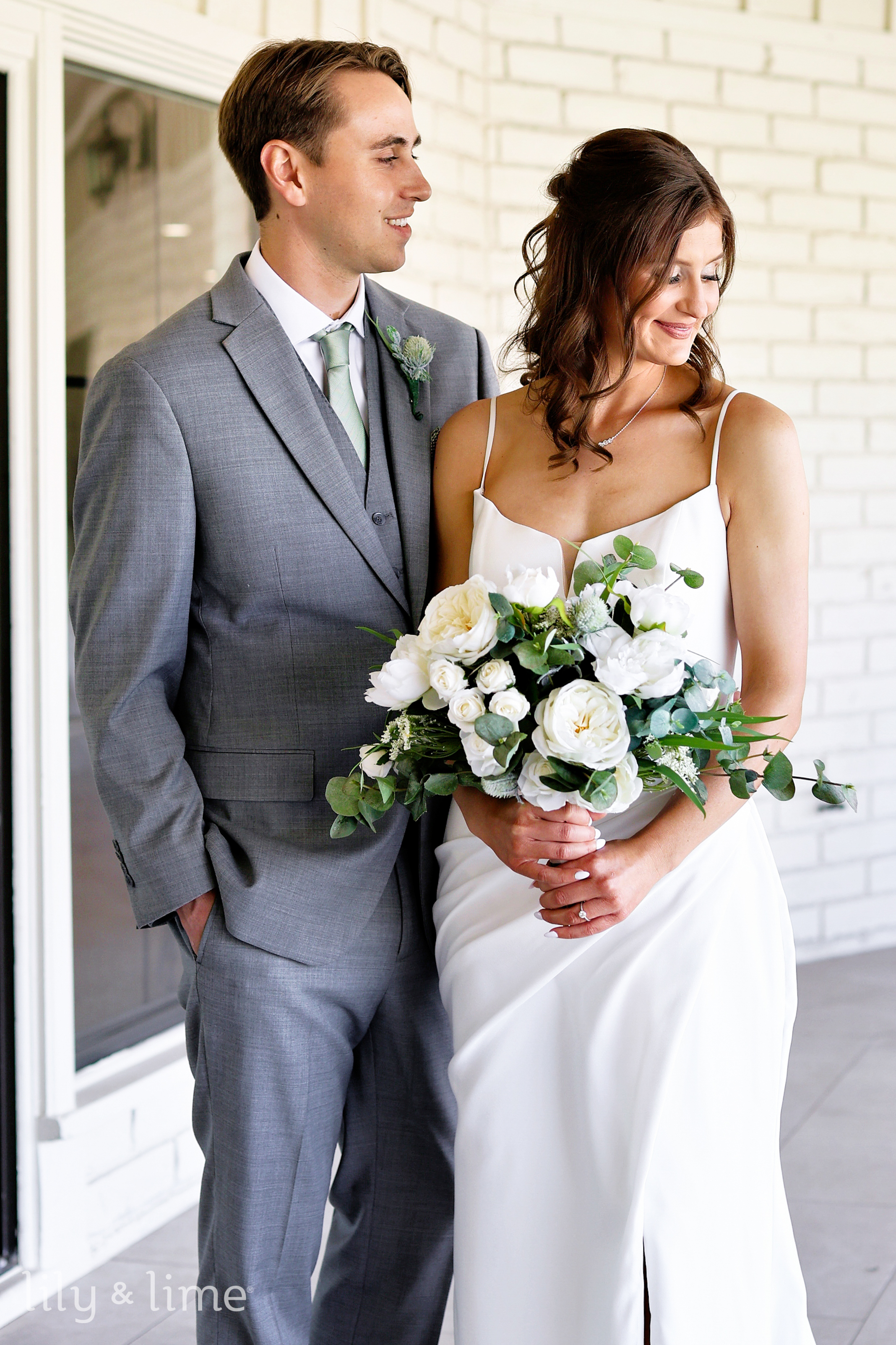 Cole looked completely dapper for his big day in a three-piece gray wedding suit paired with a crisp white formal shirt, shiny black shoes, a matching silk tie, and a white rose boutonniere. The wedding party attire complemented the couple perfectly; the women wore champagne bridesmaid dresses carrying white bouquets, while the men looked sharp in stylish black wedding suits.