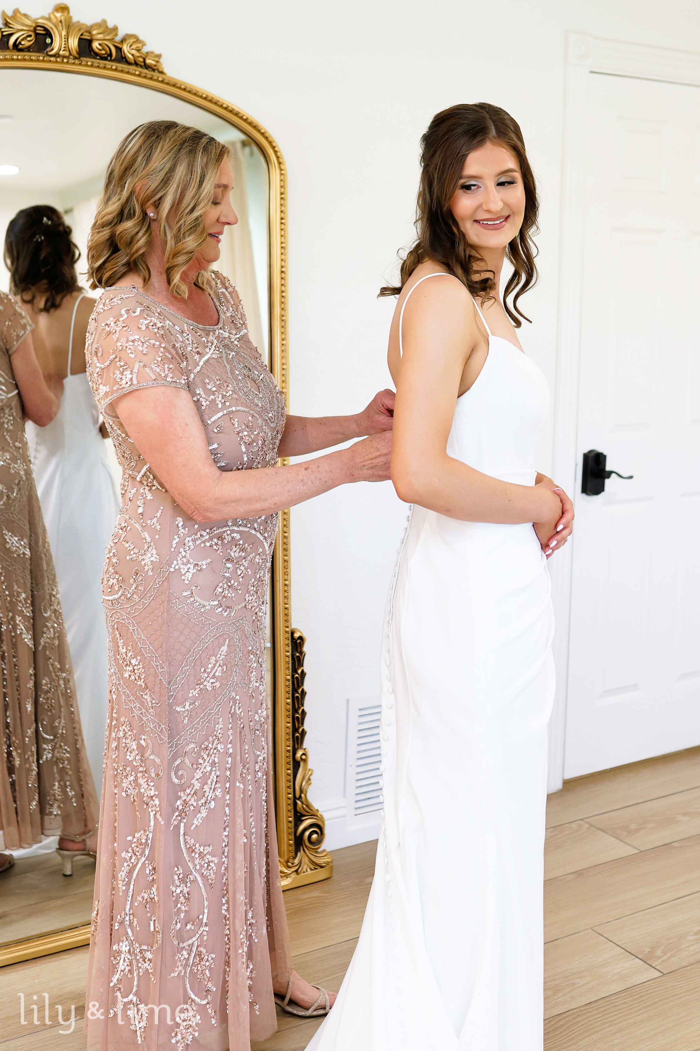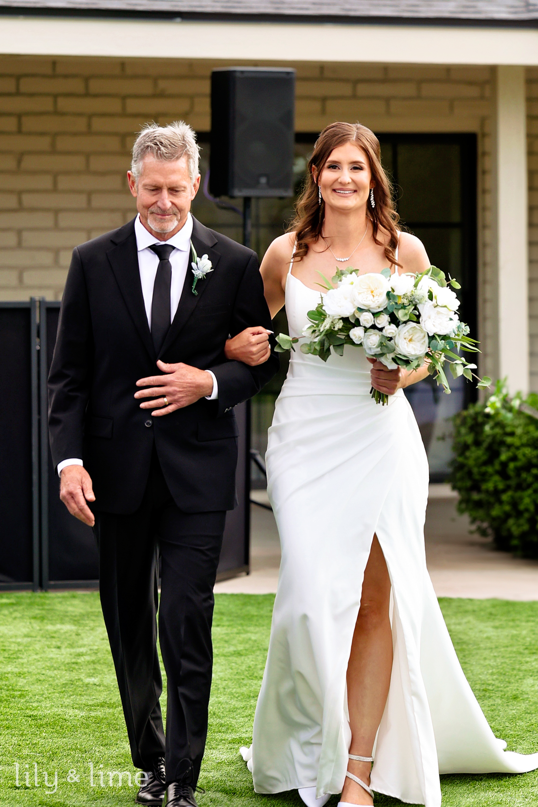 When it was time to dress, Melissa looked breathtaking in a chic and minimal slip wedding gown featuring a high slit and a delicate buttoned-down back. She completed her bridal look with an elegant open hair hairstyle, a cathedral-length veil, neutral bridal makeup, and a beautiful all-white wedding bouquet.