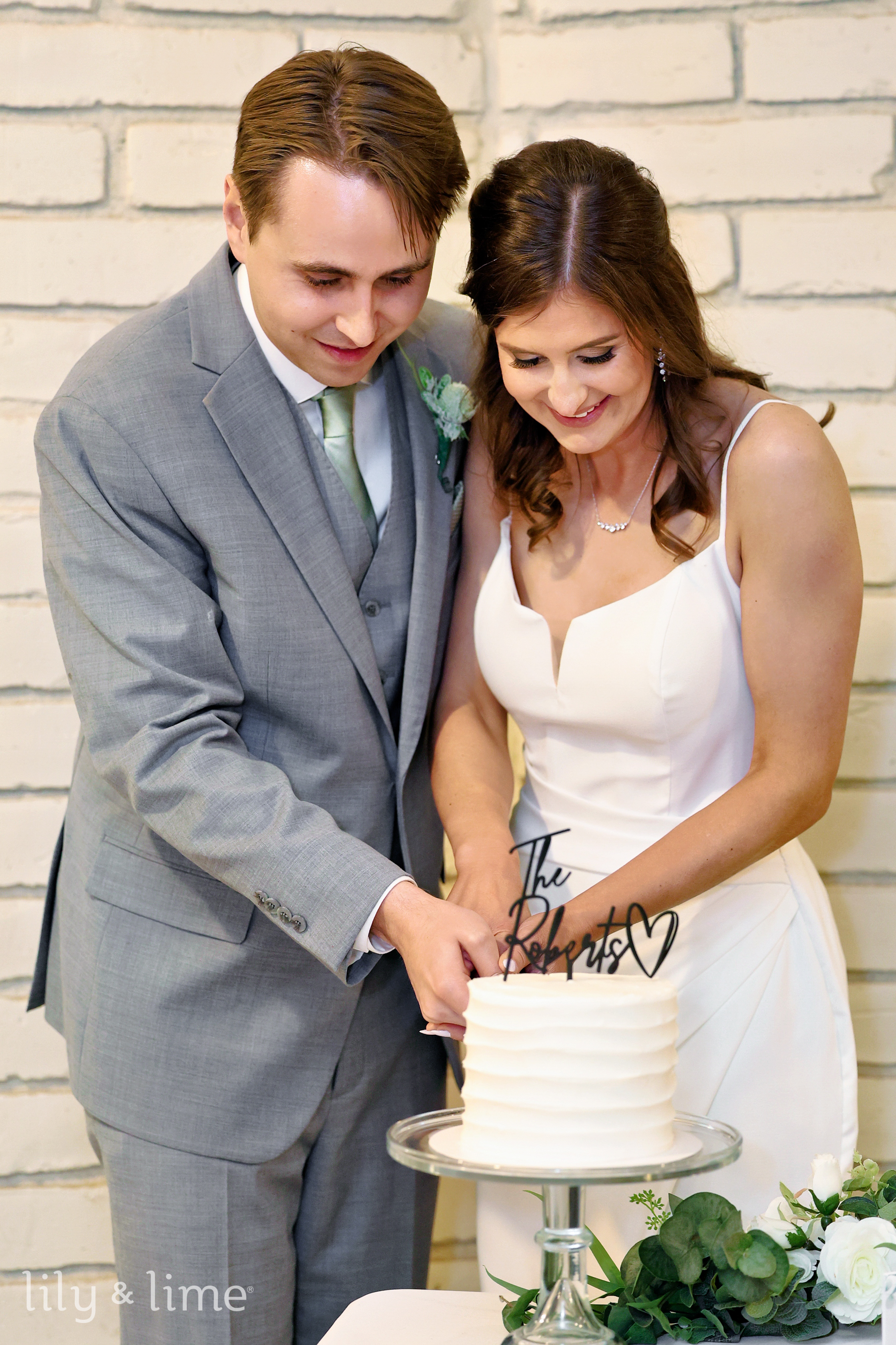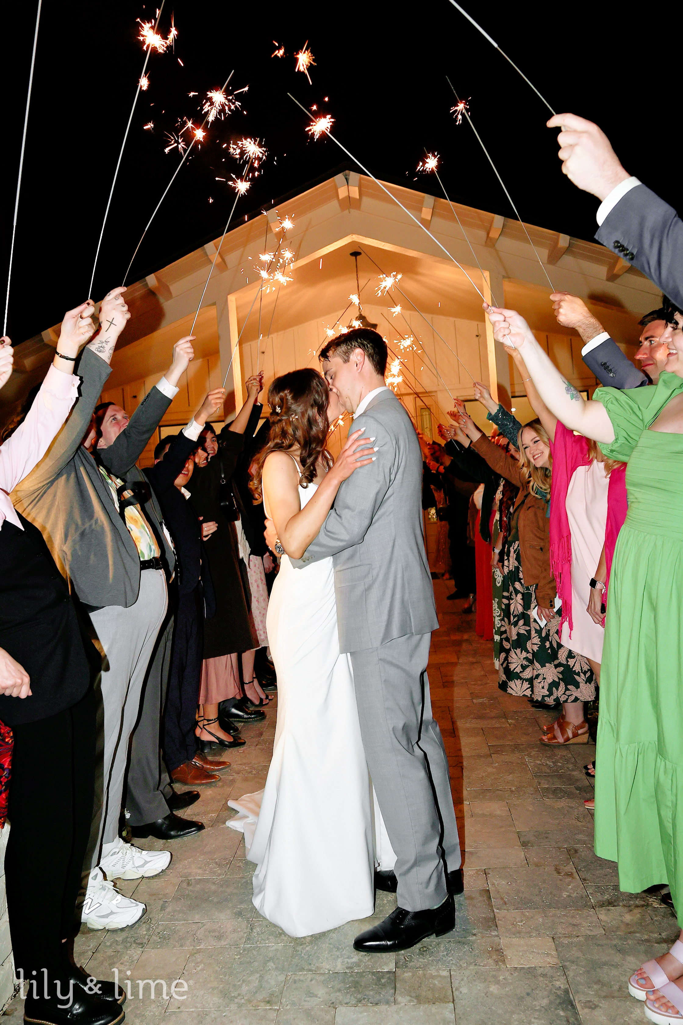 Guests marveled at the chic and small wedding cake, topped with a custom sign that read "The Roberts!" and surrounded by other delicious wedding desserts. The evening concluded with an open wedding dance floor, filled with several beautiful key wedding dance floor moments. The night ended on a high note with an iconic sparkler exit, illuminating the happy couple as they departed. This wedding was unique and beautiful, a perfect reflection of Melissa and Cole’s stylish and heartfelt love story.