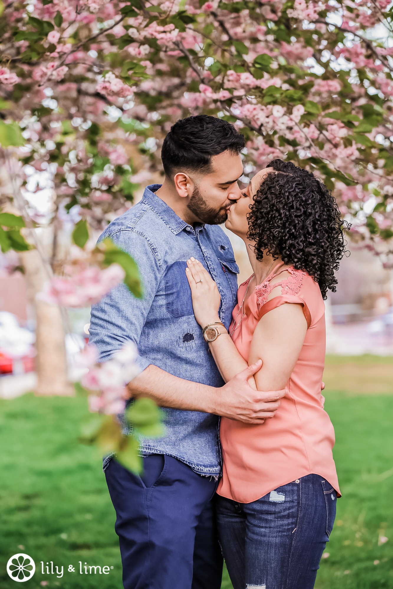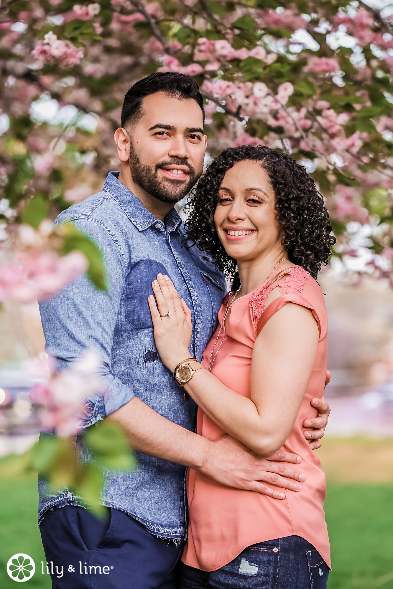 The couple chose casual attire, which matched perfectly with the setting they chose. Even the colors tied into their surroundings. We love how the blue and soft red of their shirts were mirrored in the buildings on the horizon.